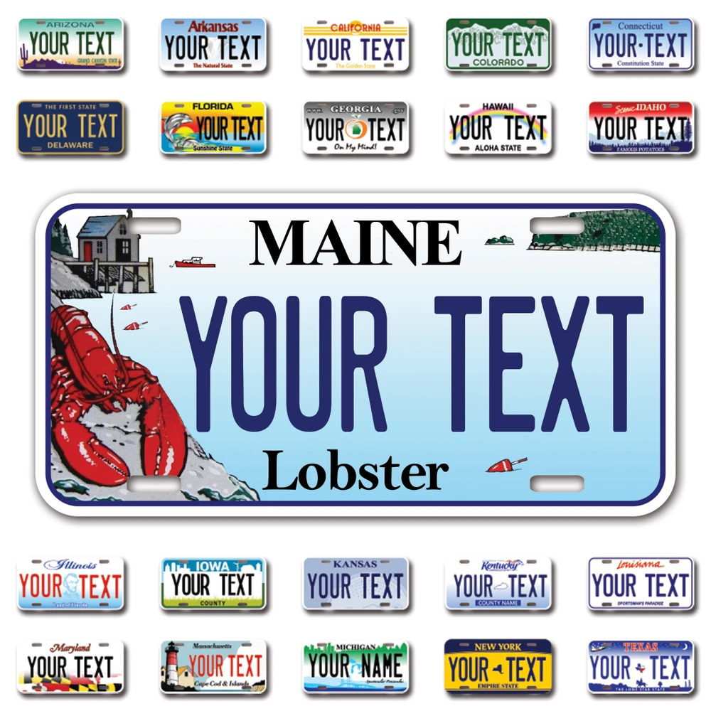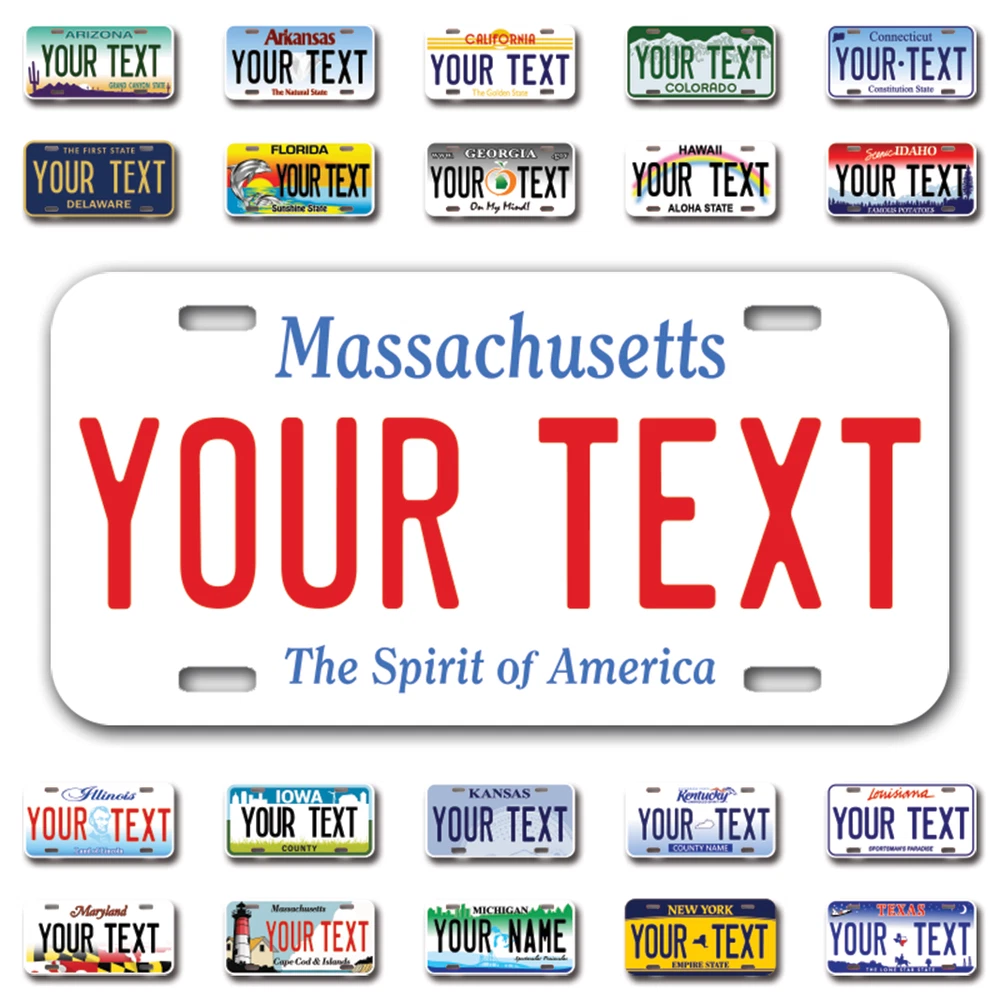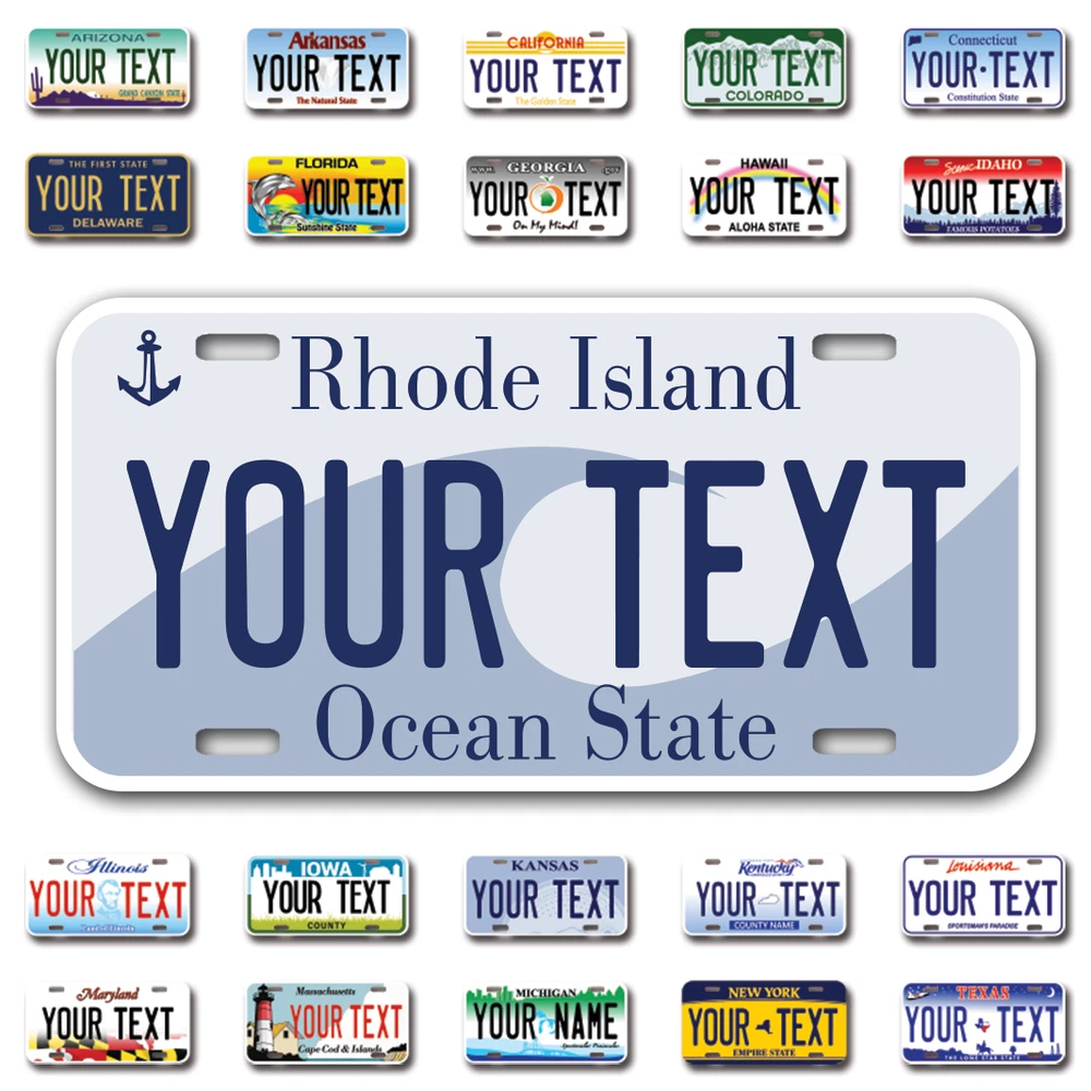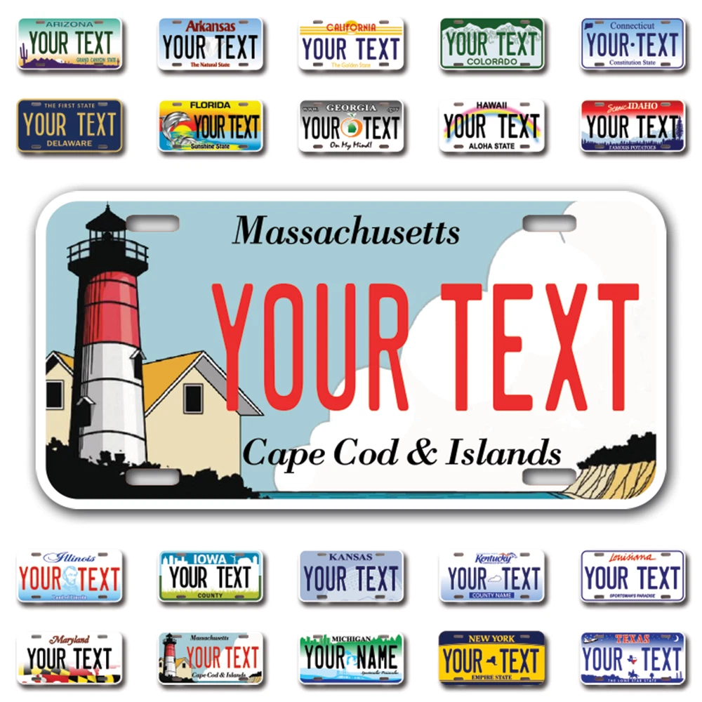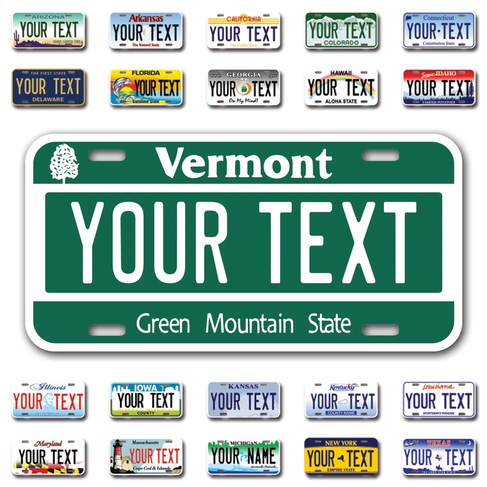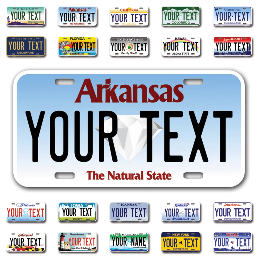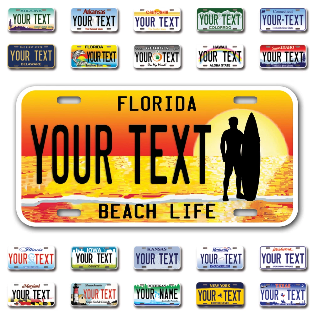 Our LICENSE plates are the most unique souvenirs from the United States, Choose between 50 states and 3 different sizes. Cannot be used in place of a state issued plate. IMPORTANT DESCRIPTION • Plates are made using High quality thick 040 rust free Aluminum. • Our plates are printed flat, not raised. The customizing is done using the latest UV Laser technique for weatherproof and high-quality finish. • 100% made in USA. • Standard car plate has four holes and can be used for trucks, motor homes, and more • M otorcycle plates have 2 holes on top for mounting and can be used on ATVS, Mopeds, Snowmobiles, wheelchairs and golf carts • B ike plates have two holes on top and can also be used for toy cars, wagons, electric toy cars, tricycles and more • Write your text in the personalization section. The text will be copied and pasted on the license plate as sent, so make sure of the spelling, punctuation, capitalization, etc. If you have any question regarding your text or you would like a preview, please let us know by adding a note or contacting Alabama | Alaska | Arizona | Arkansas | California | Colorado | Connecticut | Delaware | Florida | Georgia | Hawaii | Idaho | Illinois | Indiana | Iowa | Kansas | Kentucky | Louisiana | Maine | Maryland | Massachusetts | Michigan | Minnesota | Mississippi | Missouri | Montana | Nebraska | Nevada | New Hampshire | New Jersey | New Mexico | New York | North Carolina | North Dakota | Ohio | Oklahoma | Oregon | Pennsylvania | Puerto Rico | Rhode Island | South Carolina | South Dakota | Tennessee | Texas | Utah | Vermont | Virginia | Washington | West Virginia | Wisconsin | Wyoming