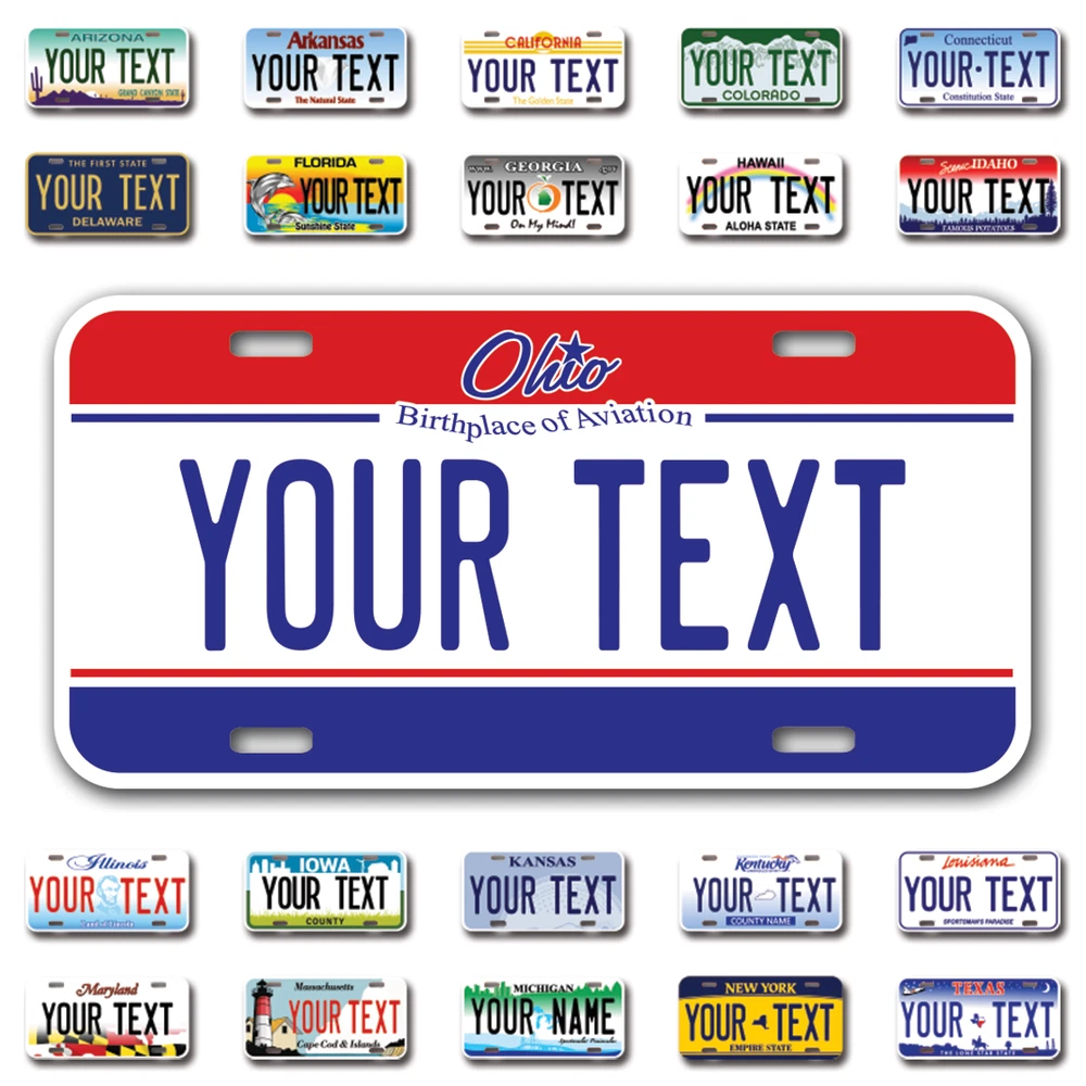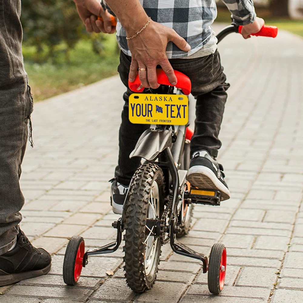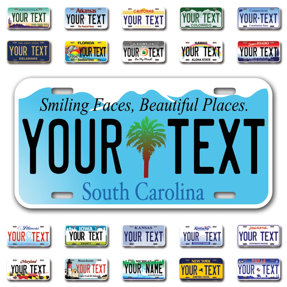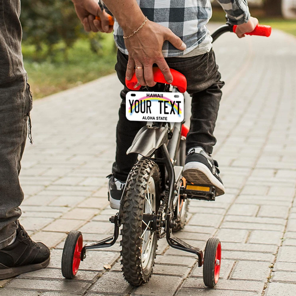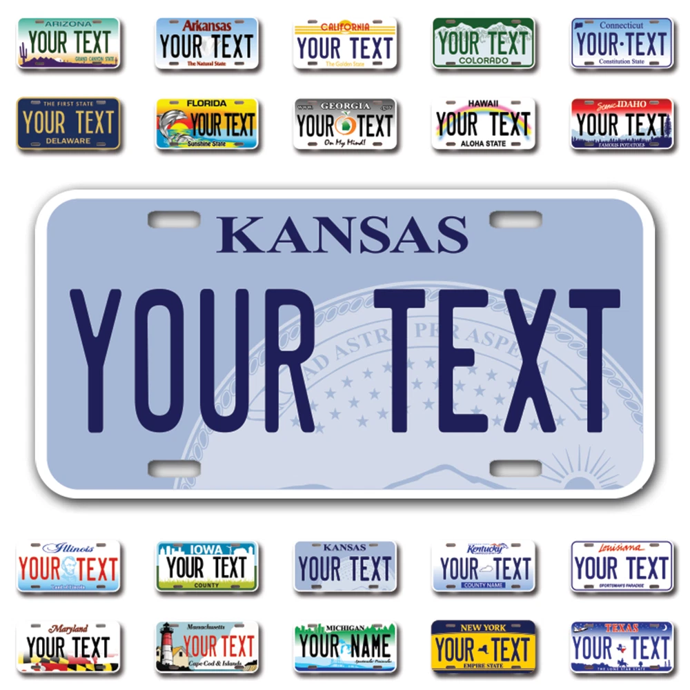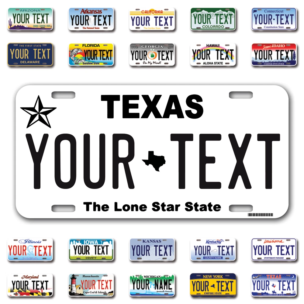 Our LICENSE plates are the most unique souvenirs from the United States, Choose between 50 states and 3 different sizes. Cannot be used in place of a state issued plate. IMPORTANT DESCRIPTION • Plates are made using High quality thick 040 rust free Aluminum. • Our plates are printed flat, not raised. The customizing is done using the latest UV Laser technique for weatherproof and high-quality finish. • 100% made in USA. • Standard car plate has four holes and can be used for trucks, motor homes, and more • M otorcycle plates have 2 holes on top for mounting and can be used on ATVS, Mopeds, Snowmobiles, wheelchairs and golf carts • B ike plates have two holes on top and can also be used for toy cars, wagons, electric toy cars, tricycles and more • Write your text in the personalization section. The text will be copied and pasted on the license plate as sent, so make sure of the spelling, punctuation, capitalization, etc. If you have any question regarding your text or you would like a preview, please let us know by adding a note or contacting Alabama | Alaska | Arizona | Arkansas | California | Colorado | Connecticut | Delaware | Florida | Georgia | Hawaii | Idaho | Illinois | Indiana | Iowa | Kansas | Kentucky | Louisiana | Maine | Maryland | Massachusetts | Michigan | Minnesota | Mississippi | Missouri | Montana | Nebraska | Nevada | New Hampshire | New Jersey | New Mexico | New York | North Carolina | North Dakota | Ohio | Oklahoma | Oregon | Pennsylvania | Puerto Rico | Rhode Island | South Carolina | South Dakota | Tennessee | Texas | Utah | Vermont | Virginia | Washington | West Virginia | Wisconsin | Wyoming