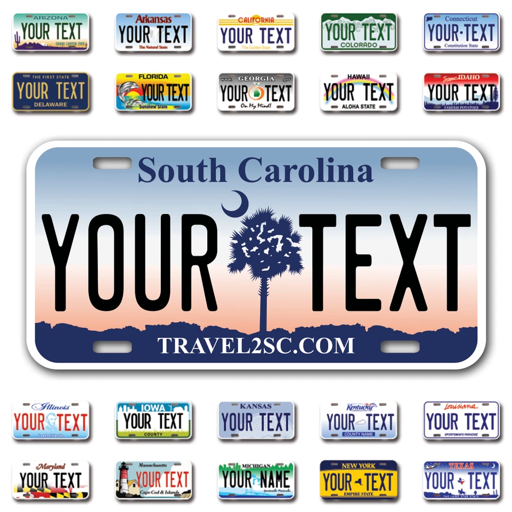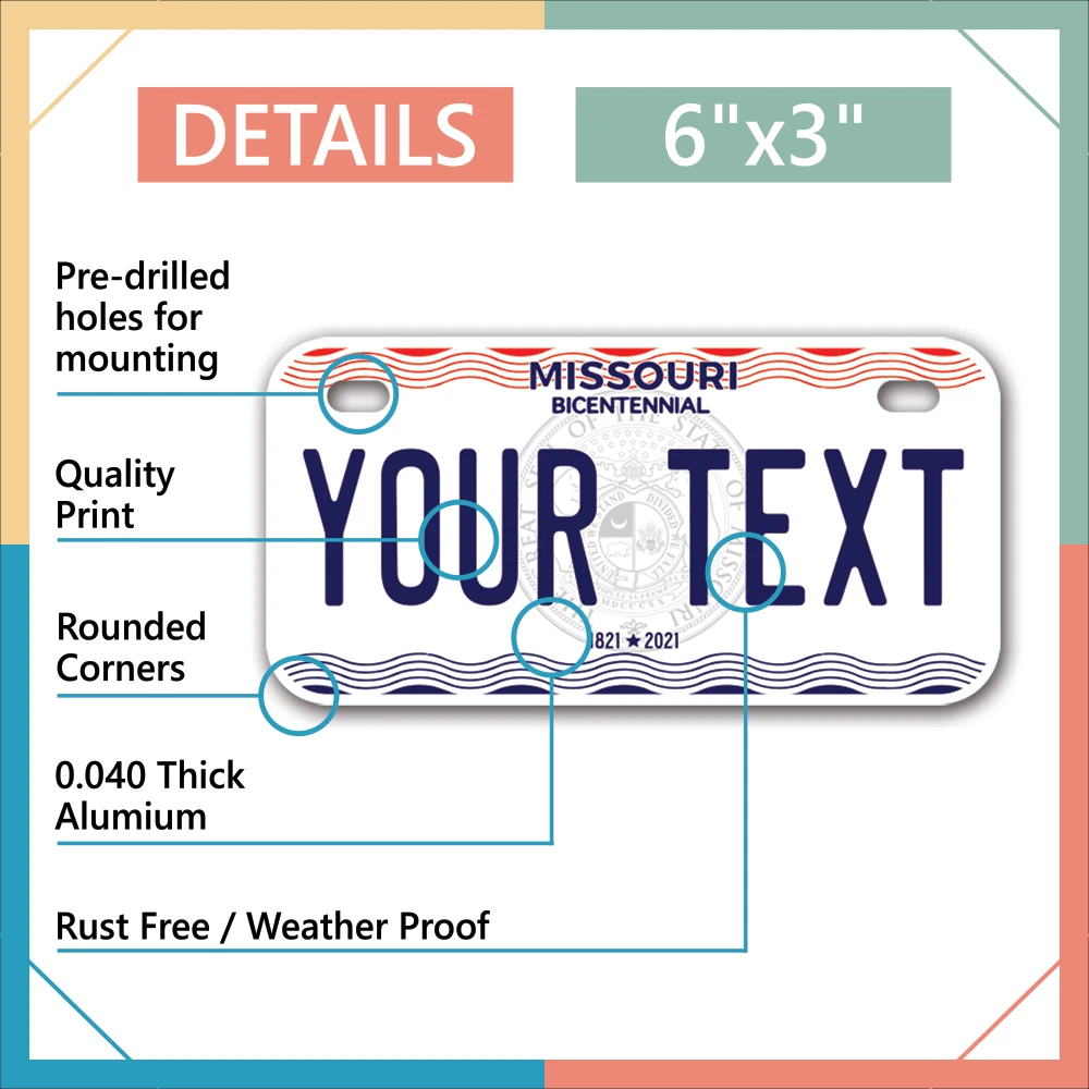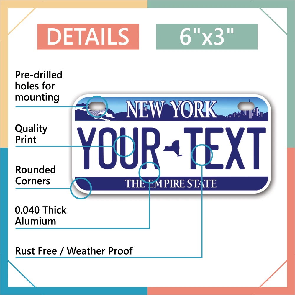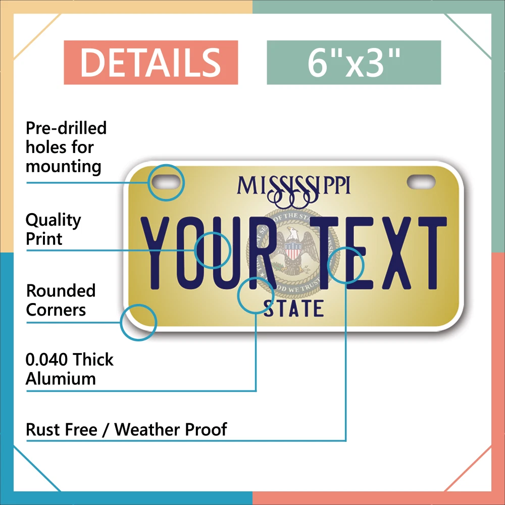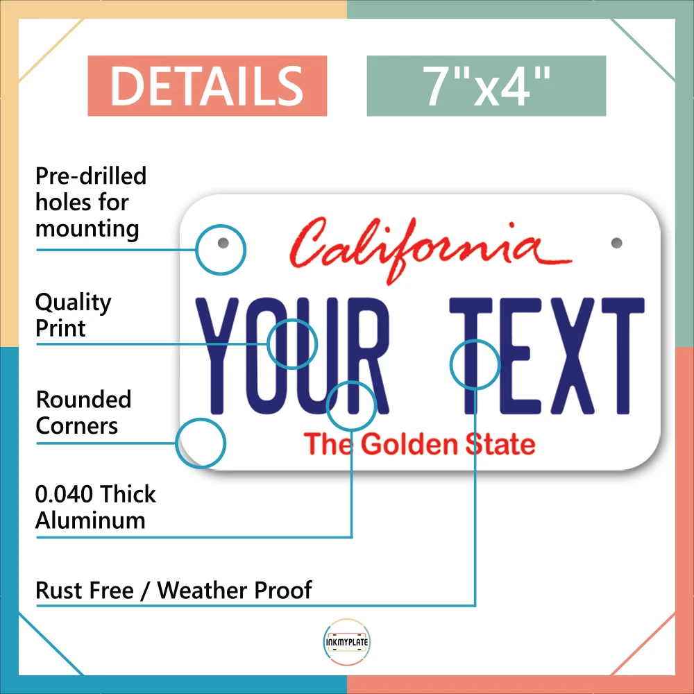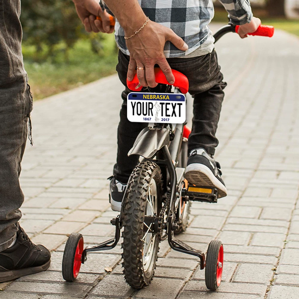Our LICENSE plates are the most unique souvenirs from the United States, Choose between 50 states and 3 different sizes. Cannot be used in place of a state issued plate. IMPORTANT DESCRIPTION • Plates are made using High quality thick 040 rust free Aluminum. • Our plates are printed flat, not raised. The customizing is done using the latest UV Laser technique for weatherproof and high-quality finish. • 100% made in USA. • Standard car plate has four holes and can be used for trucks, motor homes, and more • M otorcycle plates have 2 holes on top for mounting and can be used on ATVS, Mopeds, Snowmobiles, wheelchairs and golf carts • B ike plates have two holes on top and can also be used for toy cars, wagons, electric toy cars, tricycles and more • Write your text in the personalization section. The text will be copied and pasted on the license plate as sent, so make sure of the spelling, punctuation, capitalization, etc. If you have any question regarding your text or you would like a preview, please let us know by adding a note or contacting Alabama | Alaska | Arizona | Arkansas | California | Colorado | Connecticut | Delaware | Florida | Georgia | Hawaii | Idaho | Illinois | Indiana | Iowa | Kansas | Kentucky | Louisiana | Maine | Maryland | Massachusetts | Michigan | Minnesota | Mississippi | Missouri | Montana | Nebraska | Nevada | New Hampshire | New Jersey | New Mexico | New York | North Carolina | North Dakota | Ohio | Oklahoma | Oregon | Pennsylvania | Puerto Rico | Rhode Island | South Carolina | South Dakota | Tennessee | Texas | Utah | Vermont | Virginia | Washington | West Virginia | Wisconsin | Wyoming