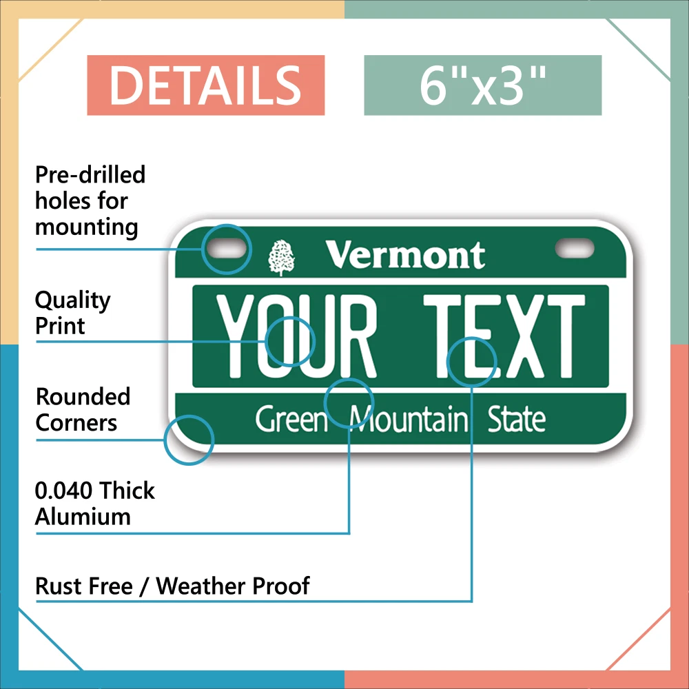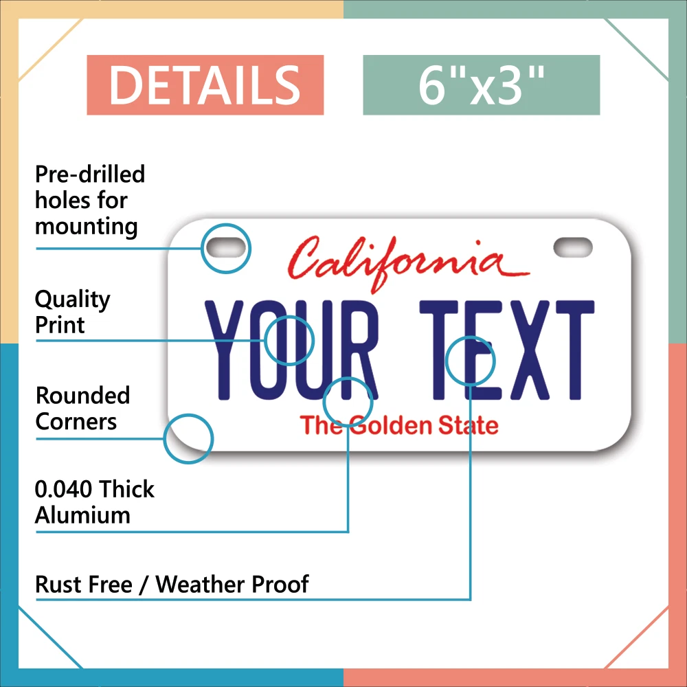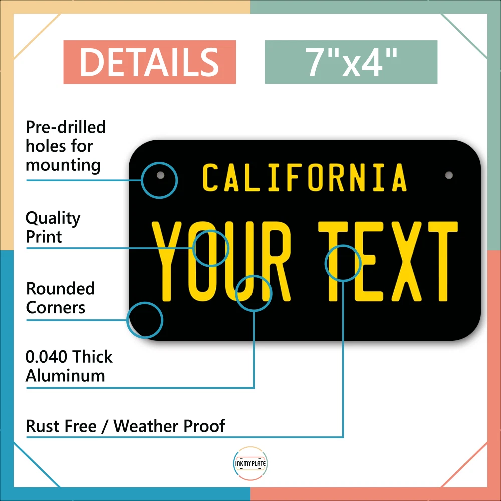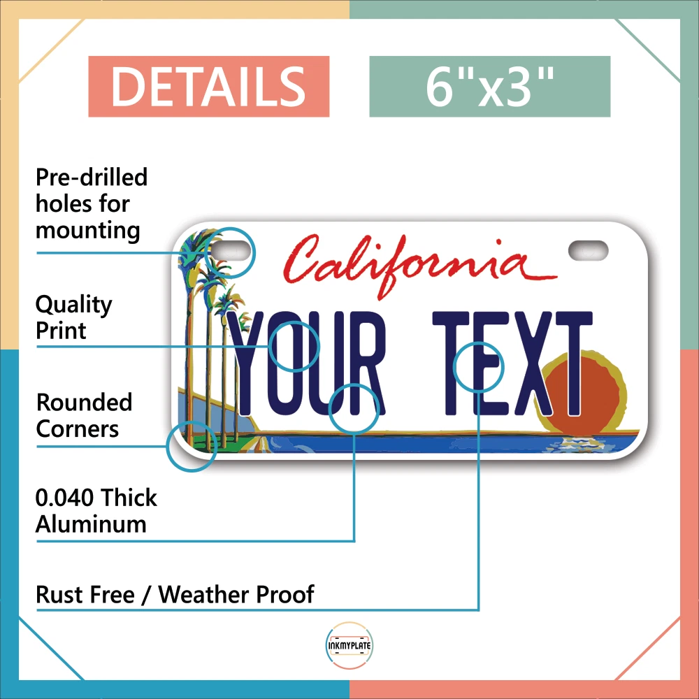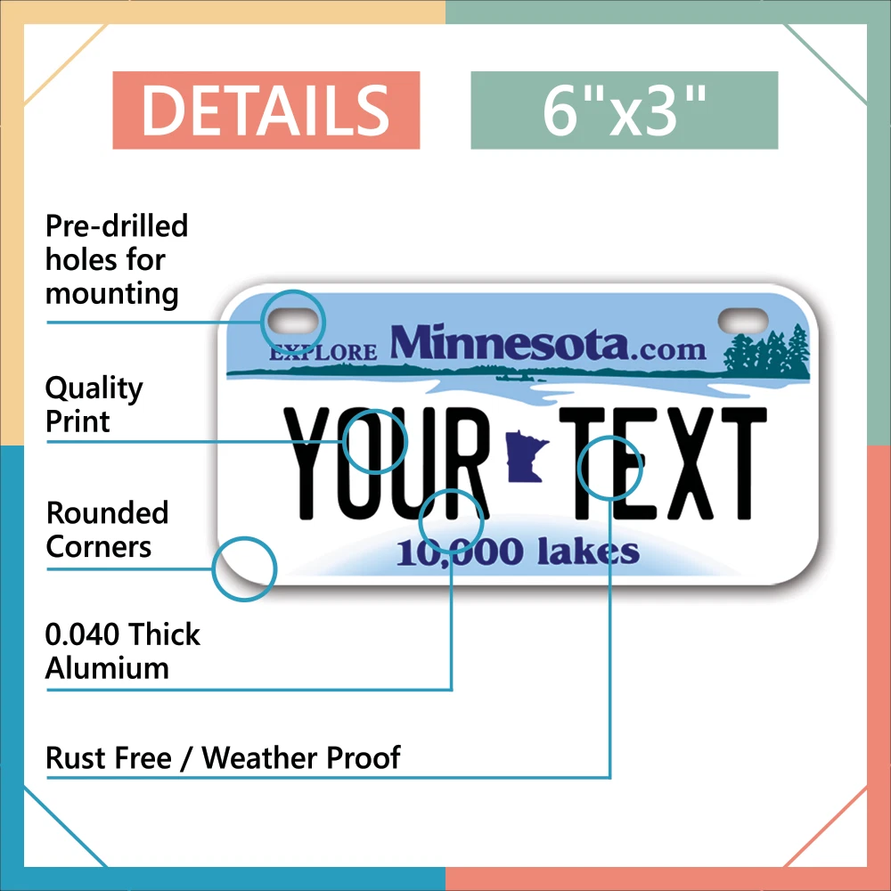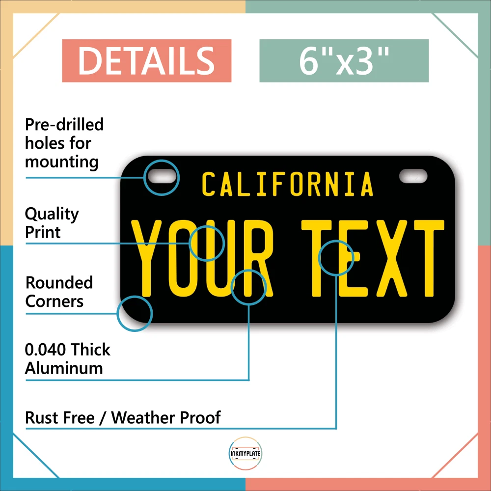 Our LICENSE plates are the most unique souvenirs from the United States, Choose between 50 states and 3 different sizes. Cannot be used in place of a state issued plate. IMPORTANT DESCRIPTION • Plates are made using High quality thick 040 rust free Aluminum. • Our plates are printed flat, not raised. The customizing is done using the latest UV Laser technique for weatherproof and high-quality finish. • 100% made in USA. • Standard car plate has four holes and can be used for trucks, motor homes, and more • M otorcycle plates have 2 holes on top for mounting and can be used on ATVS, Mopeds, Snowmobiles, wheelchairs and golf carts • B ike plates have two holes on top and can also be used for toy cars, wagons, electric toy cars, tricycles and more • Write your text in the personalization section. The text will be copied and pasted on the license plate as sent, so make sure of the spelling, punctuation, capitalization, etc. If you have any question regarding your text or you would like a preview, please let us know by adding a note or contacting Alabama | Alaska | Arizona | Arkansas | California | Colorado | Connecticut | Delaware | Florida | Georgia | Hawaii | Idaho | Illinois | Indiana | Iowa | Kansas | Kentucky | Louisiana | Maine | Maryland | Massachusetts | Michigan | Minnesota | Mississippi | Missouri | Montana | Nebraska | Nevada | New Hampshire | New Jersey | New Mexico | New York | North Carolina | North Dakota | Ohio | Oklahoma | Oregon | Pennsylvania | Puerto Rico | Rhode Island | South Carolina | South Dakota | Tennessee | Texas | Utah | Vermont | Virginia | Washington | West Virginia | Wisconsin | Wyoming