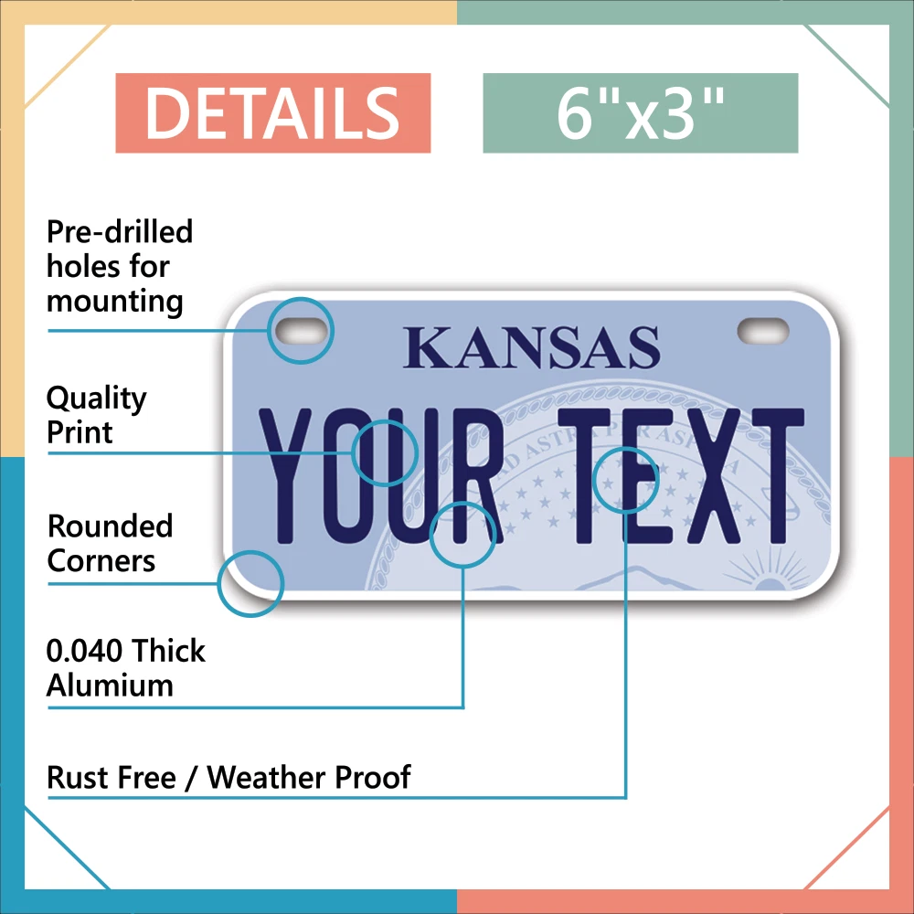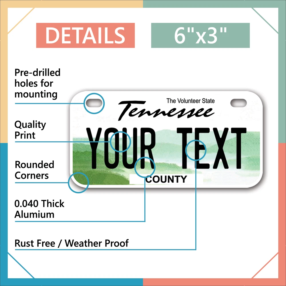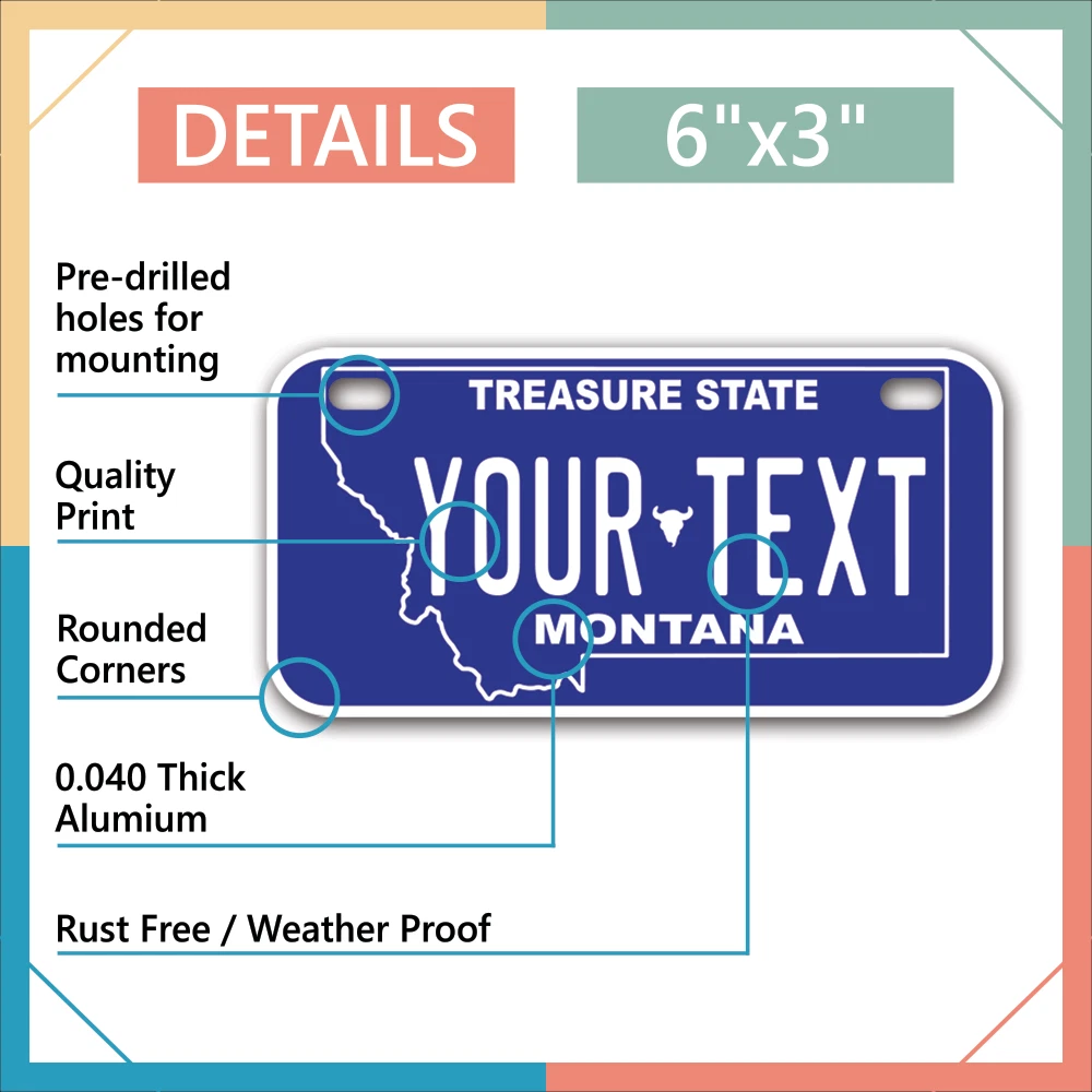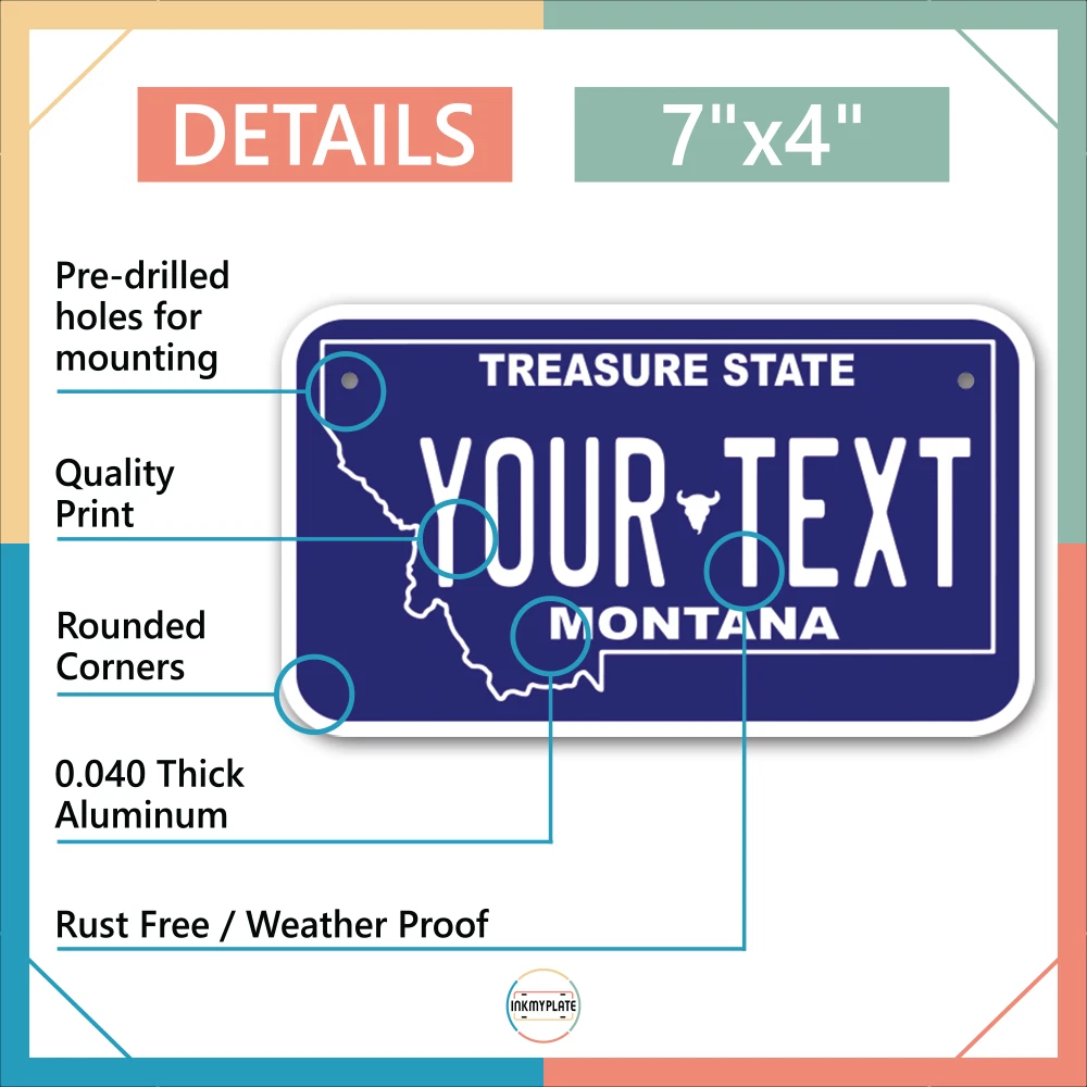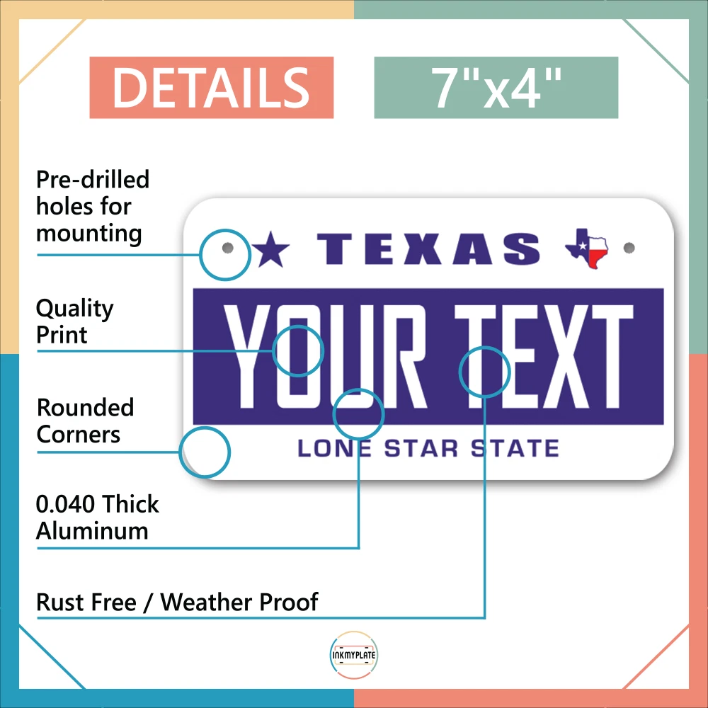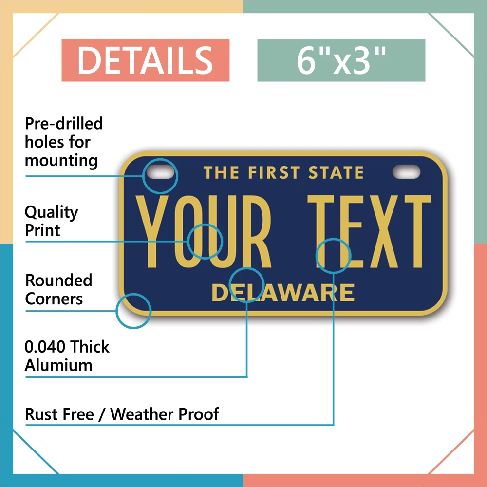 Our LICENSE plates are the most unique souvenirs from the United States, Choose between 50 states and 3 different sizes. Cannot be used in place of a state issued plate. IMPORTANT DESCRIPTION • Plates are made using High quality thick 040 rust free Aluminum. • Our plates are printed flat, not raised. The customizing is done using the latest UV Laser technique for weatherproof and high-quality finish. • 100% made in USA. • Standard car plate has four holes and can be used for trucks, motor homes, and more • M otorcycle plates have 2 holes on top for mounting and can be used on ATVS, Mopeds, Snowmobiles, wheelchairs and golf carts • B ike plates have two holes on top and can also be used for toy cars, wagons, electric toy cars, tricycles and more • Write your text in the personalization section. The text will be copied and pasted on the license plate as sent, so make sure of the spelling, punctuation, capitalization, etc. If you have any question regarding your text or you would like a preview, please let us know by adding a note or contacting Alabama | Alaska | Arizona | Arkansas | California | Colorado | Connecticut | Delaware | Florida | Georgia | Hawaii | Idaho | Illinois | Indiana | Iowa | Kansas | Kentucky | Louisiana | Maine | Maryland | Massachusetts | Michigan | Minnesota | Mississippi | Missouri | Montana | Nebraska | Nevada | New Hampshire | New Jersey | New Mexico | New York | North Carolina | North Dakota | Ohio | Oklahoma | Oregon | Pennsylvania | Puerto Rico | Rhode Island | South Carolina | South Dakota | Tennessee | Texas | Utah | Vermont | Virginia | Washington | West Virginia | Wisconsin | Wyoming