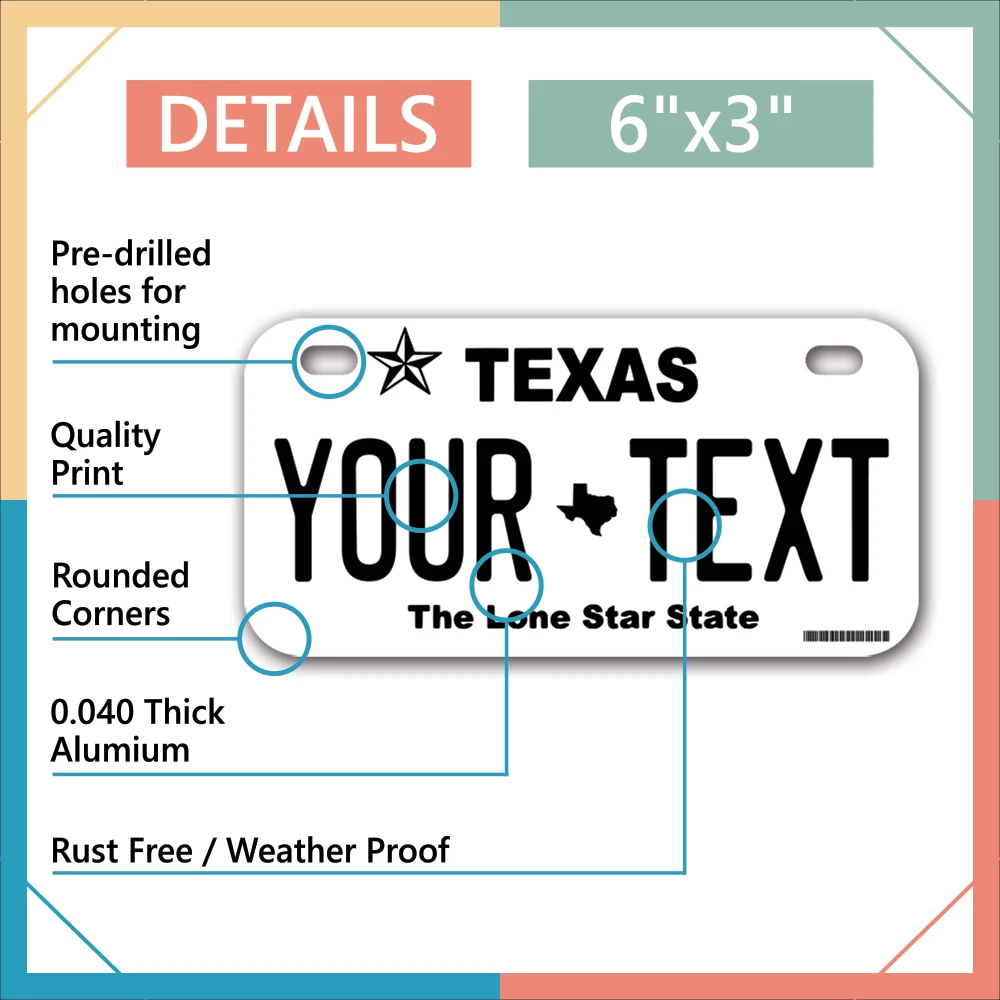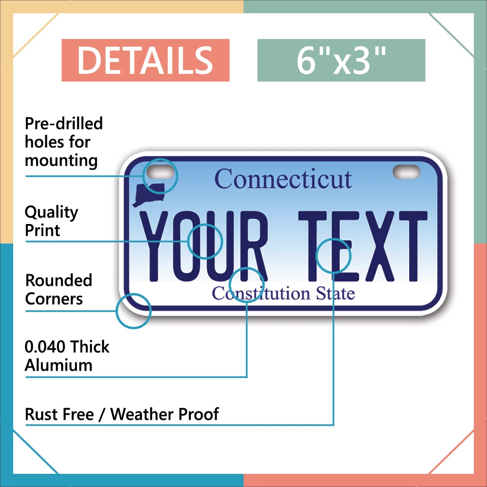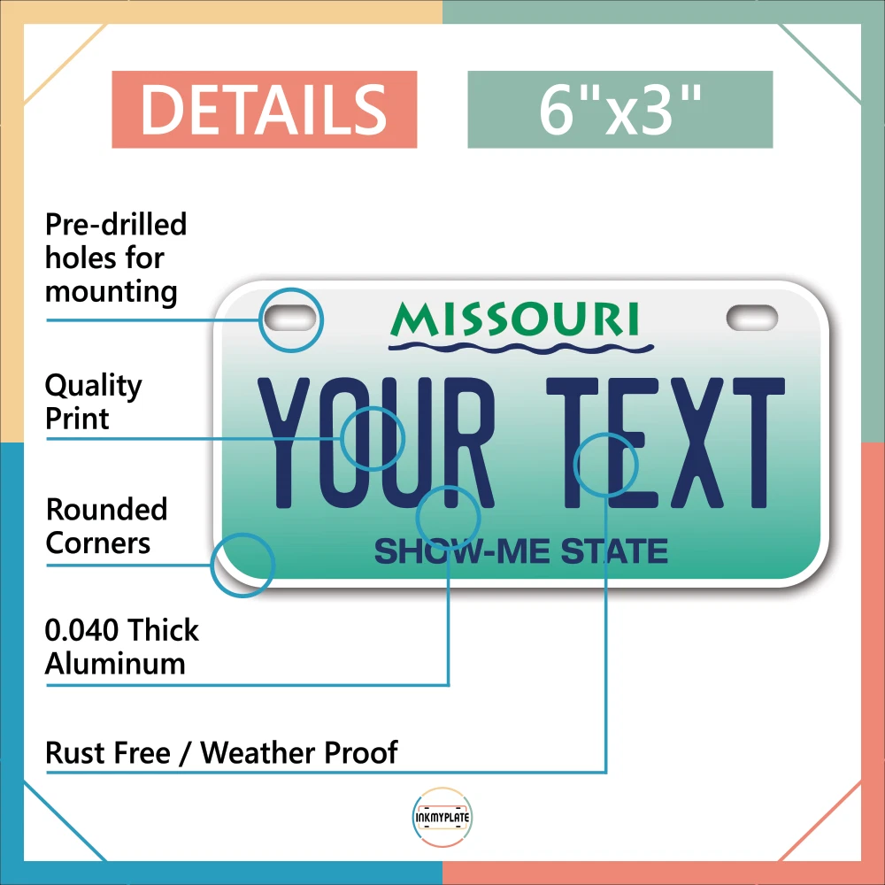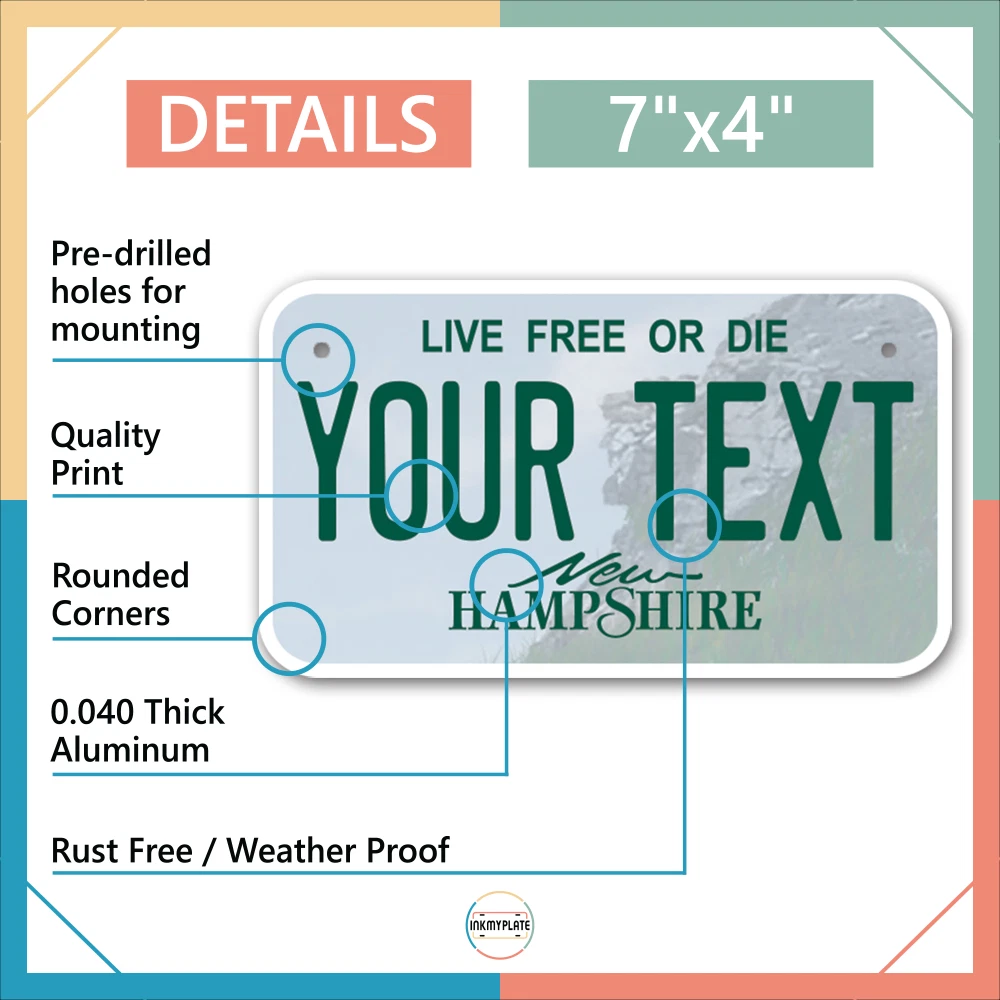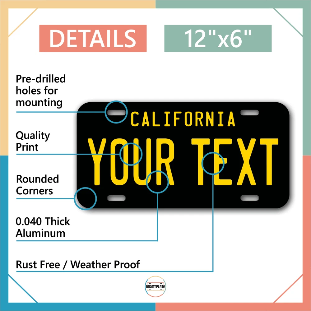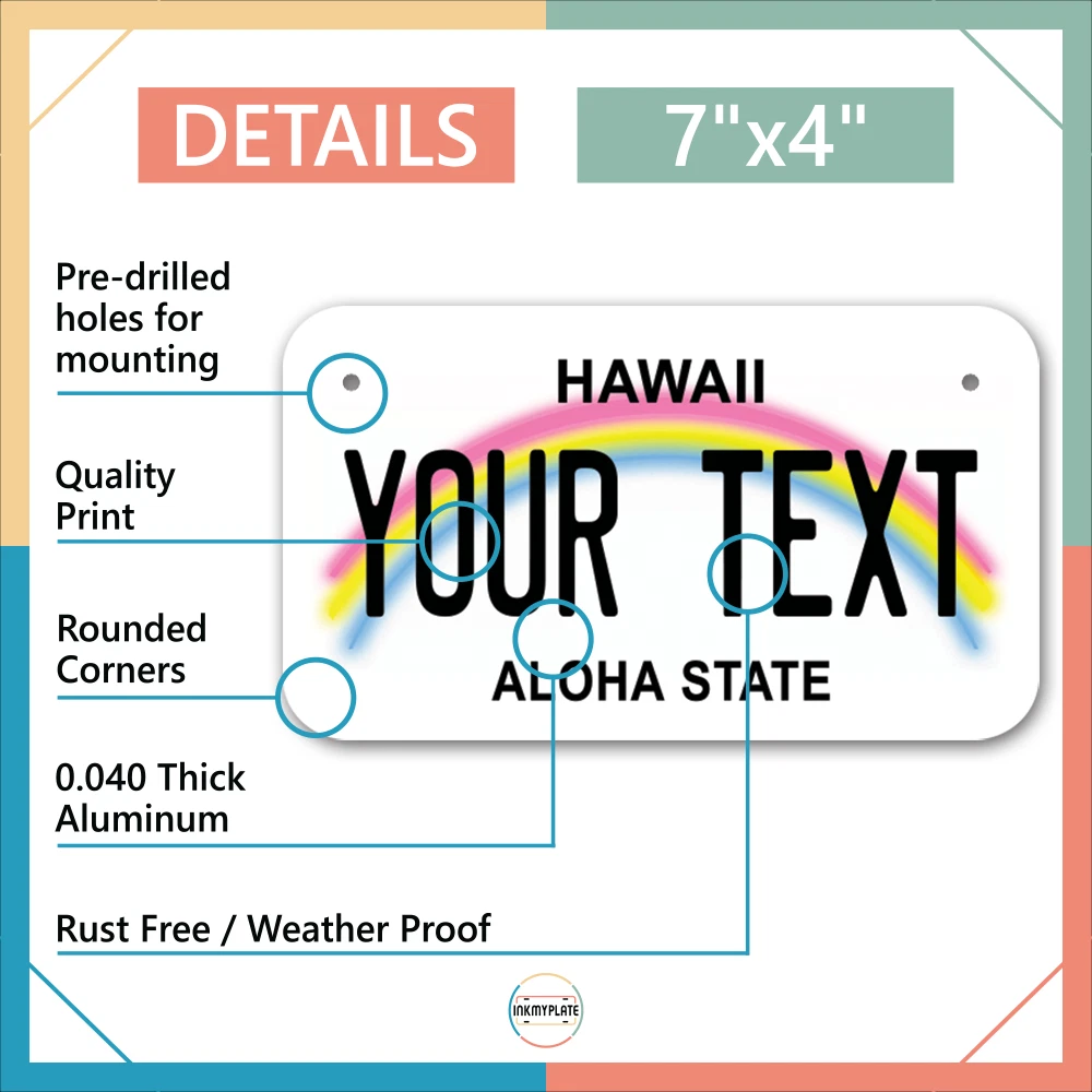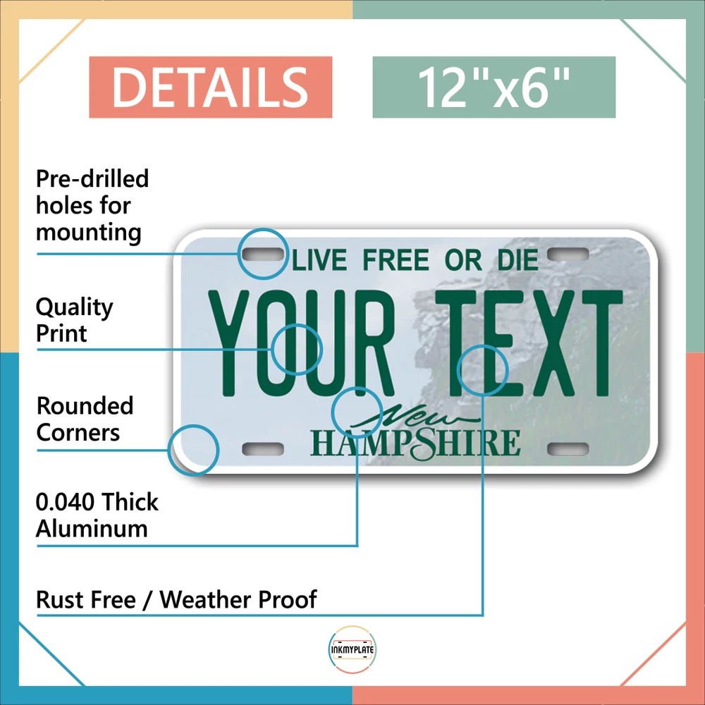 Our LICENSE plates are the most unique souvenirs from the United States, Choose between 50 states and 3 different sizes. Cannot be used in place of a state issued plate. IMPORTANT DESCRIPTION • Plates are made using High quality thick 040 rust free Aluminum. • Our plates are printed flat, not raised. The customizing is done using the latest UV Laser technique for weatherproof and high-quality finish. • 100% made in USA. • Standard car plate has four holes and can be used for trucks, motor homes, and more • M otorcycle plates have 2 holes on top for mounting and can be used on ATVS, Mopeds, Snowmobiles, wheelchairs and golf carts • B ike plates have two holes on top and can also be used for toy cars, wagons, electric toy cars, tricycles and more • Write your text in the personalization section. The text will be copied and pasted on the license plate as sent, so make sure of the spelling, punctuation, capitalization, etc. If you have any question regarding your text or you would like a preview, please let us know by adding a note or contacting Alabama | Alaska | Arizona | Arkansas | California | Colorado | Connecticut | Delaware | Florida | Georgia | Hawaii | Idaho | Illinois | Indiana | Iowa | Kansas | Kentucky | Louisiana | Maine | Maryland | Massachusetts | Michigan | Minnesota | Mississippi | Missouri | Montana | Nebraska | Nevada | New Hampshire | New Jersey | New Mexico | New York | North Carolina | North Dakota | Ohio | Oklahoma | Oregon | Pennsylvania | Puerto Rico | Rhode Island | South Carolina | South Dakota | Tennessee | Texas | Utah | Vermont | Virginia | Washington | West Virginia | Wisconsin | Wyoming