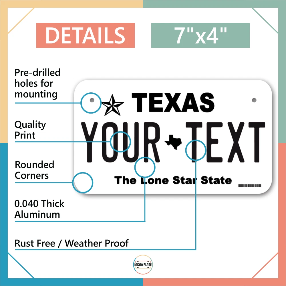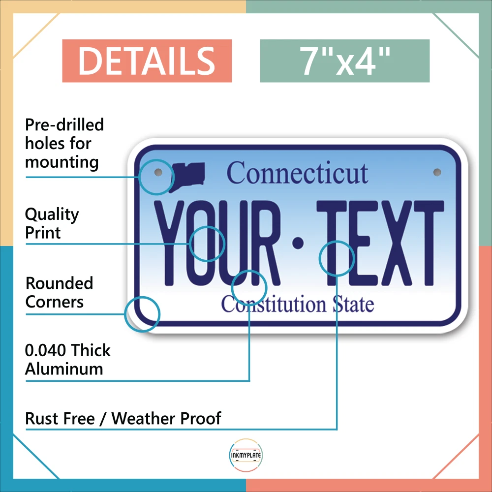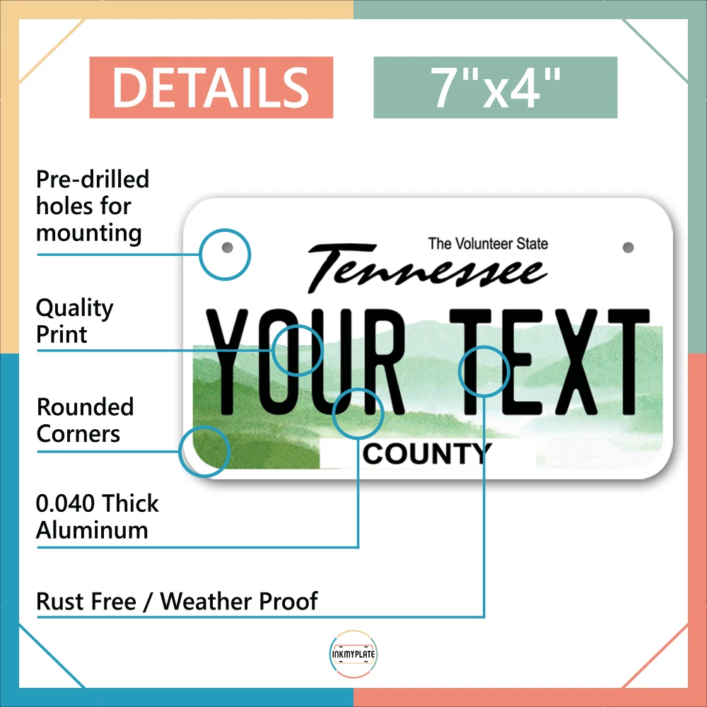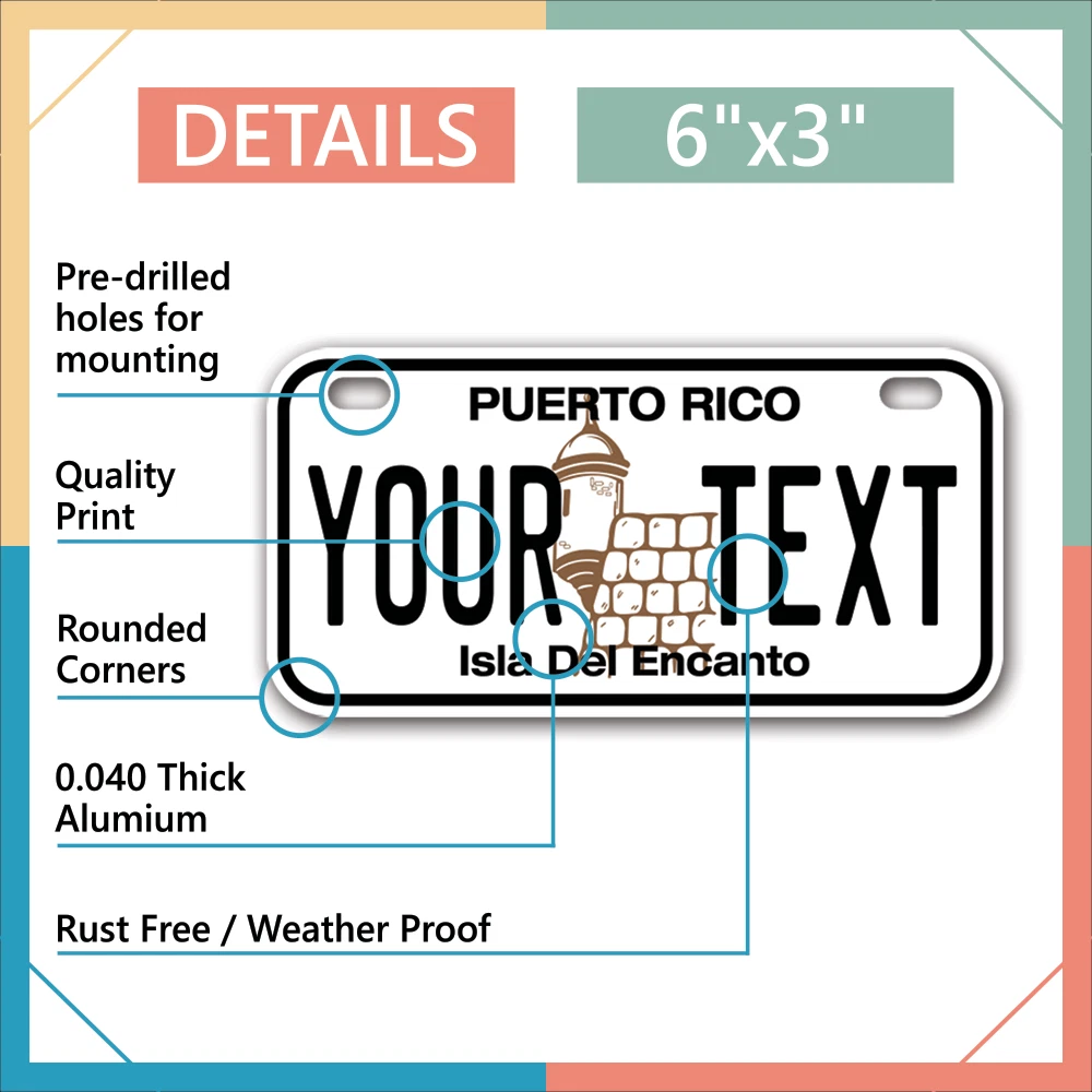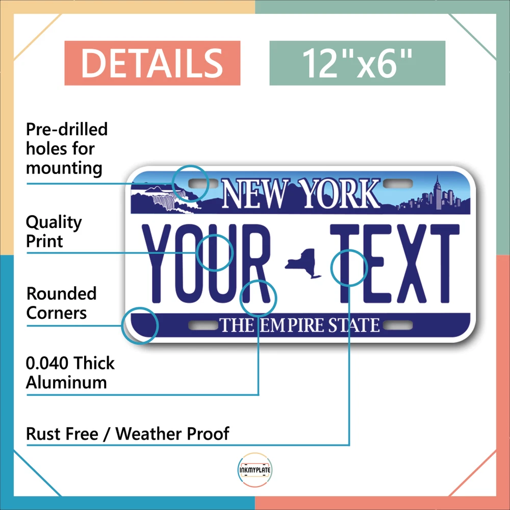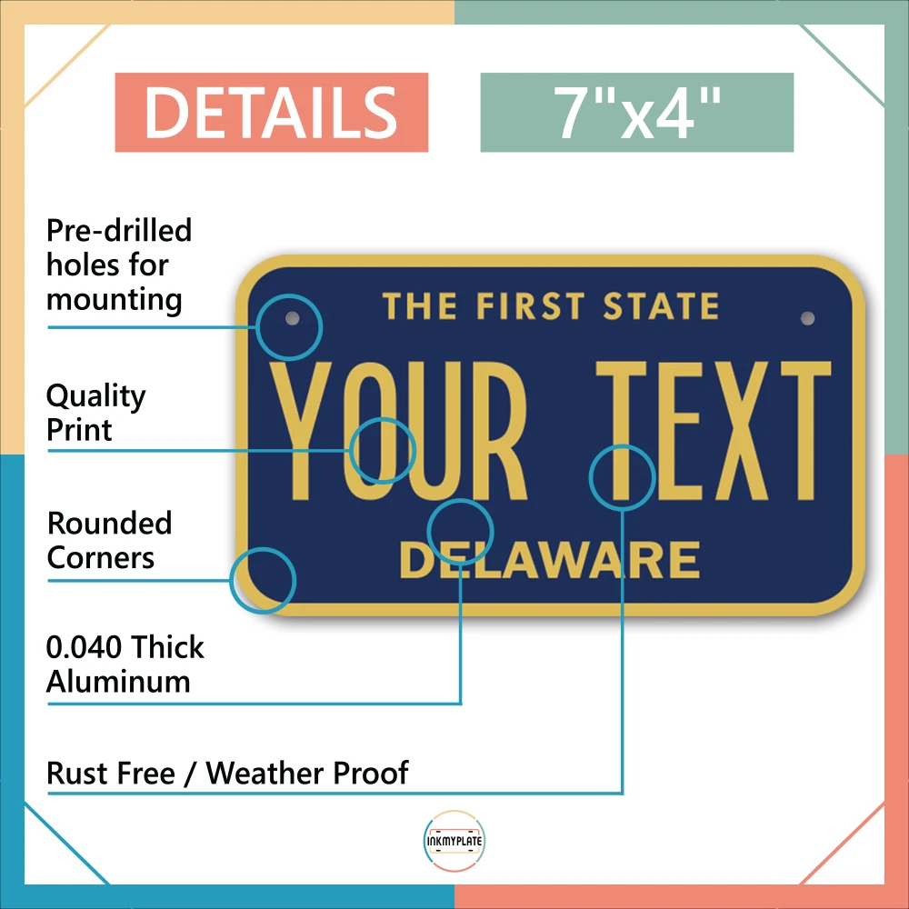 Our LICENSE plates are the most unique souvenirs from the United States, Choose between 50 states and 3 different sizes. Cannot be used in place of a state issued plate. IMPORTANT DESCRIPTION • Plates are made using High quality thick 040 rust free Aluminum. • Our plates are printed flat, not raised. The customizing is done using the latest UV Laser technique for weatherproof and high-quality finish. • 100% made in USA. • Standard car plate has four holes and can be used for trucks, motor homes, and more • M otorcycle plates have 2 holes on top for mounting and can be used on ATVS, Mopeds, Snowmobiles, wheelchairs and golf carts • B ike plates have two holes on top and can also be used for toy cars, wagons, electric toy cars, tricycles and more • Write your text in the personalization section. The text will be copied and pasted on the license plate as sent, so make sure of the spelling, punctuation, capitalization, etc. If you have any question regarding your text or you would like a preview, please let us know by adding a note or contacting Alabama | Alaska | Arizona | Arkansas | California | Colorado | Connecticut | Delaware | Florida | Georgia | Hawaii | Idaho | Illinois | Indiana | Iowa | Kansas | Kentucky | Louisiana | Maine | Maryland | Massachusetts | Michigan | Minnesota | Mississippi | Missouri | Montana | Nebraska | Nevada | New Hampshire | New Jersey | New Mexico | New York | North Carolina | North Dakota | Ohio | Oklahoma | Oregon | Pennsylvania | Puerto Rico | Rhode Island | South Carolina | South Dakota | Tennessee | Texas | Utah | Vermont | Virginia | Washington | West Virginia | Wisconsin | Wyoming