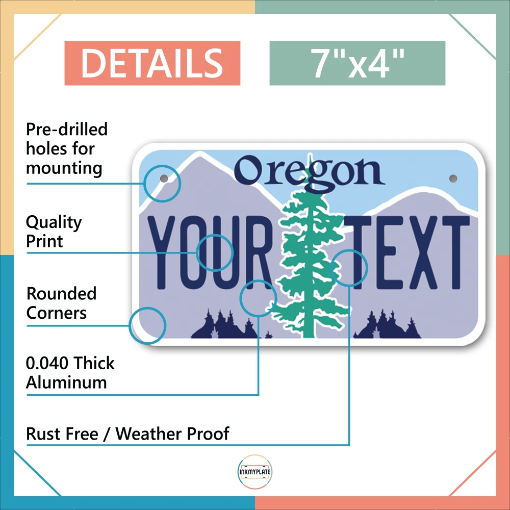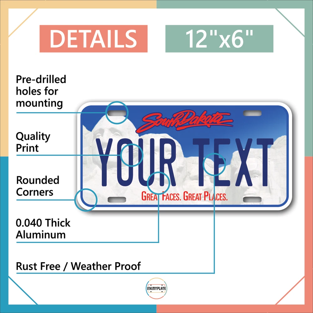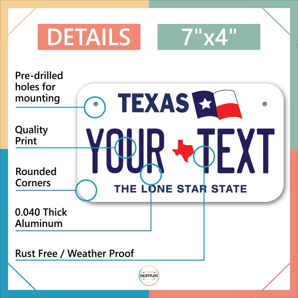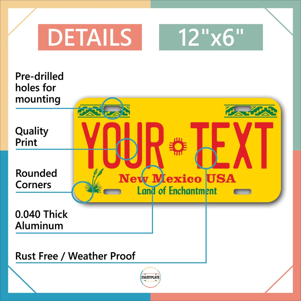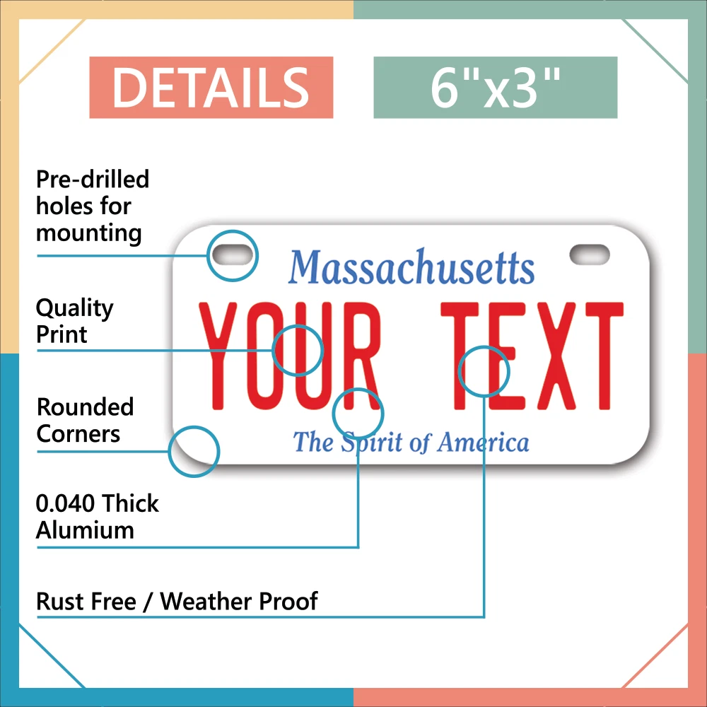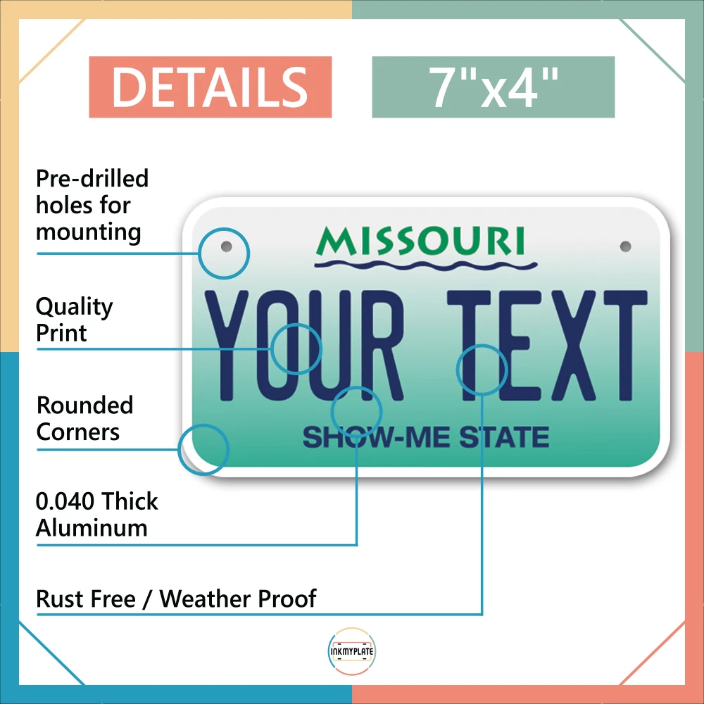 Our LICENSE plates are the most unique souvenirs from the United States, Choose between 50 states and 3 different sizes. Cannot be used in place of a state issued plate. IMPORTANT DESCRIPTION • Plates are made using High quality thick 040 rust free Aluminum. • Our plates are printed flat, not raised. The customizing is done using the latest UV Laser technique for weatherproof and high-quality finish. • 100% made in USA. • Standard car plate has four holes and can be used for trucks, motor homes, and more • M otorcycle plates have 2 holes on top for mounting and can be used on ATVS, Mopeds, Snowmobiles, wheelchairs and golf carts • B ike plates have two holes on top and can also be used for toy cars, wagons, electric toy cars, tricycles and more • Write your text in the personalization section. The text will be copied and pasted on the license plate as sent, so make sure of the spelling, punctuation, capitalization, etc. If you have any question regarding your text or you would like a preview, please let us know by adding a note or contacting Alabama | Alaska | Arizona | Arkansas | California | Colorado | Connecticut | Delaware | Florida | Georgia | Hawaii | Idaho | Illinois | Indiana | Iowa | Kansas | Kentucky | Louisiana | Maine | Maryland | Massachusetts | Michigan | Minnesota | Mississippi | Missouri | Montana | Nebraska | Nevada | New Hampshire | New Jersey | New Mexico | New York | North Carolina | North Dakota | Ohio | Oklahoma | Oregon | Pennsylvania | Puerto Rico | Rhode Island | South Carolina | South Dakota | Tennessee | Texas | Utah | Vermont | Virginia | Washington | West Virginia | Wisconsin | Wyoming
