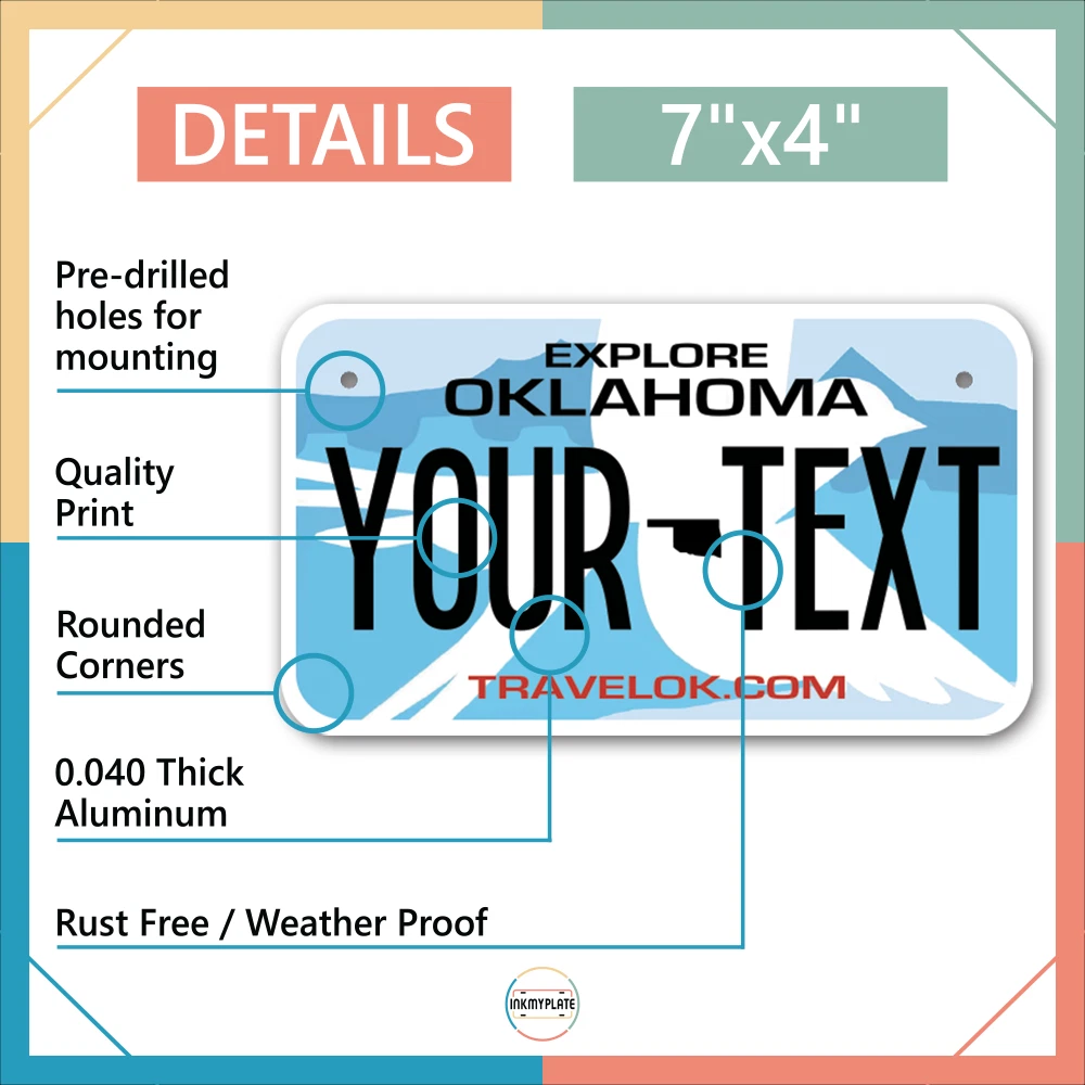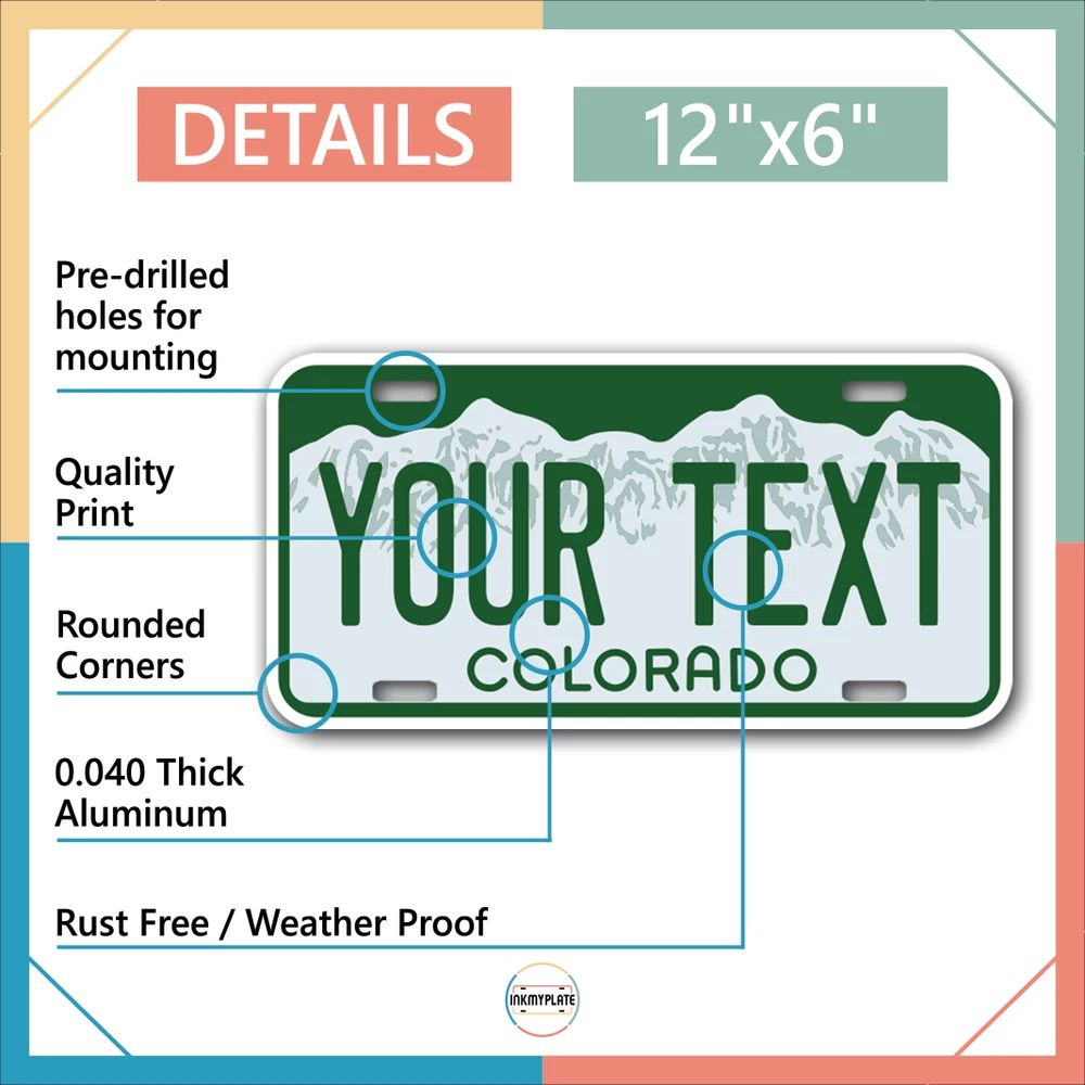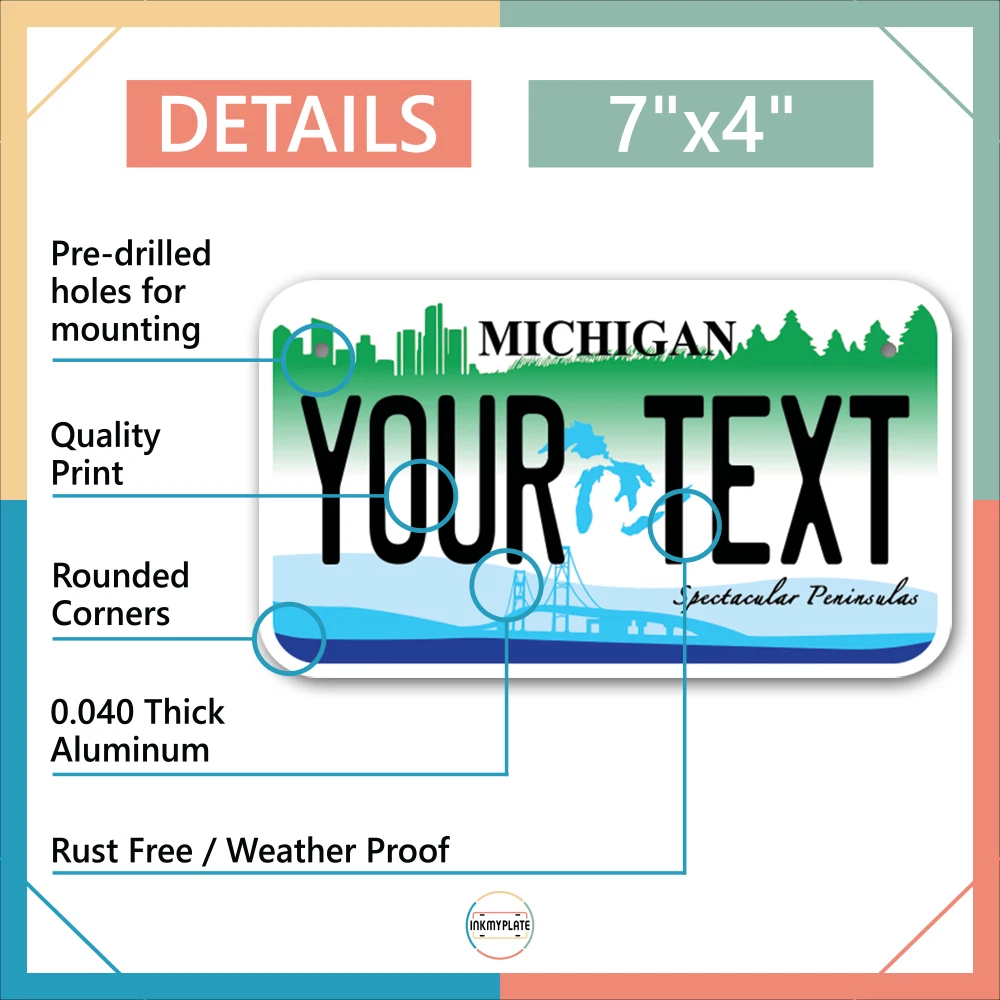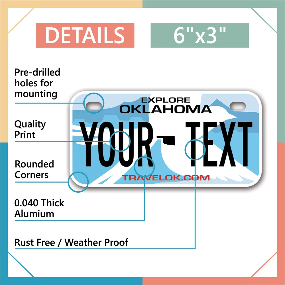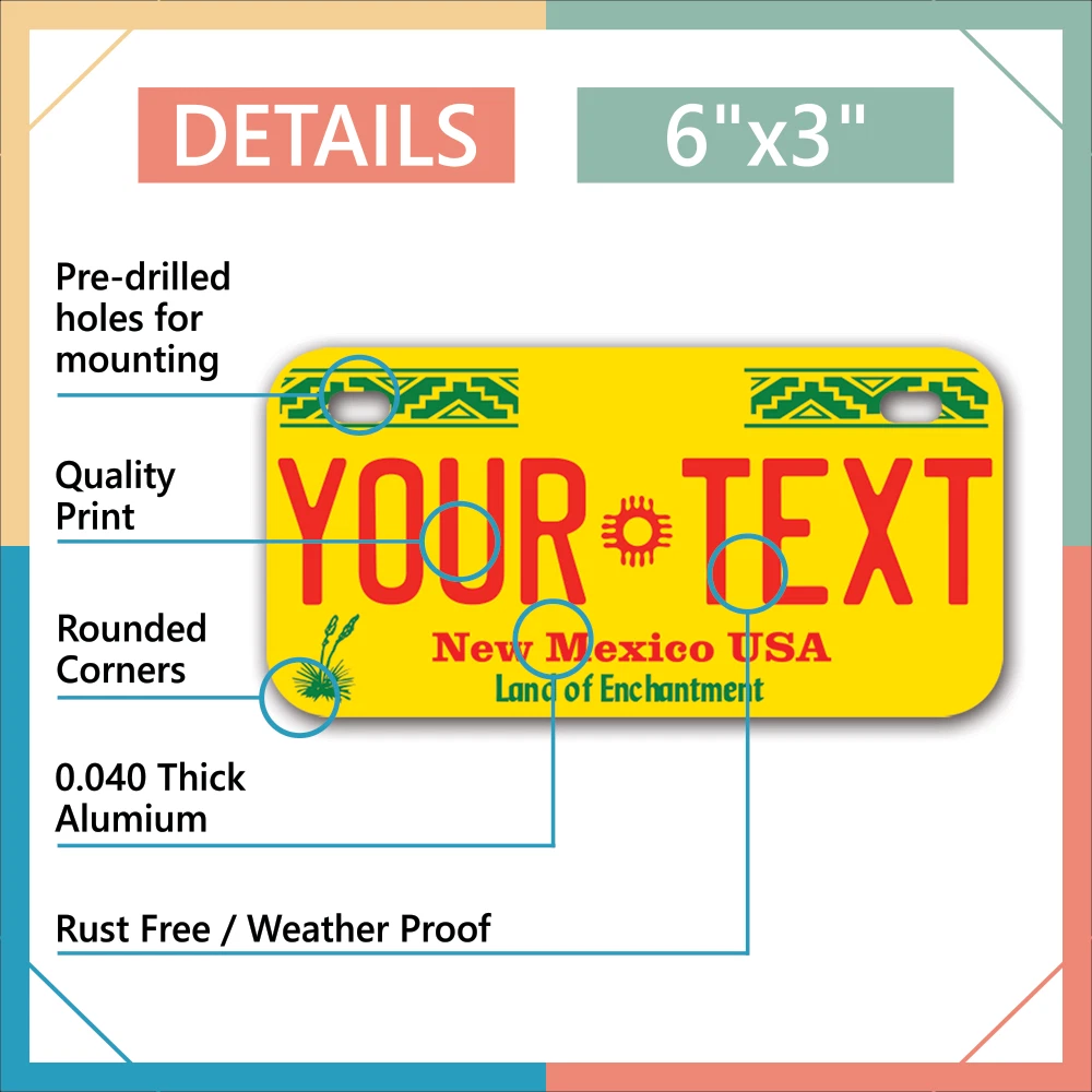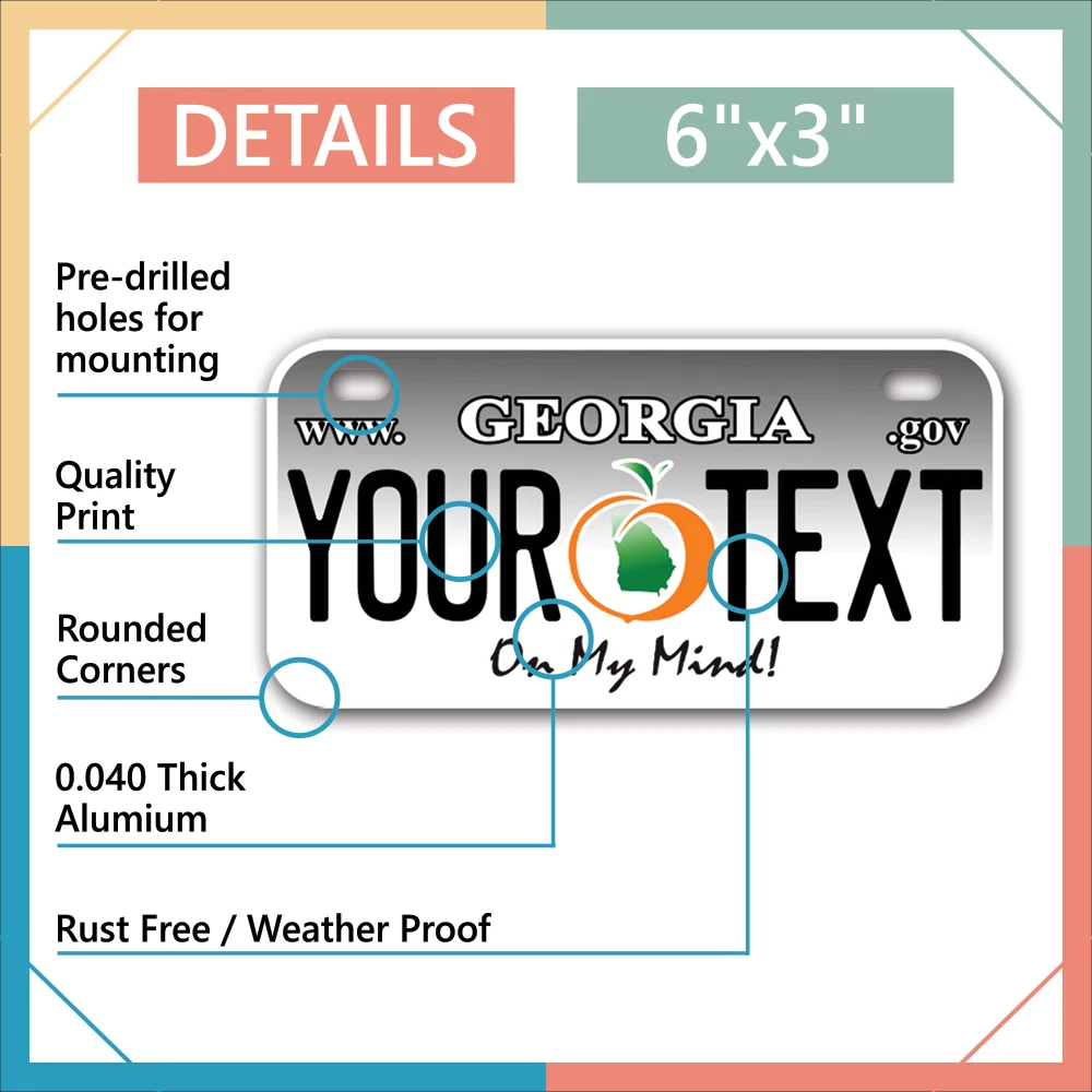 Our LICENSE plates are the most unique souvenirs from the United States, Choose between 50 states and 3 different sizes. Cannot be used in place of a state issued plate. IMPORTANT DESCRIPTION • Plates are made using High quality thick 040 rust free Aluminum. • Our plates are printed flat, not raised. The customizing is done using the latest UV Laser technique for weatherproof and high-quality finish. • 100% made in USA. • Standard car plate has four holes and can be used for trucks, motor homes, and more • M otorcycle plates have 2 holes on top for mounting and can be used on ATVS, Mopeds, Snowmobiles, wheelchairs and golf carts • B ike plates have two holes on top and can also be used for toy cars, wagons, electric toy cars, tricycles and more • Write your text in the personalization section. The text will be copied and pasted on the license plate as sent, so make sure of the spelling, punctuation, capitalization, etc. If you have any question regarding your text or you would like a preview, please let us know by adding a note or contacting Alabama | Alaska | Arizona | Arkansas | California | Colorado | Connecticut | Delaware | Florida | Georgia | Hawaii | Idaho | Illinois | Indiana | Iowa | Kansas | Kentucky | Louisiana | Maine | Maryland | Massachusetts | Michigan | Minnesota | Mississippi | Missouri | Montana | Nebraska | Nevada | New Hampshire | New Jersey | New Mexico | New York | North Carolina | North Dakota | Ohio | Oklahoma | Oregon | Pennsylvania | Puerto Rico | Rhode Island | South Carolina | South Dakota | Tennessee | Texas | Utah | Vermont | Virginia | Washington | West Virginia | Wisconsin | Wyoming