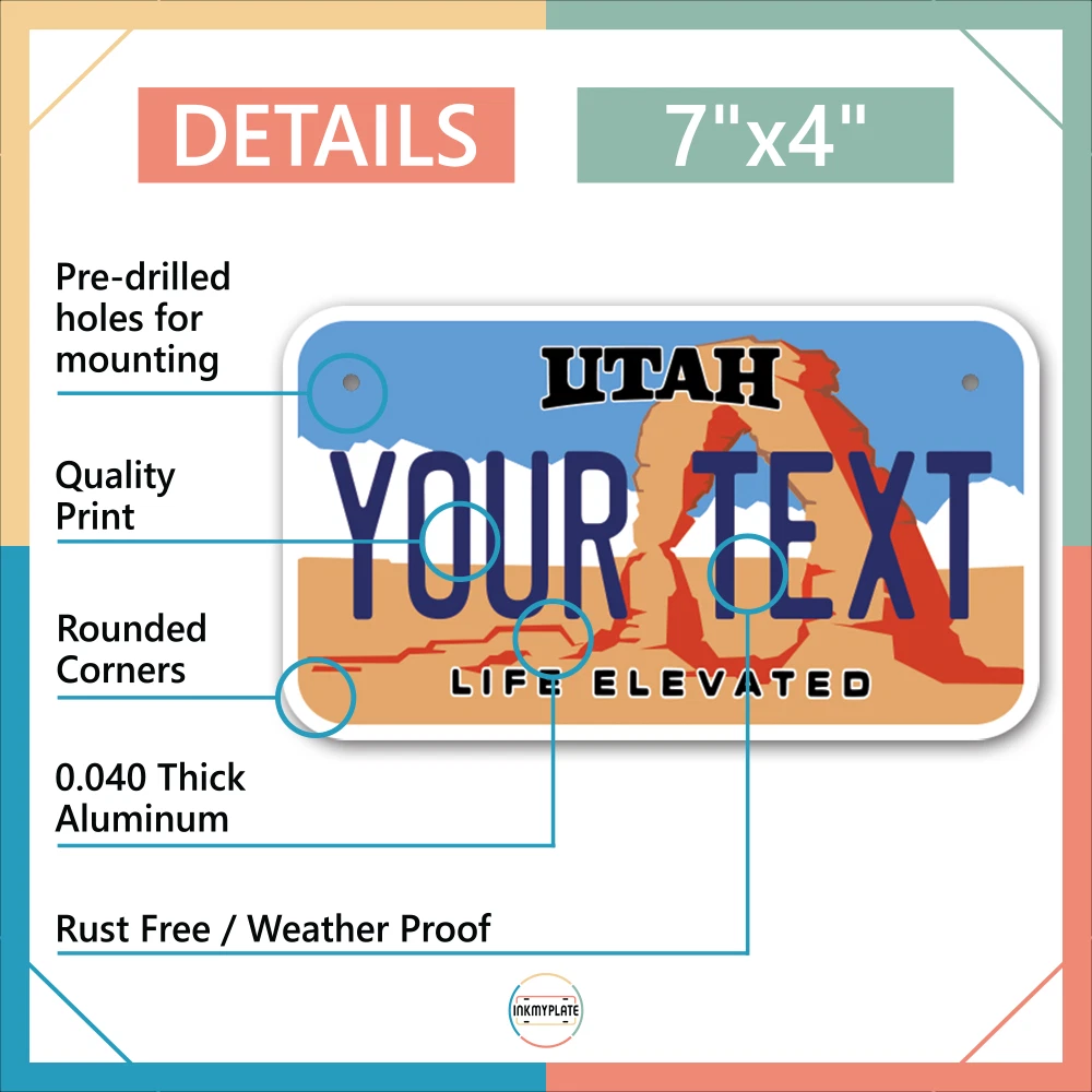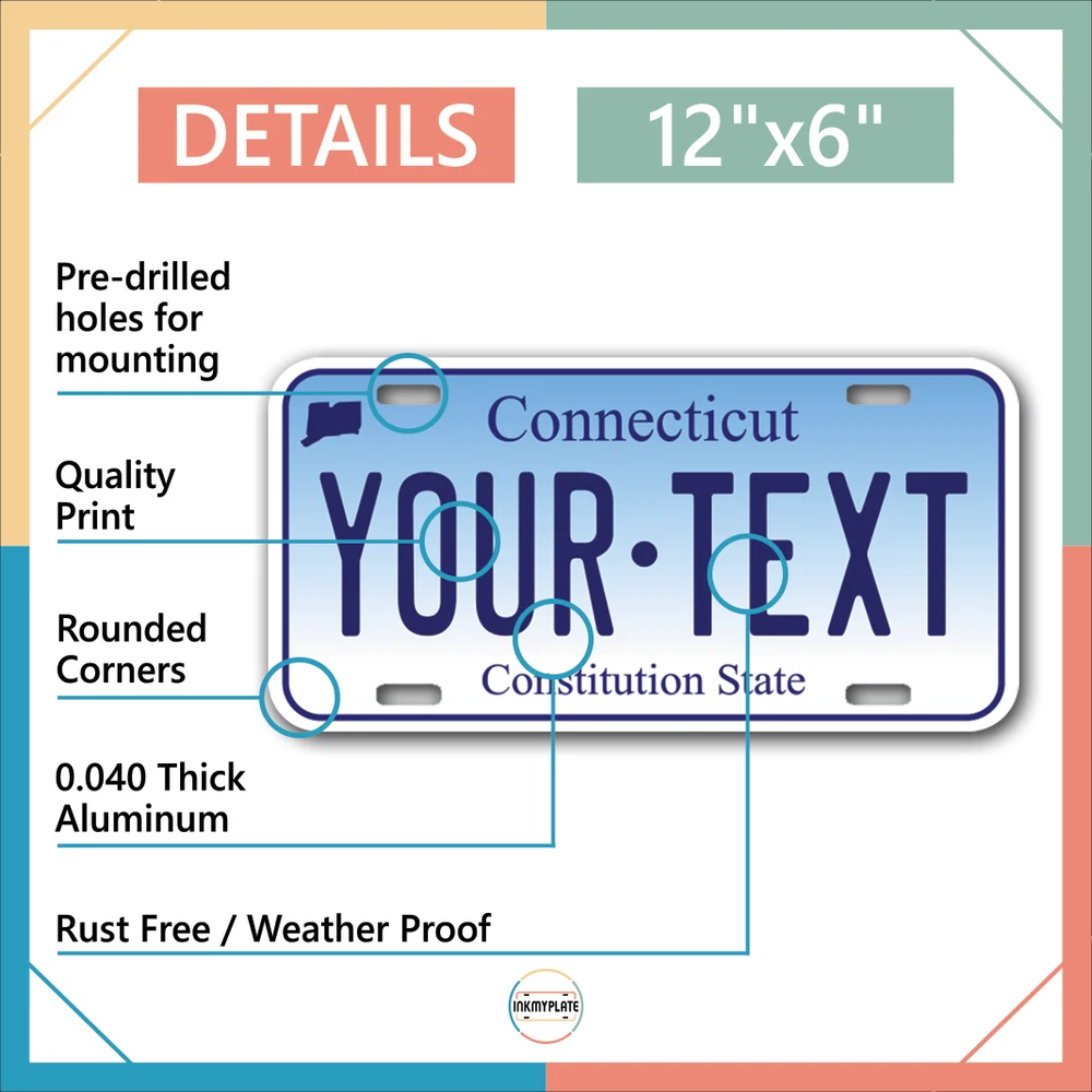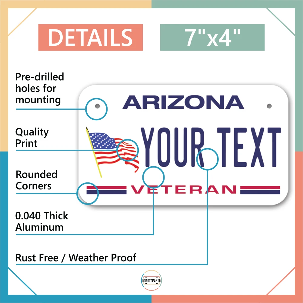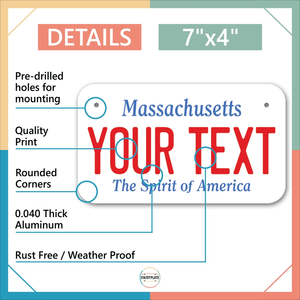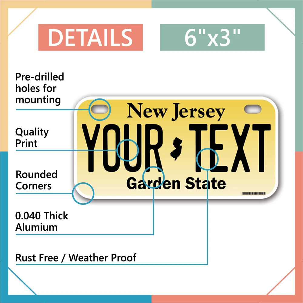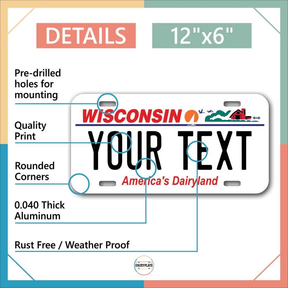 Our LICENSE plates are the most unique souvenirs from the United States, Choose between 50 states and 3 different sizes. Cannot be used in place of a state issued plate. IMPORTANT DESCRIPTION • Plates are made using High quality thick 040 rust free Aluminum. • Our plates are printed flat, not raised. The customizing is done using the latest UV Laser technique for weatherproof and high-quality finish. • 100% made in USA. • Standard car plate has four holes and can be used for trucks, motor homes, and more • M otorcycle plates have 2 holes on top for mounting and can be used on ATVS, Mopeds, Snowmobiles, wheelchairs and golf carts • B ike plates have two holes on top and can also be used for toy cars, wagons, electric toy cars, tricycles and more • Write your text in the personalization section. The text will be copied and pasted on the license plate as sent, so make sure of the spelling, punctuation, capitalization, etc. If you have any question regarding your text or you would like a preview, please let us know by adding a note or contacting Alabama | Alaska | Arizona | Arkansas | California | Colorado | Connecticut | Delaware | Florida | Georgia | Hawaii | Idaho | Illinois | Indiana | Iowa | Kansas | Kentucky | Louisiana | Maine | Maryland | Massachusetts | Michigan | Minnesota | Mississippi | Missouri | Montana | Nebraska | Nevada | New Hampshire | New Jersey | New Mexico | New York | North Carolina | North Dakota | Ohio | Oklahoma | Oregon | Pennsylvania | Puerto Rico | Rhode Island | South Carolina | South Dakota | Tennessee | Texas | Utah | Vermont | Virginia | Washington | West Virginia | Wisconsin | Wyoming