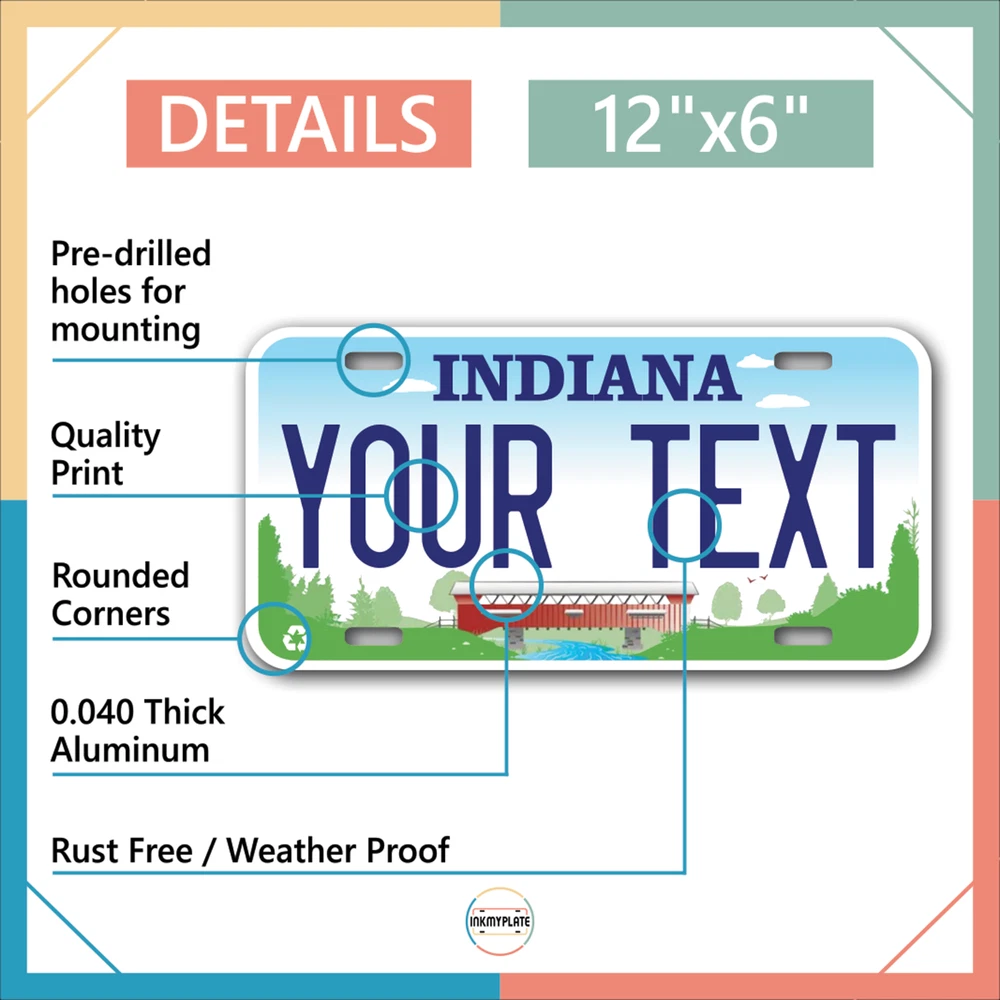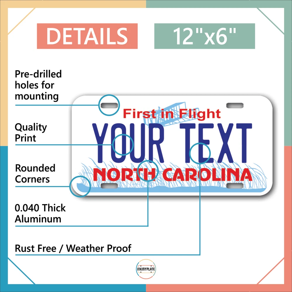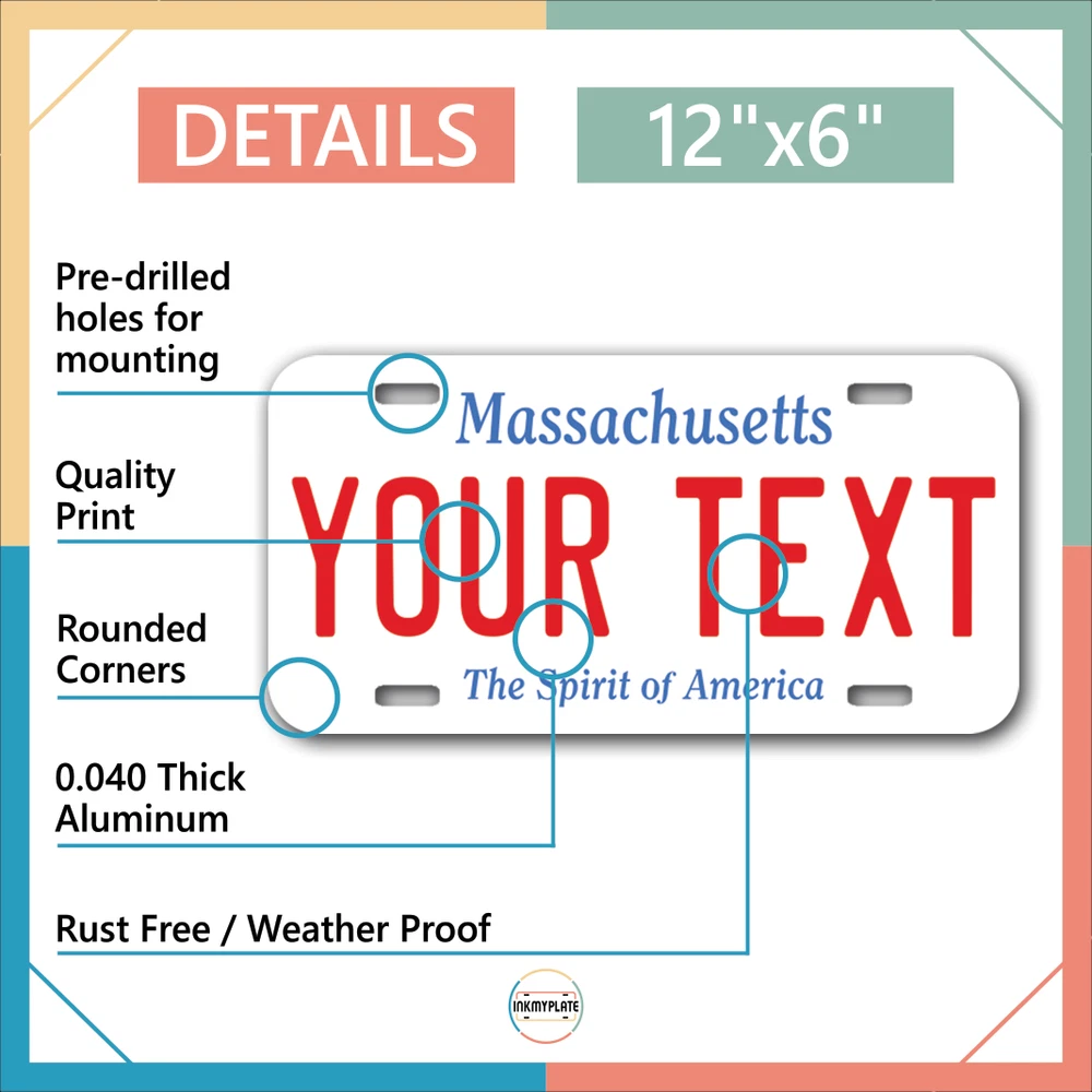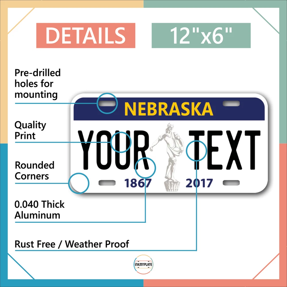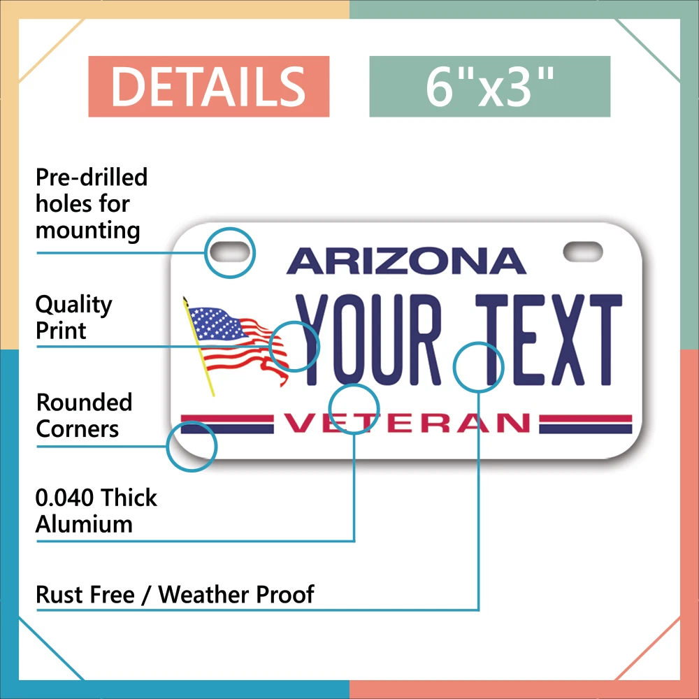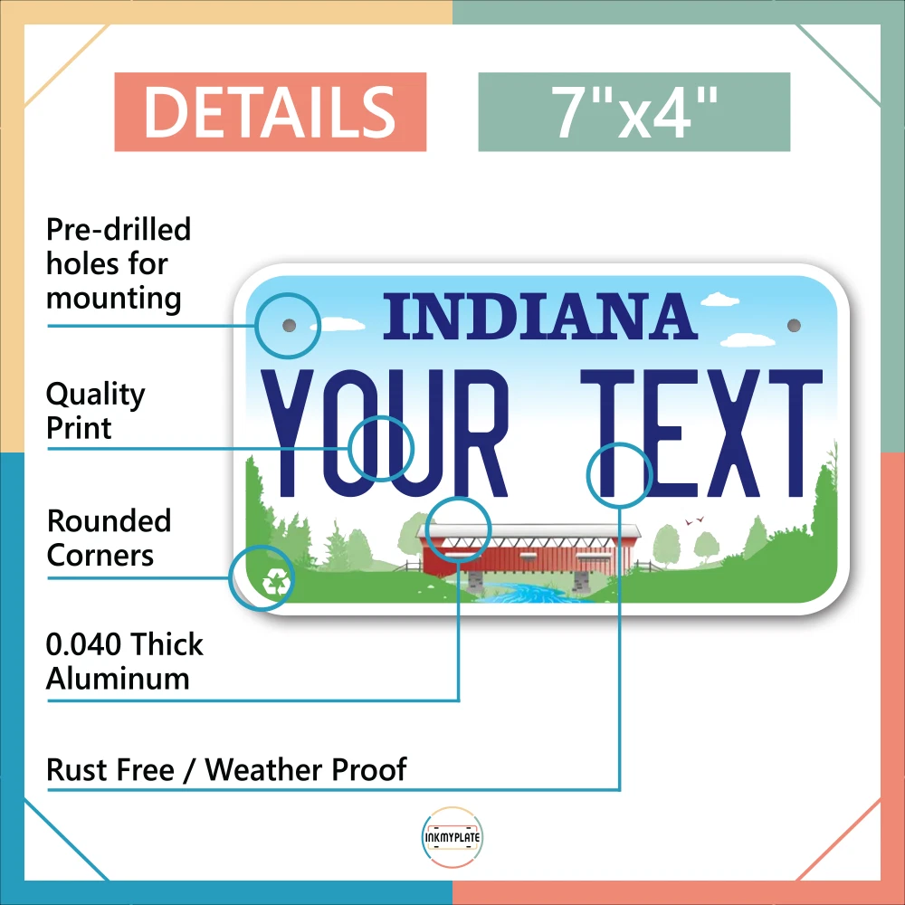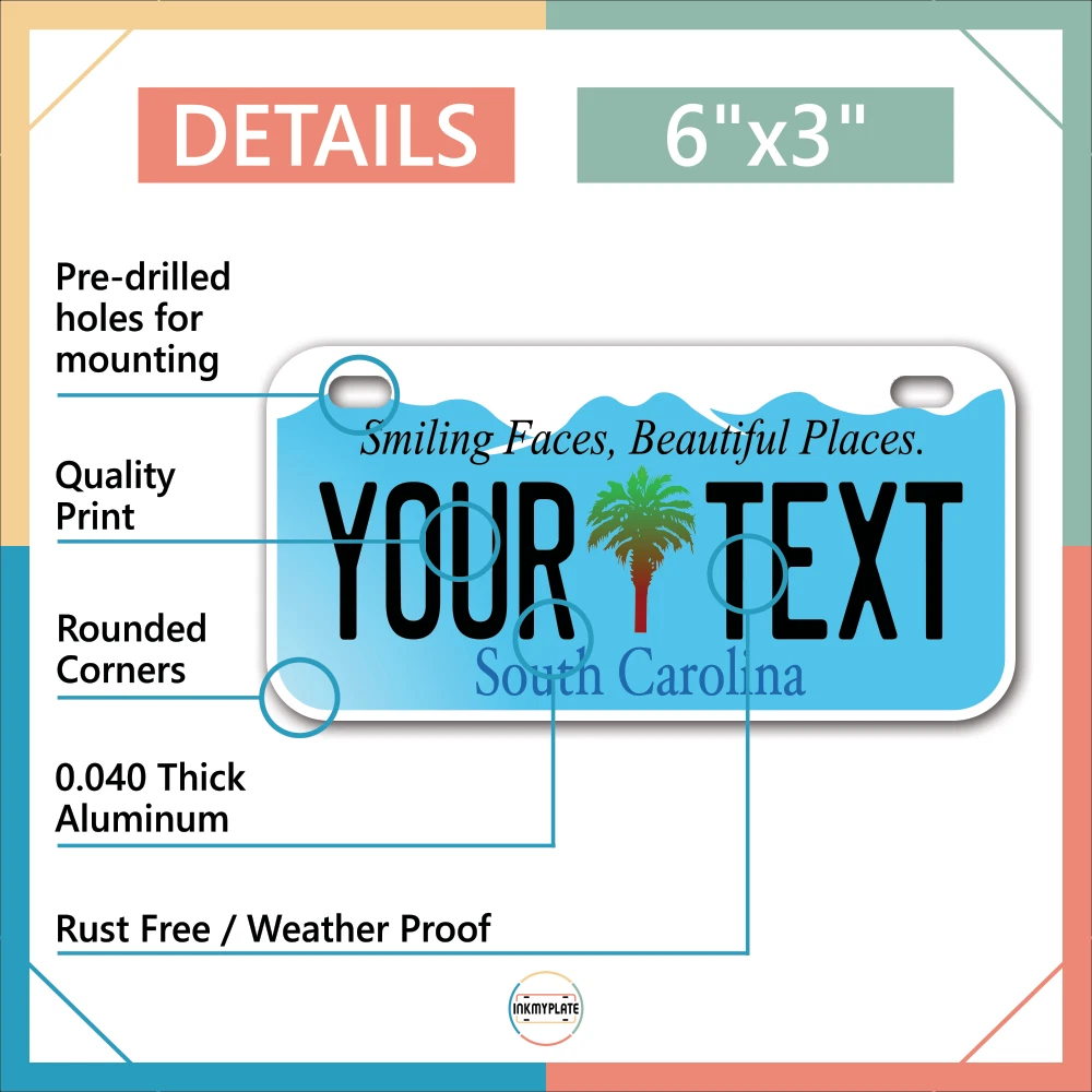 Our LICENSE plates are the most unique souvenirs from the United States, Choose between 50 states and 3 different sizes. Cannot be used in place of a state issued plate. IMPORTANT DESCRIPTION • Plates are made using High quality thick 040 rust free Aluminum. • Our plates are printed flat, not raised. The customizing is done using the latest UV Laser technique for weatherproof and high-quality finish. • 100% made in USA. • Standard car plate has four holes and can be used for trucks, motor homes, and more • M otorcycle plates have 2 holes on top for mounting and can be used on ATVS, Mopeds, Snowmobiles, wheelchairs and golf carts • B ike plates have two holes on top and can also be used for toy cars, wagons, electric toy cars, tricycles and more • Write your text in the personalization section. The text will be copied and pasted on the license plate as sent, so make sure of the spelling, punctuation, capitalization, etc. If you have any question regarding your text or you would like a preview, please let us know by adding a note or contacting Alabama | Alaska | Arizona | Arkansas | California | Colorado | Connecticut | Delaware | Florida | Georgia | Hawaii | Idaho | Illinois | Indiana | Iowa | Kansas | Kentucky | Louisiana | Maine | Maryland | Massachusetts | Michigan | Minnesota | Mississippi | Missouri | Montana | Nebraska | Nevada | New Hampshire | New Jersey | New Mexico | New York | North Carolina | North Dakota | Ohio | Oklahoma | Oregon | Pennsylvania | Puerto Rico | Rhode Island | South Carolina | South Dakota | Tennessee | Texas | Utah | Vermont | Virginia | Washington | West Virginia | Wisconsin | Wyoming