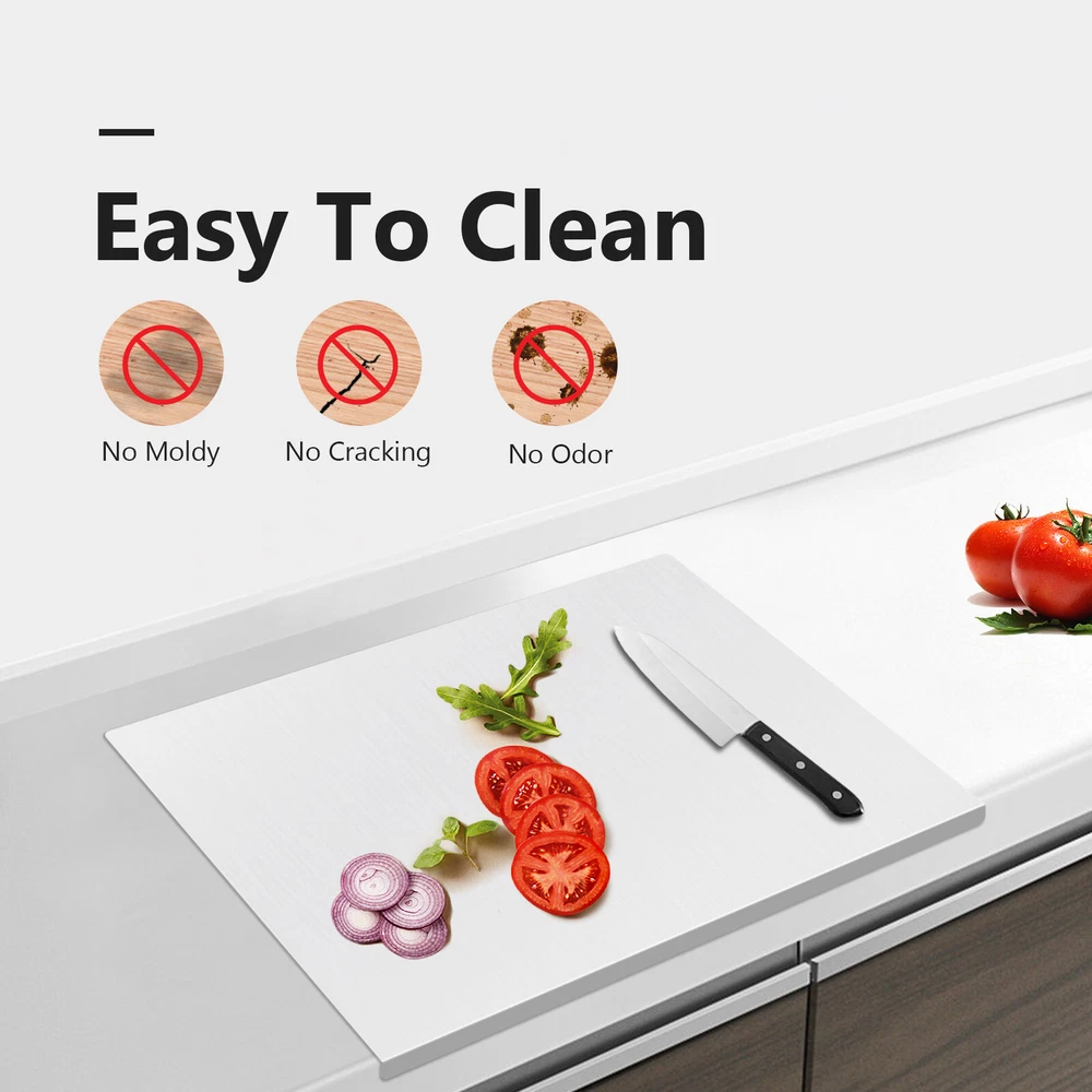 Extra Large Stainless Steel Chopping Boards, Cooking Board, Heavy Chopping Board for Kitchen, Pastry Tips for Meat, Vegetables Description The wooden cutting board is easy to mold and breed bacteria, which will stain when cutting vegetables and thus is not conducive to a healthy life. It is time for you to try this new stainless steel cutting board. It is made of high-quality 304 stainless steel, not easy to rust and corrosion to ensure the hygiene of your food. The larger size can also make it easier for you to cut meat and vegetables. Specification Color: Silver Material: 304 Stainless Steel Shape: Rectangular Style: Modern Net Weight: 5.2kg/11.5lbs Gross Weight: 5.6kg/12.3lbs Package Size: 73*53*6cm/28.7*20.9*2.4inch Product Size: 70*50cm/27.6*19.7inch Product T Cutting Boards Large Stainless Steel Cutting Chopping Boards Pastry Board f Meat Welcome~ Extra Large Stainless Steel Chopping Boards, Cooking Board, Heavy Chopping Board for Kitchen, Pastry Tips for Meat, Vegetables Description The wooden cutting board is easy to mold and breed bacteria, which will stain when cutting vegetables and thus is not conducive to a healthy life. It is time for you to try this new stainless steel cutting board. It is made of high-quality 304 stainless steel, not easy to rust and corrosion to ensure the hygiene of your food. The larger size can also make it easier for you to cut meat and vegetables. Specification Color: Silver Material: 304 Stainless Steel Shape: Rectangular Style: Modern Net Weight: 5.2kg/11.5lbs Gross Weight: 5.6kg/12.3lbs Package Size: 73*53*6cm/28.7*20.9*2.4inch Product Size: 70*50cm/27.6*19.7inch Product Thickness: 1.5mm/0.06 inch Folded Edge Height: 2cm/0.8inch Package Included 1* Stainless Steel Chopping Board 1* Anti-slip Pad Key Features High-quality Material: This product is made of high-quality 304 stainless steel, which is anti-rust , anti-mold , high-temperature resistant , and not easy to deform, so it is very strong and durable. Stylish Appearance: The pure silver exterior, as well as the classic design, makes it look stylish. It can blend in with different decor styles and add color to your kitchen. Suitable Size: The size of this product is 70*50cm/27.6*19.7inch, which is large enough to fit all your cutting needs in the kitchen. Folded Edge Design: The thoughtful folded edge design can effectively prevent the cutting board from sliding, which makes the product safer to use. Double-sided Use: This product can be used on both sides to distinguish raw food from cooked food, making the diet more hygienic. Shock-absorption Function: It can play a good shock-absorption and cushioning effect, making the chopping sound small and creating a quiet kitchen environment for you. Easy to Clean: The stainless steel material doesn't leak easily, hides dirt, and is dirt-resistant . Meanwhile, the surface of this product is smooth and flat, which can be easily cleaned with soap and water after use. Guaranteed Customer Service: We aim to provide quality products and services. If you have problems, please feel free to contact us. We will reply and solve the problem for you as soon as possible. Details Surface Brushing Process: This product uses a surface brushing process, reducing damage to the knife and the dulling factor. Round Corners: The corners of this product are round, which can prevent cutting your hands. It is very thoughtful for you to use. Anti-slip Pad: We are equipped with an anti-slip pad that can effectively prevent slipping, making it easier and faster for you to cut vegetables and knead the dough. Application It is suitable for cutting vegetables, meat, fruits, etc. It is also suitable for kneading dough. Notes Scratches may be caused on the surface of the product during processing. Scratches do not affect the use of the product. The product comes with a protective film. After receiving the product, please confirm whether the size is suitable before tearing off the protective film by yourself. Slightly black gel residue at the edges of the product is a normal phenomenon. It's recommended to use soda water to clean the gum residue. Please allow the slight color difference caused by the shooting light and 1-3cm error due to manual measurement, and make sure you do not mind before ordering. tu1 Payment Delivery details Terms of sales About us Contact us Payment We accept ebay payment 。 Fees such as import duties, taxes are not included in the item price or shipping costs. These charges are the buyer's responsibility. Delivery details Shipping: 2-9 working days to: USA Terms of sales We maintain high standards of excellence and strive for hundred percent customer satisfaction. Feedback is very important to us. We hope that you contact us immediately before you give neutral or negative feedback, so that we can address your concerns. It is impossible to address issues if we do not know about them! About us Your satis faction is our ultimate goal. We work hard to earn your trust and future business. Our certified technicians have tested each item before shipping. The unit comes with 1 year limited warranty on all manufacturing defects. a) If you receive a defective item, you may return it or ask for a discount. Please contact us within 14 days after you receive the package. b) What you returned must be intact and in its original packaging as re? u. Customer is responsible for shipping costs of the returned item. c) We will cover the cost of shipping back t with the shipping rate indicated in the registration page. We will send you a new unit or refund the full payment you paid. Thank you. Contact us Business Hour Business Hour: Monday To Friday: 8:30 AM to 5:00 PM (Beijing China time) Due to time zones, our reply to your questions may not be immediately. But within above working time, we will reply your email within 24 hours. If it's non-workdays, please kindly be patient and wait till Monday. Please contact us with ebay message. Please feel free to contact us if you have a