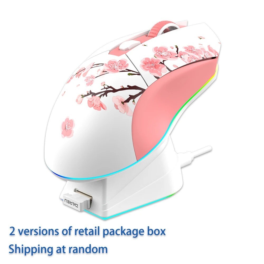 DAREU Dual Mode RGB Gaming Mouse – 2.4G Wireless & Wired, 930mAh Battery, Macro Settings for PC/Laptop EM901 Dual-mode Lightweight Mouse There are 2 versions of retail package box, we will send it to you at random. Hope you can understand. Thanks. With Charging Base The mouse can be charged directly on the base through the adsorption type, which is convenient and fast. With a variety of RGB lighting effects, the desktop is dazzling and beautiful. 2.4G Wireless Transmission Brings you almost the same as the wired state, which can continuously search and connect high-quality signals, ensure the stability of data transmission, and almost no delay when gaming. Lightweight Design Make your wrist will not be sore even if you use it for a long time. DAREU Dual Modes Mouse RGB 2.4G Wireless USB Wired Gaming Mice Built-in 930mAh Recharging Battery with Macro Set for PC Laptop Main Parameters: Working mode: 2.4G wireless or Wired connect DPI value: 600/1200/2400/3600/4800/6000dpi Rate of return: 500/1000Hz(Wireless mode); 125/250/500/1000Hz(Wired mode) Lighting: RGB Indicator light: When the voltage is lower than 10%, the LOGO light turns red and flashes at a frequency of 3S to remind the user Special Note: It will intelligent sleep if you don't move the mouse for 20 minutes. Battery capacity: 930MA Charging current: 300mA Wired Mode Power Consumption: 150 mA (Max) Other features: switch button/chassis light switch button Lightweight design Make your wrist won't be sore even though you use it for a long time. 2.4G wireless transmission The 2.4G wireless transmission technology brings you almost the same as the wired state, which can continuously search and connect high-quality signals, ensure the stability of data transmission, and experience almost no delay in-game competition. Not just looks, but works of art. The mouse can be charged directly on the base through the adsorption type, which is convenient and fast. With a variety of RGB lighting effects, the desktop is dazzling and beautiful. True Wireless, Unrestricted gaming-grade Mouse Sensor The mouse uses an exclusive optical sensor, excellent pointer accuracy, and a good sense of pointer control, so that 2.4G wireless transmission can also be comparable to wired transmission speed, can effectively capture every movement detail, and can be handy in different application scenarios. Built-in lithium battery, long-lasting battery life. It has a built-in 930mAh lithium battery, which can be used continuously for 16 days during 2.4G gaming-grade wireless connection. It can be directly connected to the computer through the Type-C interface for charging, and the charging process will not affect normal use. (The data comes from the Dareu lab. and is calculated on the basis of 4 hours of continuous use per day.) Comfortable feel, easy to control. Ergonomic design, an optimized mouse grip and a new control experience, and skin-like surface treatment to make your operation smoother and more stable. Long-lasting click, 50 million microswitches. The mouse adopts 50 million micro-switches, and the durable micro-motion can ensure that the mouse is used for a long time without being affected, and the consistent feel brings users an excellent control experience. Package content: 1 x Gaming mouse 1 x USB Cable 1 x Receiver 1 x User manual 1 x Charging Station Warm Tips: If the mode of the 2.4G Wireless can't work . Please operate the mouse as the following steps: 1. Please make sure that the mode of the mouse is 2.4G 2. Download the files via the link as below https://drive.google.com/file/d/1AHQ7TP0l0FmNQofr4Nte18wdVWlqhdij/view 3. Click the file "Gaming pro tool V1.81" 4. Please press the left button, right button and the wheel at the same time for 3 seconds.(Keep your mouse nearly to the USB receiver) 5. Press "enter" in another mouse which can work like picture below