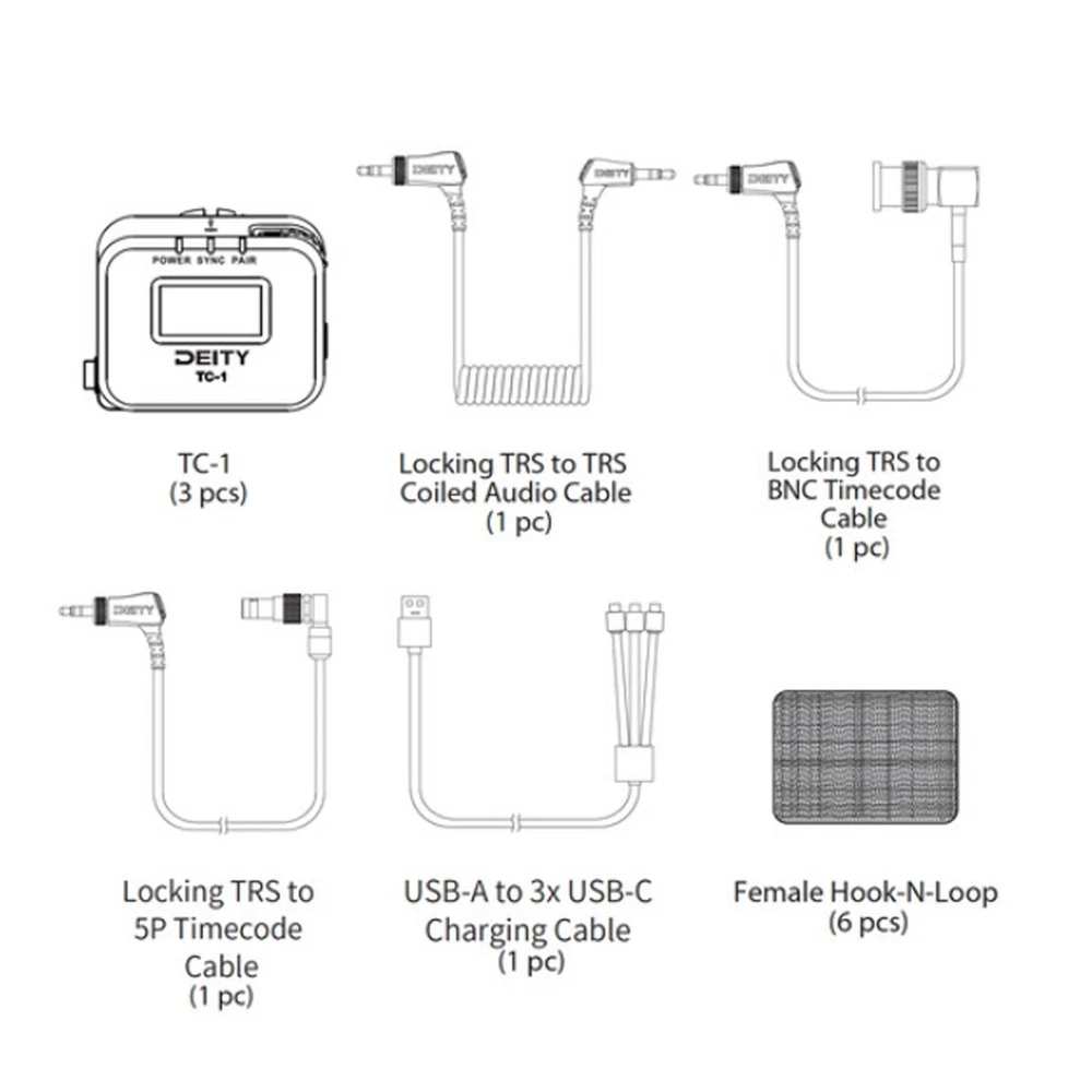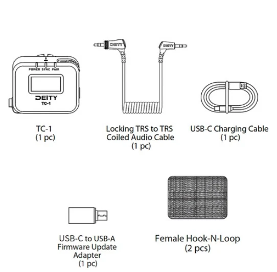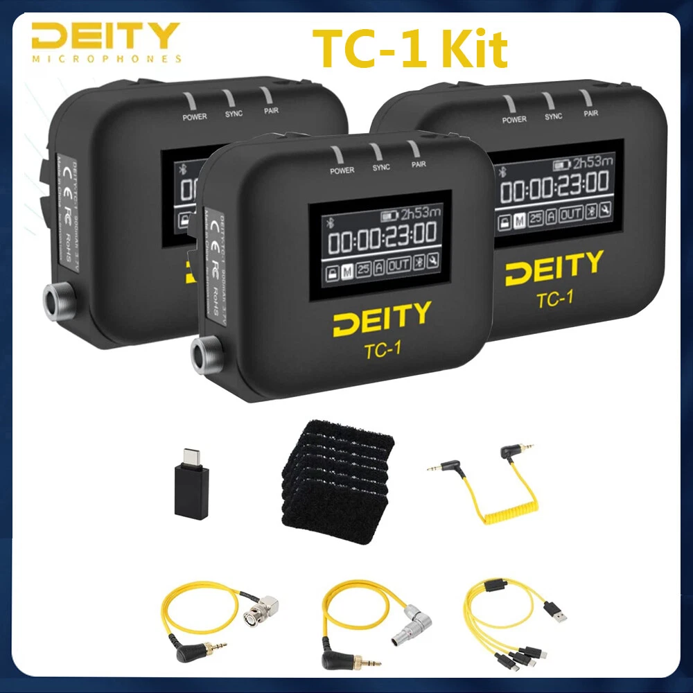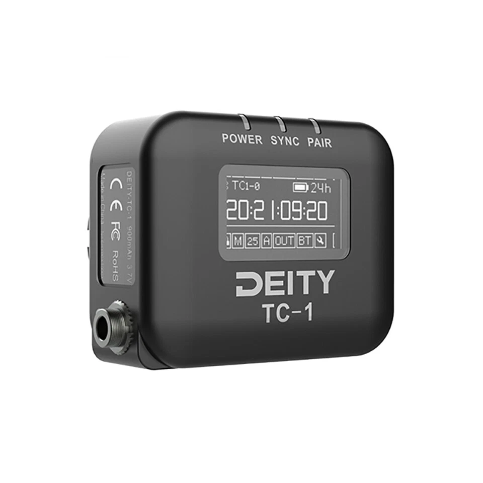 Locking 3.5mm Timecode Port Bluetooth 5.0: Max Range 250FT 2.4G Sync Radio; Max Range 30FT Works with the app Sidus Audio Supports all SMPTE Timecode Formats Timecode Accuracy 0.5ppm 1 Frame Drift Every 72 Hours Showcases a 1” OLED Display On-board Controls and Menu USB-C Charging; 2 Hours to Fully Charge, Up to 28 Hours Battery Life LED Status Lights Indicate Power, TC Sync, and Wireless Pairing DEITY TC-1 Wireless Timecode Box Generator Microphone Time Coder Video Recording Deity Microphones TC-1 Overview TC-1 at a Glance Timecode: All SMPTE timecode formats Jam sync and control wirelessly from your phone via Bluetooth using the Sidus Audio mobile app (supports up to 20 TC-1s) Jam sync and control wirelessly from other TC-1 boxes via 8-channel, 2.4 GHz radio ecosystem Hardwire jam sync via locking 3.5mm TRS timecode port Use to generate timecode internally and jam other devices Wireless range: 30' (2.4 GHz); 250' (Bluetooth) Wireless RF channels: 8 Timecode accuracy: ±0.5 ppm Drift: <1 frame per 72 hours Frame rates: 23.98, 24, 25, 29,97, 29.97DF, 30 fps 1" OLED display Onboard controls and menu Onboard omnidirectional microphone for reference audio LED status lights indicate power, TC sync, and wireless pairing USB Type-C charging: Two hours to fully charge; up to 28-hour battery life Includes locking 3.5mm TRS to 3.5mm TRS timecode cable Includes hook-and-loop and DSLR cold shoe mount Timecode Makes Post Easier Jam syncing timecode is a process used by productions when sound is recorded separately or when multiple cameras are shooting the same event, such as in features, television, music videos, documentary, and especially reality television. With more devices than ever now supporting SMPTE timecode, syncing footage and audio in post has never been so easy or quick. Rather than wasting time lining up waveforms, using timecode helps save time and money, and it gets your deliverables out the door faster. Long-Range Wireless SMPTE Code for Near-Zero Drift This sophisticated timecode generator supports all SMPTE formats. It features a TXCO with an accuracy of ±0.5 ppm accuracy, yielding an ultralow drift rate of only one frame every 72 hours. Wireless connectivity means you can easily jam sync multiple boxes remotely during the day, eliminating even this tiny amount of drift. Two wireless control options are available; Bluetooth 5.0 support allows you to use the Sidus Audio app on your phone to jam sync and control every aspect of up to twenty TC-1 units at a distance up to 250' away. If you prefer a more hands-on approach, the unit's OLED screen and control panel allow you to sync up to eight units remotely via proprietary wireless 2.4 GHz technology at a distance up to 30' away. Timecode for DSLR/Mirrorless and Cinema Cameras, and Audio Recorders The TC-1's timecode port is a locking 3.5mm TRS connector. Never worry about your timecode cables becoming unplugged during a shoot. Use the included 3.5mm TRS cable with your DSLR/mirrorless to record timecode to the left channel, leaving the right available for reference audio via the onboard omnidirectional microphone (which conveniently points in the same direction as the lens to capture absolute audio backups). Deity offers additional timecode cables (available separately) for connecting to cameras and recorders equipped with 5-pin LEMO or BNC timecode ports. Deity C13: Locking 3.5mm to right-angle 5-pin LEMO timecode cable for ARRI ALEXA Mini camera Deity C14: Locking 3.5mm to 5-pin LEMO timecode cable for various devices Deity C15: Locking 3.5mm to BNC timecode cable Versatile Mounting Options Professionals can enjoy the integrated hook-and-loop pad on the back of the TC-1. Indie filmmakers can use the included cold shoe soft-loop mount. You can also mount the TC-1 using the 1/4"-20 and 3/8"-16 threads under the cold shoe mount. Serious content creators can make post-production simpler, faster, and more cost-effective by adding timecode to their multicamera-shoot workflow with the Deity Microphones TC-1 , a professional wireless timecode generator housed in an ultraportable little box. Recording timecode to all your cameras and audio recorders using TC-1 boxes that are synchronized (jam synched) ensures that sound and picture from every source automatically fall right into place in post. This high-quality generator boasts an ultralow drift rate of only one frame every 72 hours, enabling your footage and audio to remain tightly locked over the course of the day—whether shooting with a Sound Devices or Zoom recorder, or a DSLR/mirrorless or ARRI camera. You can wirelessly jam the TC-1 from your phone via Bluetooth at up to 250' or even sync it from other TC-1 boxes using the company's proprietary 8-channel, 2.4 GHz radio ecosystem. You can also hardwire-jam it or use it to internally generate timecode and jam other devices. An easily readable OLED display provides instant feedback to assure you all the units are in lockstep. WIRELESS TIMECODE BOX The TC-1 takes the best parts of timecode box units from the past and brings them all together into a timecode generator built for the future. We developed it to fit into your workflow, no matter how you work. You can wirelessly jam it from your phone or even wirelessly sync it from other boxes using our proprietary 8 channel 2.4G radio ecosystem. You can also hardwire jam it or use it to internally generate timecode and jam other devices. Deity Microphones TC-1 Specs Physical Mounting 1 x Shoe Mount 1 x Hook-and-Loop Color Black Dimensions 2.1 x 1.6 x 0.9" / 53.4 x 40 x 21.8 mm Weight 1.4 oz / 41 g Environmental Operating Temperature -4 to 113°F / -20 to 45°C Battery Battery Chemistry Lithium-Ion Polymer (LiPo) Battery Capacity 950 mAh Recharge Time 2 Hours Maximum Battery Life 28 Hours Wireless Bluetooth 5.0 Inputs / Outputs USB 1 x USB Type-C Female Input Display Panel Type OLED Size 1" Touchscreen No Payment Delivery details Return Policy Feedback Contact us Payment 1. PayPal and Pay