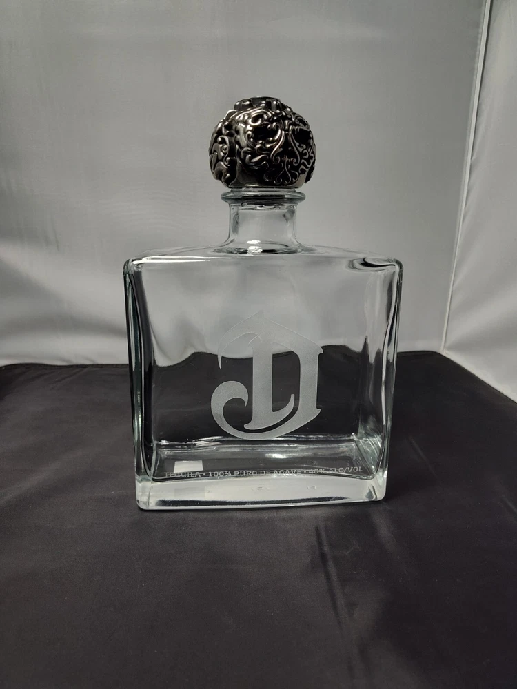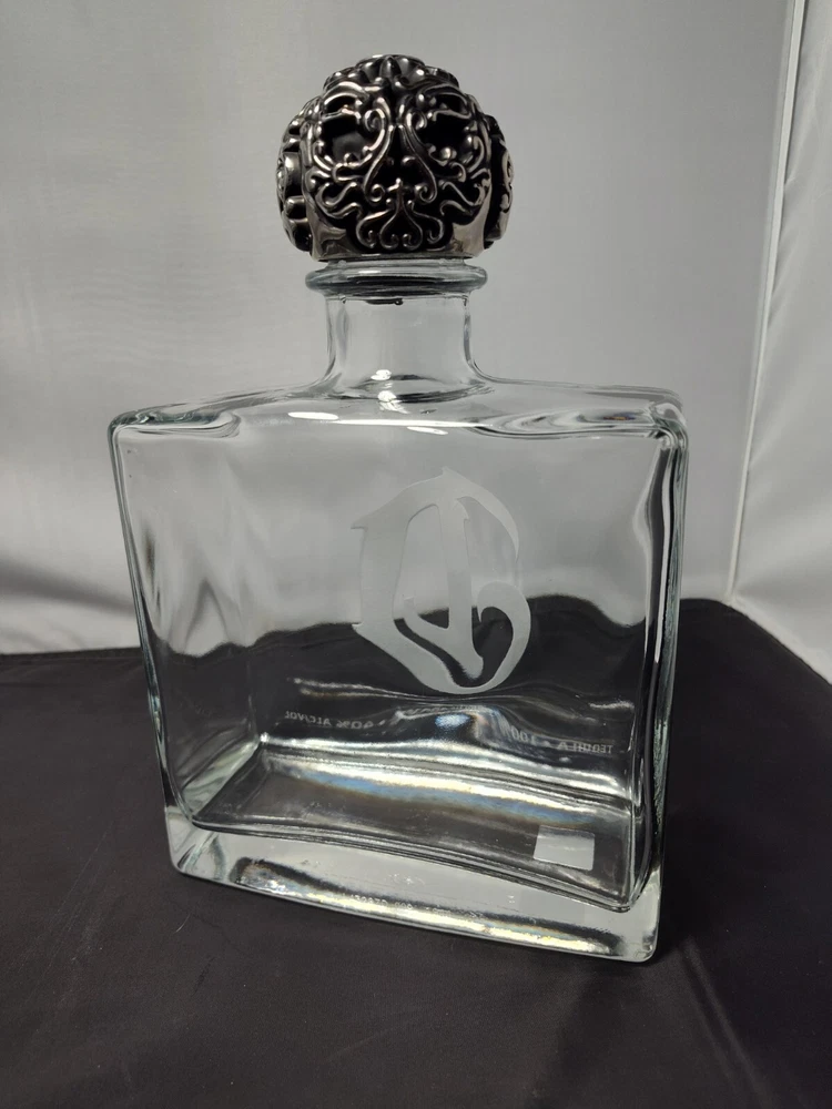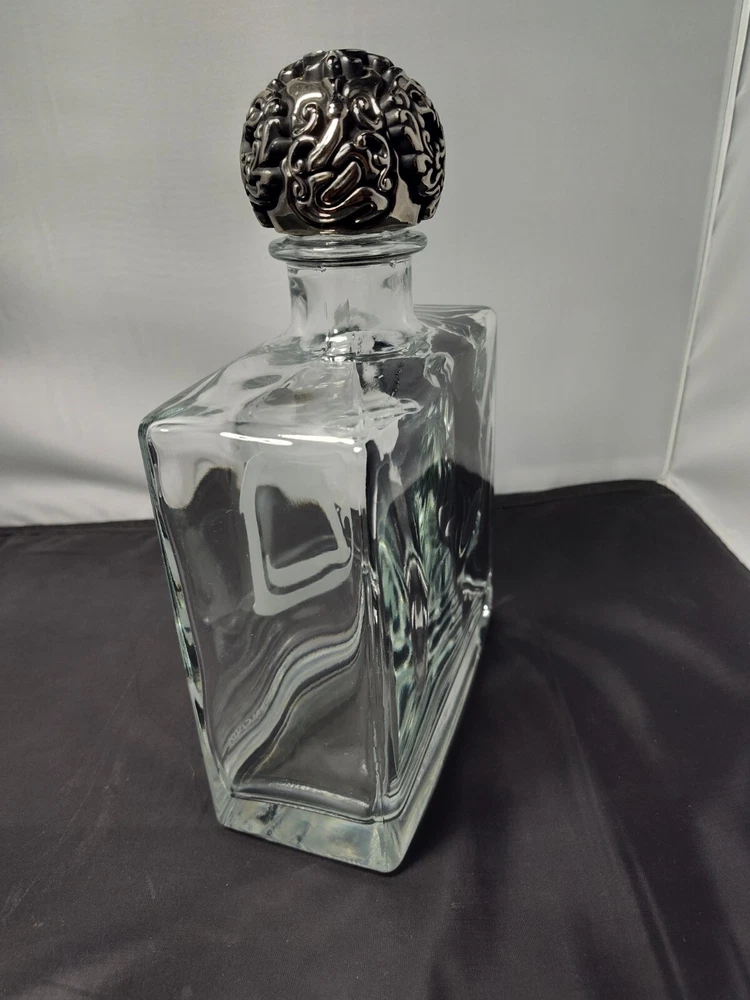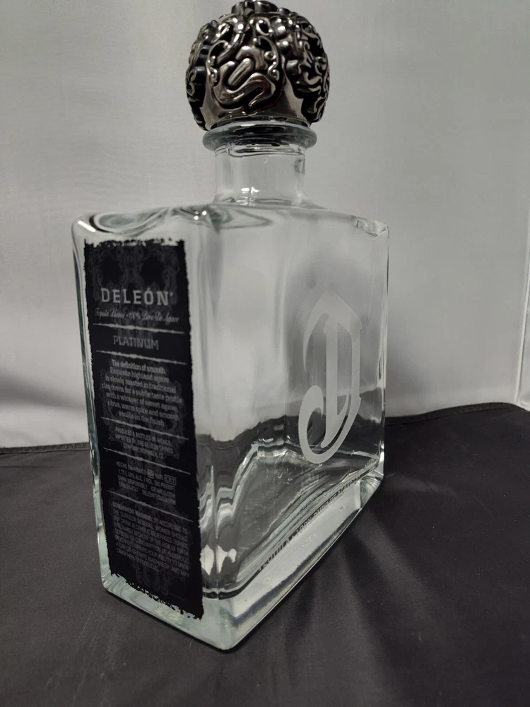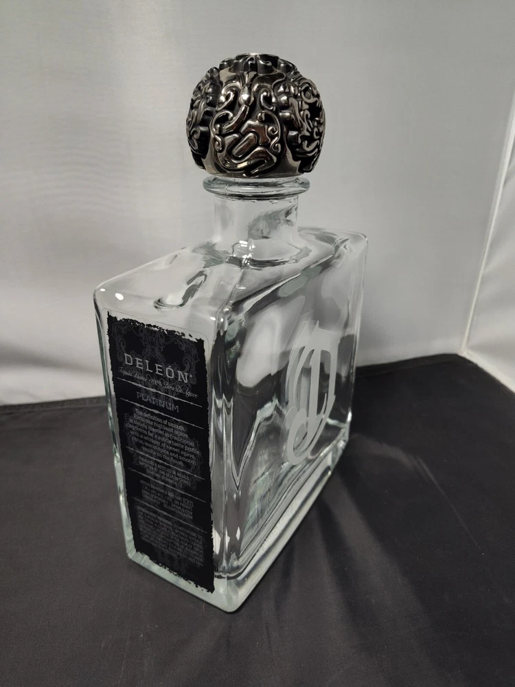 This stunning DELEON silver tequila blanco decanter is a must-have for any barware collection. With a 1.75 Liters capacity, it is perfect for storing your favorite tequila or any other spirits. The exterior of the decanter features a sleek silver color with a diamond-shaped design that adds a touch of elegance to your bar setup. The DELEON brand is known for its high-quality products, and this decanter is no exception. It is made of durable silver material and comes with a set of glasses, making it perfect for serving your drinks in style. Whether you're a collector or just looking for a stylish addition to your bar, this decanter is sure to impress.