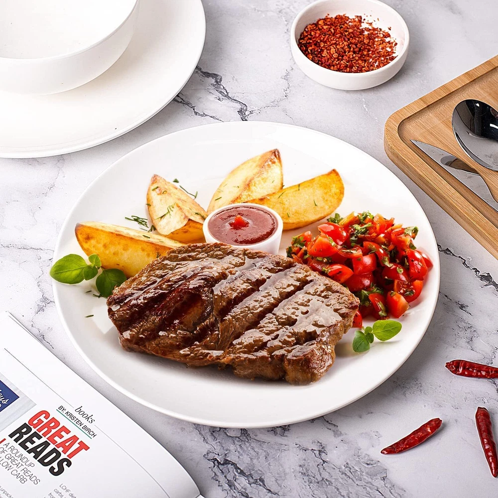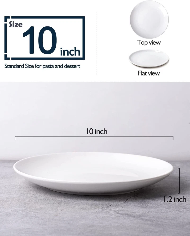 Why Do You Choose Delling 10in Dinner Plates? Light Weight Ultra lightweight and extra strength for your convenience Collect Dishes for a complete Set If you want all your dishes to match, our collection has all the pieces. Our tableware makes for a beautiful and complete set Stacks Perfectly Fits in any cabinet, and looks good while doing it Makes a Great Gift Whether it's a gift for yourself or for someone you love, our packaging ensures a beautiful aesthetic the second it arrives at your door ELEGANT WHITE - White dinnerware is perfect for everyday used, as well as more formal occasions. Crisp, bright and classic, this white dinner plates is as versatile as it is timeless. Complement existing kitchen and dining décor, not only delights the guests, but also delights us, who carefully prepare the food. LARGE SIZE & VERSATILE - Delling 10 inch white dinner plates can be used to serve all sorts of meals, comes breakfast, lunch, or dinner. Ideal for main course pasta, salad, dessert, sandwiches and steak, even for foods with soup. They are large enough with a slightly flared rim to prevent food from spilling off the plate. HEALTHY & STURDY - 100% bovine bone china, highly resist chips and cracks. Made of sturdy and durable porcelain, more suitable for long-term use by adults and children. Thickened design, impact resistance, hold more firmly, will not be easily broken. STACKABLE & EASY TO CLEAN - These plates are stackable and don't take up a lot of space in your cupboard. Smooth and easy to clean, you can wash them with soap and hot water or place them into your dishwasher. Dishwasher, microwave, and preheated-oven safe up to 450 degrees. WELL PACKAGED FOR GIFT - In order for you to receive the plates in perfect condition, we will use impact-resistant foam to protect the plates. Don’t hesitate, they also could be a gift for holidays such as Mother's Day, Christmas or Thanksgiving.