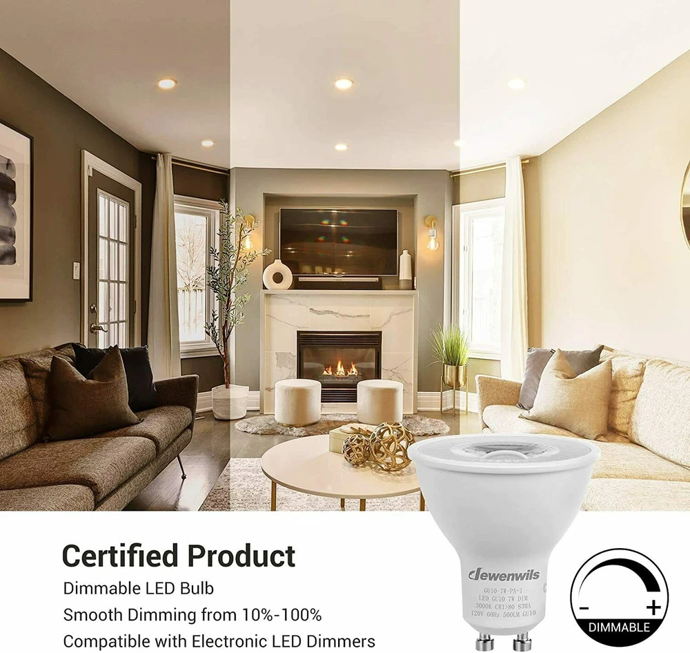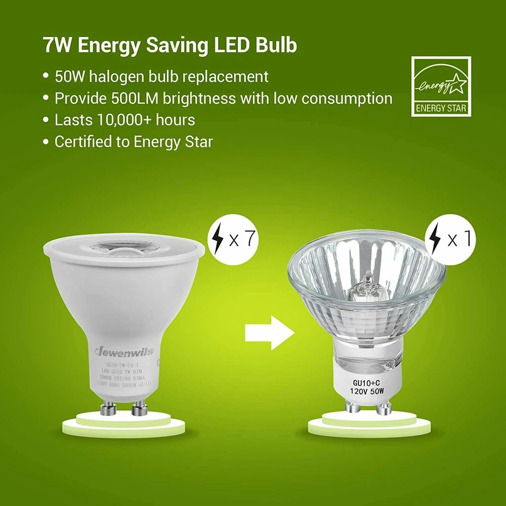 DEW ENWILS 10-Pack/6-Pack GU10 LED Dimmable Bulb, 500LM, 5000K/3000K Warm White Daylight Track Light Bulb, 7W(50W Halogen Equivalent) LED Bulbs, UL Listed 3000K 10 Pack LED Dimmable Bulb-GU10 Base 3000K Warm White DEWENWILS GU10 base spotlights are aimed to replace your current 50-Watt halogen ones, these 7W LED bulbs are rated to last 10, 000 hours, much longer lifespan than the equivalent incandescent lights, saving your money and time. Can be fully dimmable, works with any dimmer switch(NOT included), adjust its brightness to meet any occasion. Choose a dependable high quality 120-Volt GU10 bulb for residential or commercial applications. Size: 1.96*2.16 inch Wattage: 7W(50w equivalent) Lumen: 500LM Beam Angle: 40 degree Package: 10 Pack Color Temperature: Warm White(3000K) 6 Pack LED Dimmable Bulb-GU10 Base 3000K Warm White DEWENWILS GU10 base spotlights are aimed to replace your current 50-Watt halogen ones, these 7W LED bulbs are rated to last 10, 000 hours, much longer lifespan than the equivalent incandescent lights, saving your money and time. Can be fully dimmable, works with any dimmer switch(NOT included), adjust its brightness to meet any occasion. Choose a dependable high quality 120-Volt GU10 bulb for residential or commercial applications. Size: 1.96*2.16 inch Wattage: 7W(50w equivalent) Lumen: 500LM Beam Angle: 40 degree Package: 6 Pack Color Temperature:Warm White(3000K) Voltage: 120V AC 5000K 10 Pack LED Dimmable Bulb-GU10 Base 5000K Color Temperature DEWENWILS GU10 base spotlights are aimed to replace your current 50-Watt halogen ones, these 7W LED bulbs are rated to last 10, 000 hours, much longer lifespan than the equivalent incandescent lights, saving your money and time. Can be fully dimmable, works with any dimmer switch(NOT included), adjust its brightness to meet any occasion. Choose a dependable high quality 120-Volt Gu10 bulb for residential or commercial applications. Size: 1.96*2.16 inch Color Temperature: Daylight White(5000K) Wattage: 7W(50w equivalent) Lumen: 500LM Beam Angle: 40 degree Package: 10 Pack 6 Pack LED Dimmable Bulb-GU10 Base 5000K Color Temperature DEWENWILS GU10 base spotlights are aimed to replace your current 50-Watt halogen ones, these 7W LED bulbs are rated to last 10, 000 hours, much longer lifespan than the equivalent incandescent lights, saving your money and time. Can be fully dimmable, works with any dimmer switch(NOT included), adjust its brightness to meet any occasion. Choose a dependable high quality 120-Volt Gu10 bulb for residential or commercial applications. Size: 1.96*2.16 inch Color Temperature: Daylight White(5000K) Wattage: 7W(50w equivalent) Lumen: 500LM Beam Angle: 40 degree