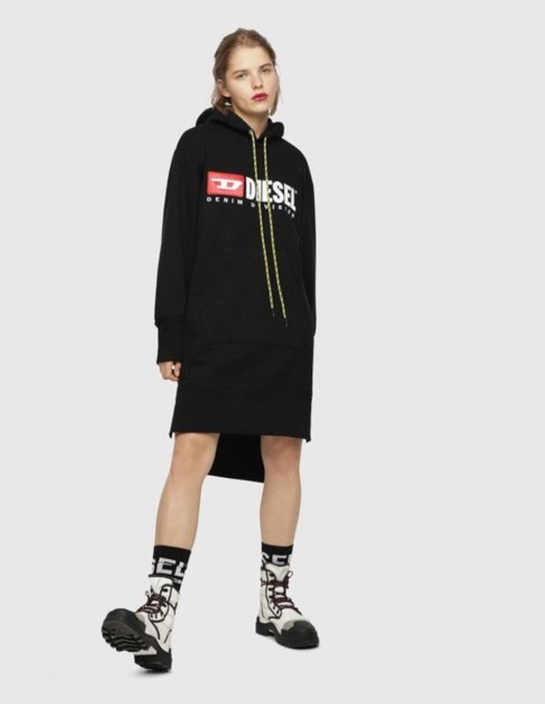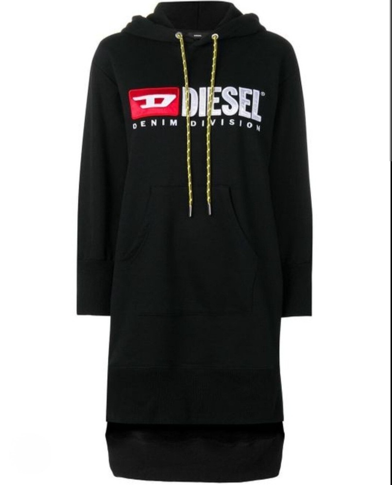 Elevate your casual wardrobe with this stylish Diesel hoodie dress. The perfect combination of comfort and fashion, this oversized jumper features a hooded neckline, long sleeves and an embroidered logo accent. Made from high-quality cotton material, it's machine washable for easy care. This black hoodie dress is ideal for the colder seasons, with its autumn, winter and spring features. Perfect for a relaxed fit, it's great for casual occasions and can be personalised with no instructions. Whether you're out for a casual meet up or just lounging at home, this hoodie dress is the perfect addition to your wardrobe.