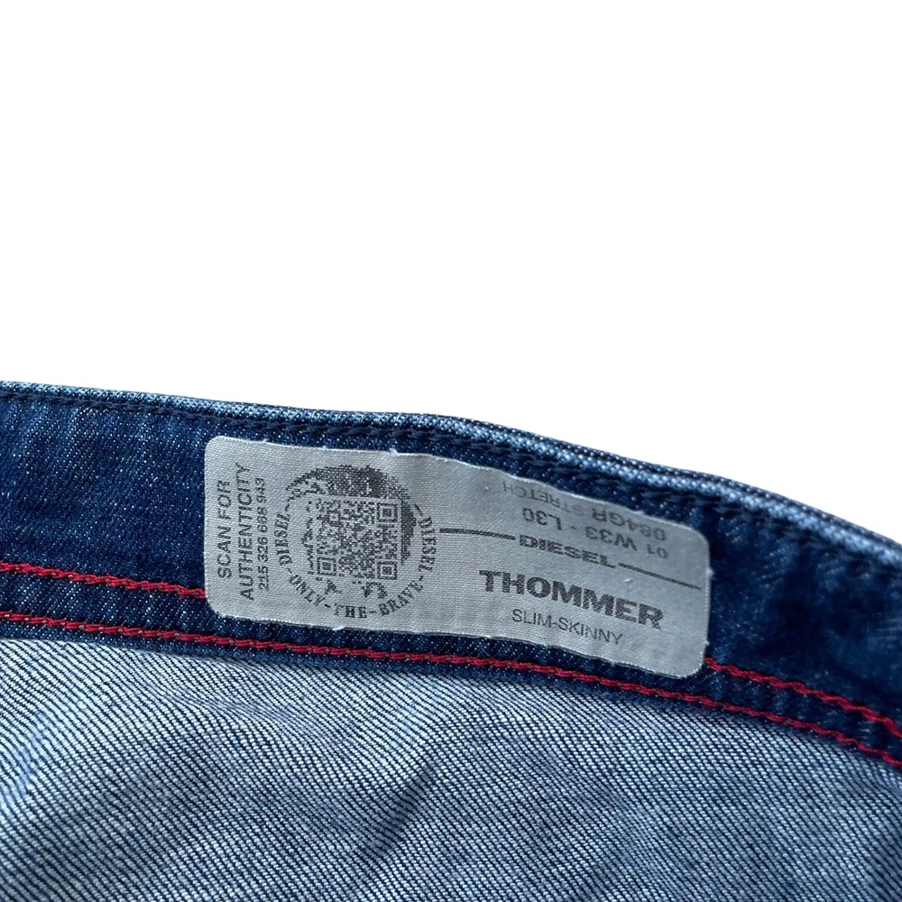 Model: Diesel Thommer Inside Leg: 30 in Size: 33 Fabric Type: Denim Material: Cotton Blend Department: Men Type: Jeans Fit: Slim Closure: Zip Features: Stretch Waist Size: 33 in Brand: Diesel Colour: Blue Style: Skinny Size Type: Regular Fabric Wash: Dark