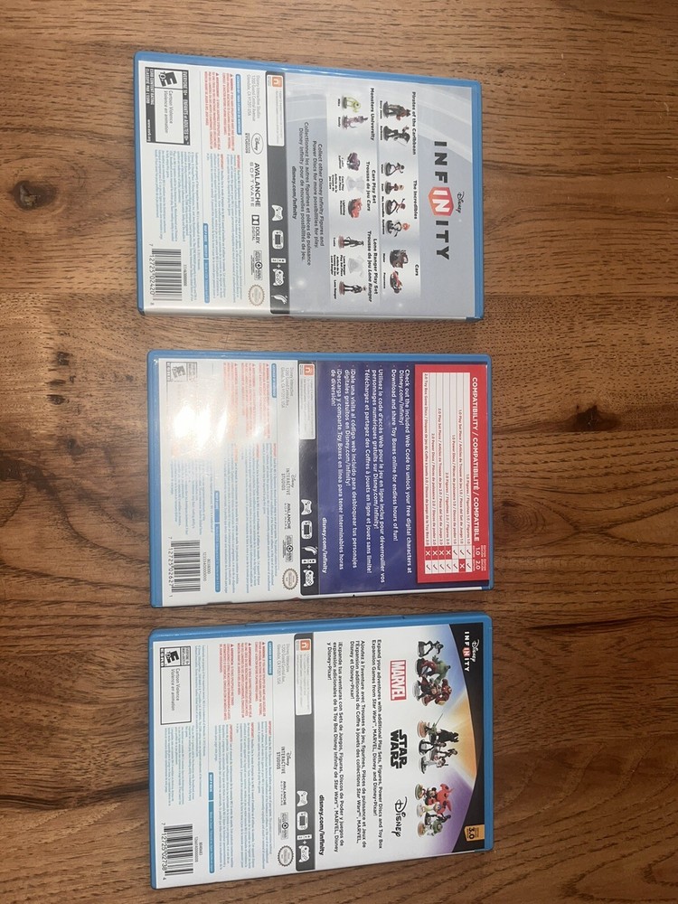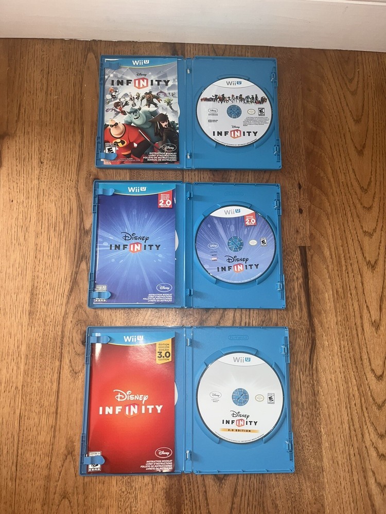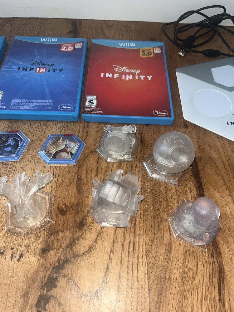 DISNEY INFINITY Bundle Includes: Disney Infinity 1.0, 2.0, and 3.0 Disney Infinity Portal and Cord 1.0 world (3 in 1) Monsters University, Incredibles, Pirates of the Caribbean 2.0 world (1) Avengers (1) Guardians of the Galaxy 3.0 world (1) Avengers (1) A New Hope (1) Clone Wars (1) The Force Awakens 2 Minigames 1 Powerdisk