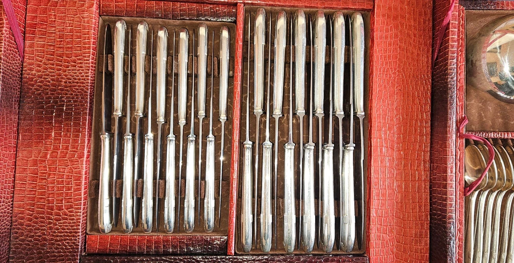 Tous mes objets sont soit des objets anciens de brocante ou antiquités, soit des objets d’occasion plus ou moins récents. A ce titre, ils ont des marques du temps et d’usage que j’essaye de signaler au mieux en mettant plusieurs photos et en décrivant l’objet. Je vous demande donc par avance de bien lire le descriptif et regarder les photos qui font partie de la description des objets. Si vous avez besoin d’informations ou de photos complémentaires, n’hésitez pas à m’écrire suffisamment tôt avant la fin de la vente pour demander des précisions , en me laissant votre adresse e-mail pour la réponse et l’envoi de photos complémentaires. Objet N° : 9683 Maison d'Orfèvrerie DIXI : Ménagère en métal argenté composée de 61 pièces d'un très élégant modèle art déco présentée dans son coffret d'origine. Bon état d’argenture avec micro-rayures habituelles et normales sur du métal argenté qui a été utilisé, cette ménagère a été très bien entretenue. Composition de la ménagère : * 12 Couteaux de Table : Poinçon " 18 G - DIXI " Lames marquées " DIXI INOX " Longueur : 24,5 cm environ. Poids d'1 : +/- 95 grammes environ. * 12 Couteaux à fromage : Poinçon " 12 G - DIXI " Lames marquées " DIXI INOX " Longueur : 20,5 cm environ. Poids d'1 : +/- 54 grammes environ. * 12 Fourchettes de Table : Poinçons " COUVERTS DIXI " et " 100 G - DIXI " Longueur : 19,8 cm environ. Poids d'1 : +/- 82 grammes environ. * 12 Cuillères à soupe : Poinçons " COUVERTS DIXI " et " 100 G - DIXI " Longueur : 20,2 cm environ. Poids d'1 : +/- 90 grammes environ. * 12 Cuillères à café / dessert : Poinçons " COUVERTS DIXI " et " 24 G - DIXI " Longueur : 13,5 cm environ. Poids d'1 : +/- 33 grammes environ. * 1 Louche à potage : Poinçon " 12 G - DIXI " Longueur : 31,5 cm environ. Poids : 278 grammes environ. Poids Total Coffret garni : +/- 6.850 grammes environ. Un envoi de plusieurs objets groupés dans un même colis est envisageable dans le monde entier si le montant de la commande est suffisamment important et si le colis est réalisable (selon poids et dimensions), n’hésitez pas à me contacter si vous désirez acheter plusieurs lots en m’indiquant les références pour une étude personnalisée. N’hésitez pas à consulter ma boutique et tous mes objets en vente !