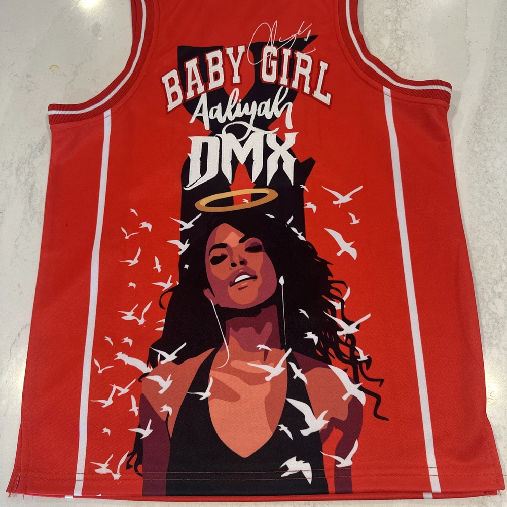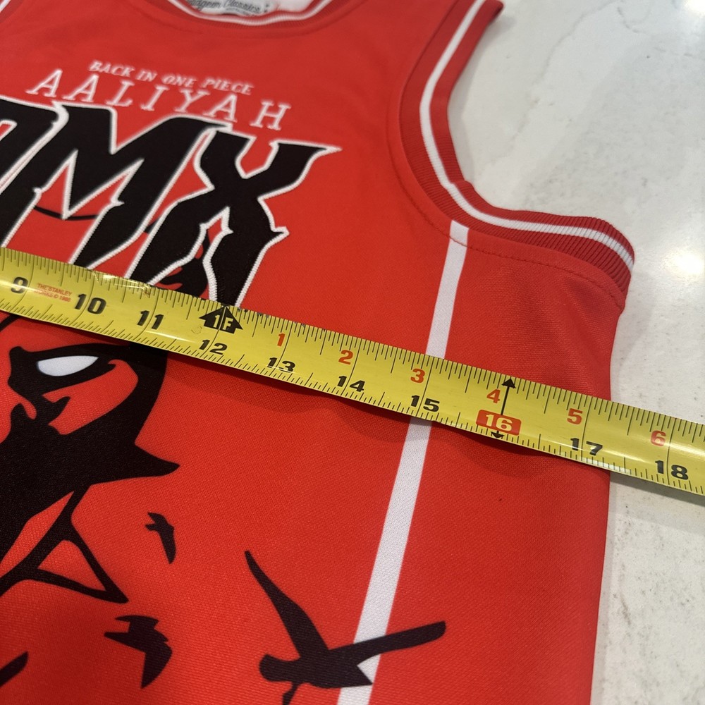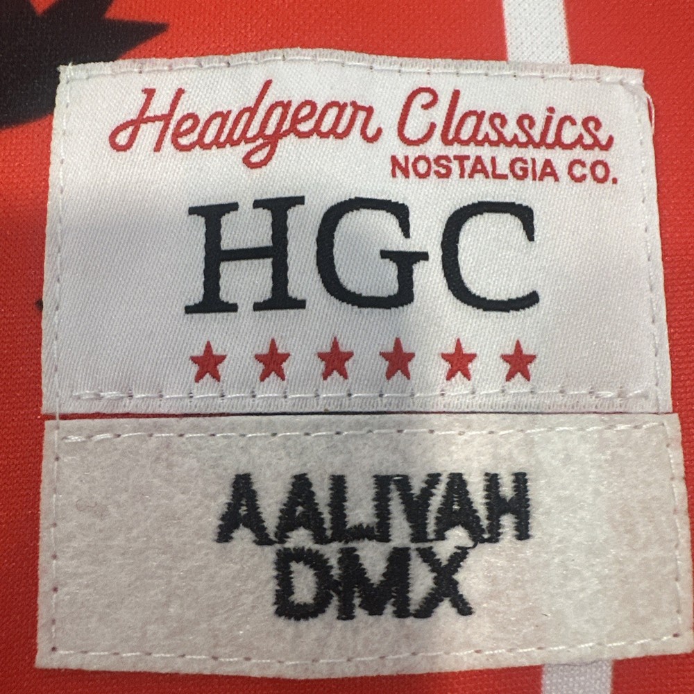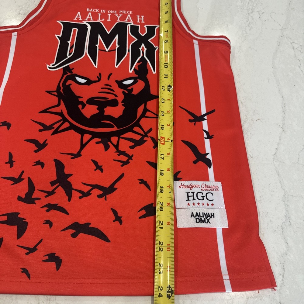 The product is a brand new men's small DMX and Aaliyah headgear classics jersey with tags. It features a red and black graphic print with a round neck and sleeveless design, making it suitable for activewear occasions like basketball. Made of polyester jersey fabric, this pullover jersey from Headgear Classics is breathable, offering a regular fit for comfortable wear. The iconic DMX and Aaliyah characters add a unique touch to this stylish and classic tank top.