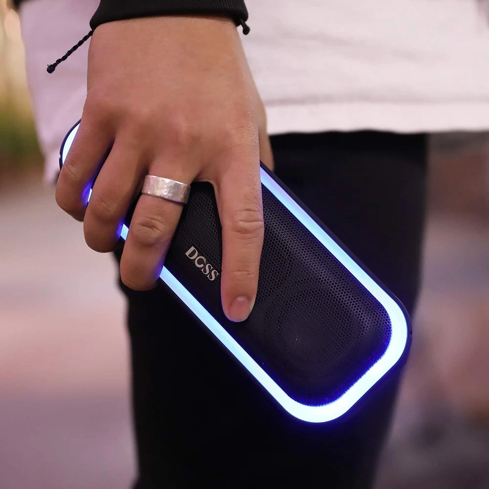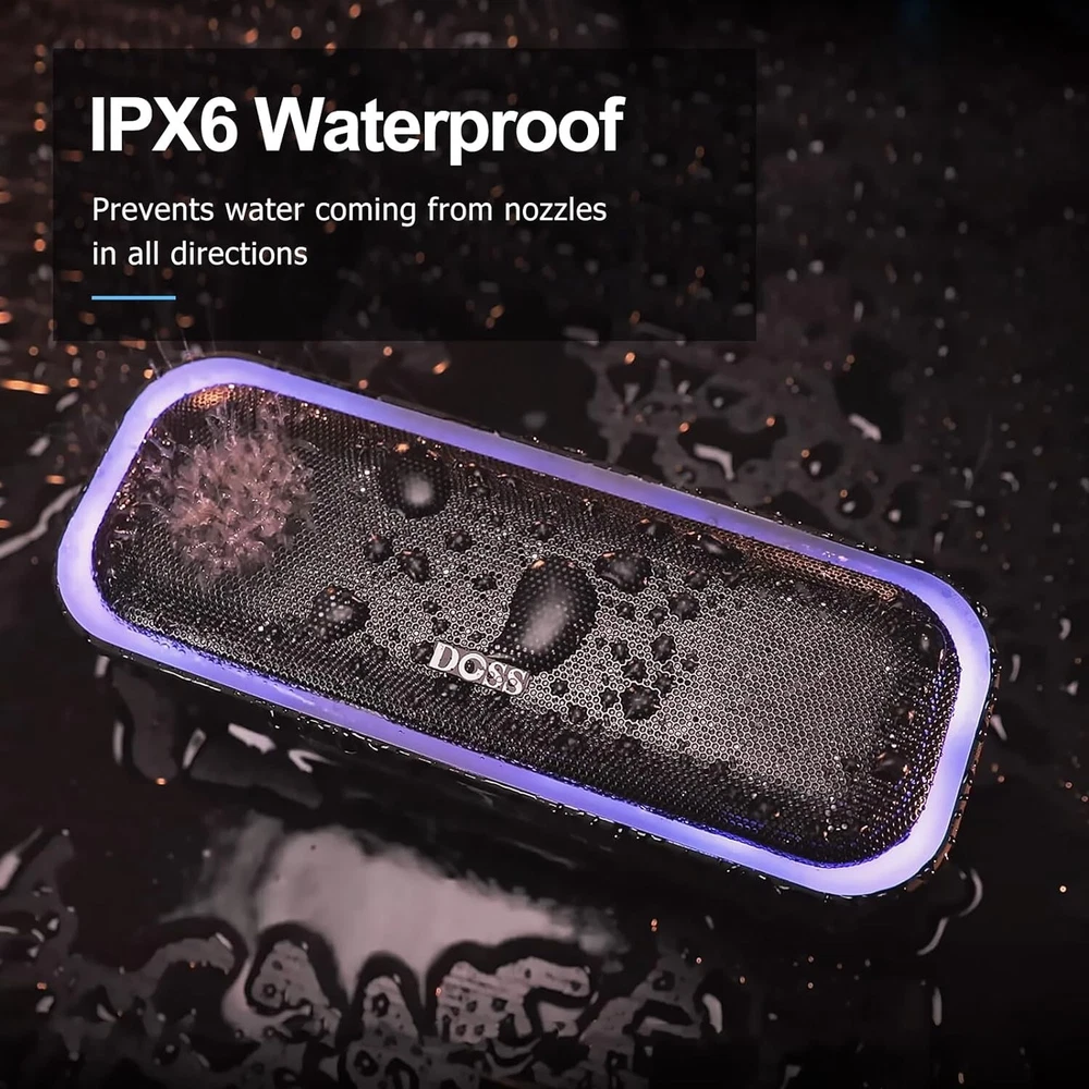 About this item Powerful Stereo Sound: Two full-range drivers and dual passive radiators produce 20W stereo sound with enhanced bass, tight mids and crystal clear highs without distortion at any volume. Active Extra Bass: Get more bass and volume louder by single pressing the extra bass button. Enjoy the big punch beat filling each corner of your room with this bass Bluetooth speaker. Wireless Stereo Pairing: Bring a bolder sound together for a bigger party. Connect two SoundBox Pro wireless speakers via a single device for immersive stereo sound and double the volume. Beat-Driven Light Show: Lit up the dynamic light effects for blazing party vibes. The wonderful light reacts and phases in time with the beat, including six colors and three illumination patterns to choose from. IPX6 Waterproof: Let the DOSS Soundbox Pro waterproof Bluetooth speaker party by the poolside, at the beach, at the park, at camping, and more. With IPX6 waterproof, the speaker can resist water splash, spray, and rain. But don't soak it in water directly. Bluetooth 5.0: With the Bluetooth 5.0 technology, this bluetooth speaker compatible most bluetooth devices and connect more reliable and faster, take your seamless music to the living room, backyard, office, or anywhere.
