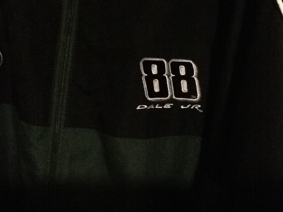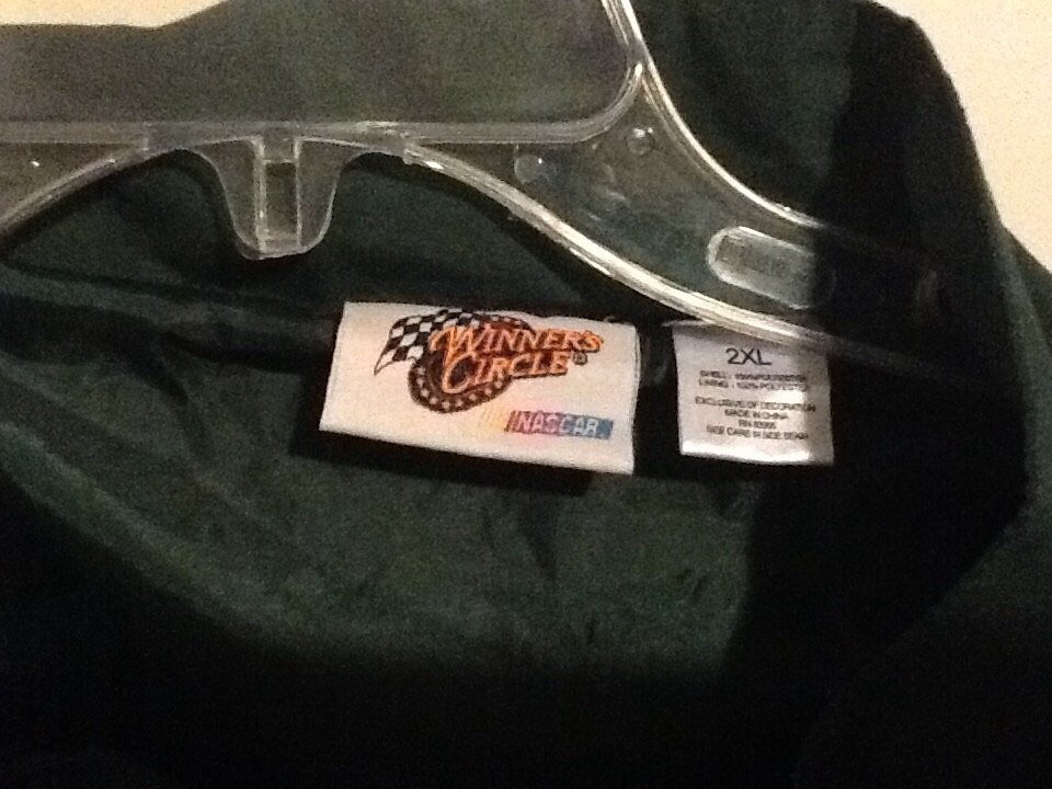 The product is a vintage Winners Circle AMP Windbreaker Jacket in size 2XL, featuring green and black colors associated with NASCAR driver Dale Earnhardt Jr and his team, Hendrick Motorsports. This full-zip jacket is designed for men who are fans of the sport and want to show their support for Dale Earnhardt Jr and his racing team. Perfect for outdoor activities or casual wear, this jacket combines style and comfort for any NASCAR enthusiast.