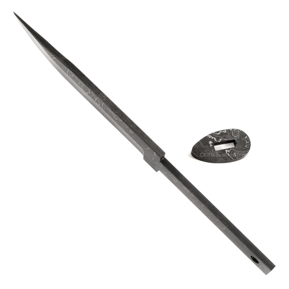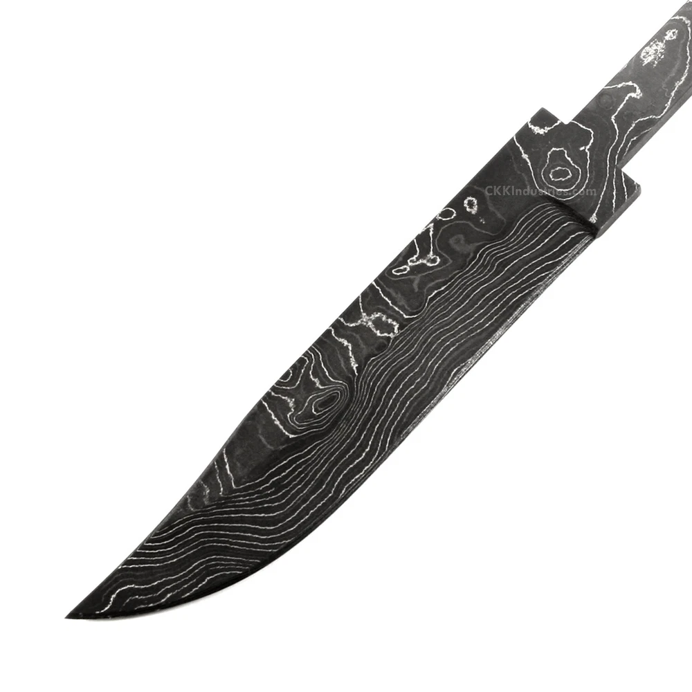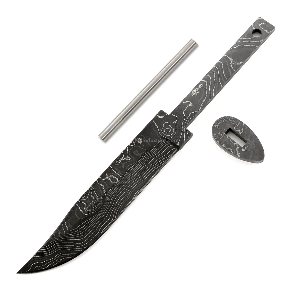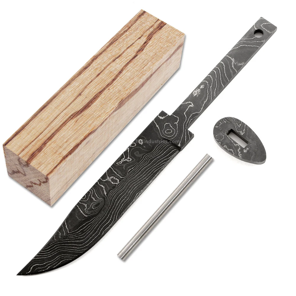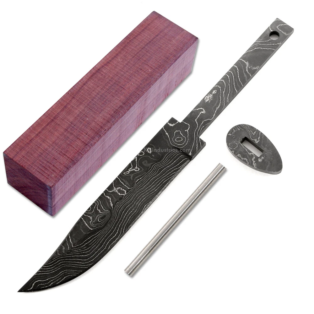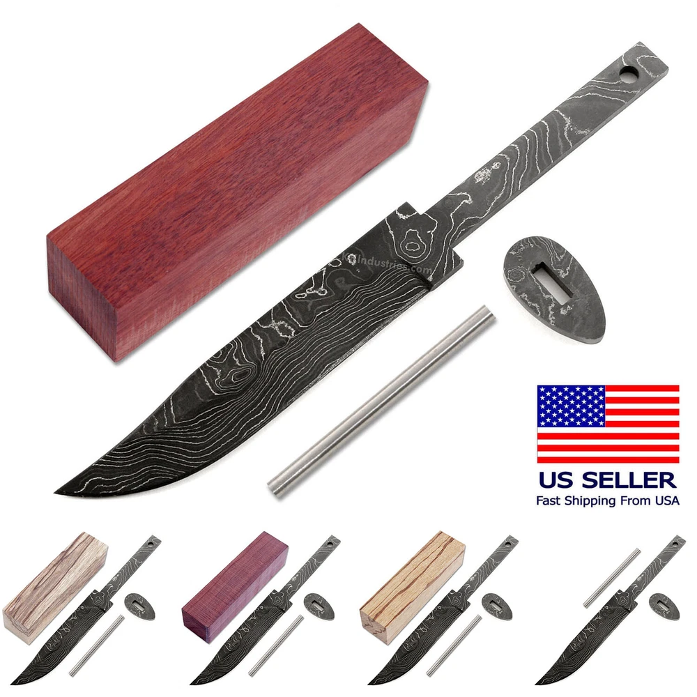 Damascus Knife Making Kit - Ridge Hunter - (4 Handle Options) - DIY Blade Kit This hidden tang hunting knife making kit is called the "Ridge Hunter". It is a USA Made damascus steel hidden tang knife blank that is hollow-ground and ready to build. This knife kit model will make a great personal hunting or skinning knife for the DIY builder. It is expertly designed, well made, and comes with a matching stainless guard & handle pinstock. With a blade length of 4-7/16 inches and an overall length of 7-7/16 inches, this damascus hunting blade blank design is a perfect sheath size. Hollow ground on both sides, the Ridge Hunter's blade is 15/16" wide. This design features (1) .187" through-hole for handle construction (stainless steel pinstock included). The tang hole can be modified with ease to work with larger pinstock, or with a threaded fastener. Specifications Blade Length = 4-7/16" Overall Length = 7-7/16" Tang Hole (1) .187" Handle Pinstock Included: Yes Heat Treated = Yes Hardness: 59-61 RC Handle Material Included: Yes (If Selected) Damascus Configuration 3 Layers 52100 4 Layers 5160 3 Layers 203E 3 Layers 15n20 Folded = 5 times Total Layers = 416 For more knife making kits, knife making supplies, and sheath making supplies, see "https://www.ebay.com/usr/ckkindustries"