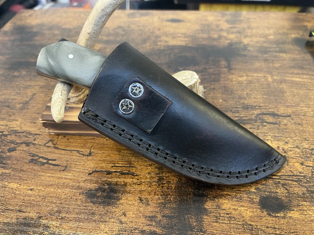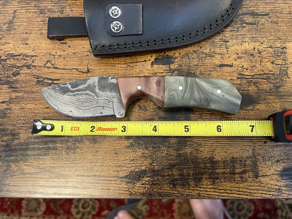 This handmade Damascus Steel Boot/Skinner Knife is a must-have for any collector or outdoor enthusiast. The knife features a full tang and plain edge blade made of high-quality damascus steel, with a beautiful ambidextrous design that makes it suitable for both left- and right-handed users. The knife also comes with a sheath, making it easy to store and transport. The knife's handle is made of durable acrylic material, providing a comfortable grip and ensuring that the knife stays securely in your hand. This knife is an original, one-of-a-kind piece, and is perfect for anyone who wants a high-quality knife that is both functional and stylish. Add this Damascus Steel Boot/Skinner Knife to your collection today! New. Never used never carried!!
