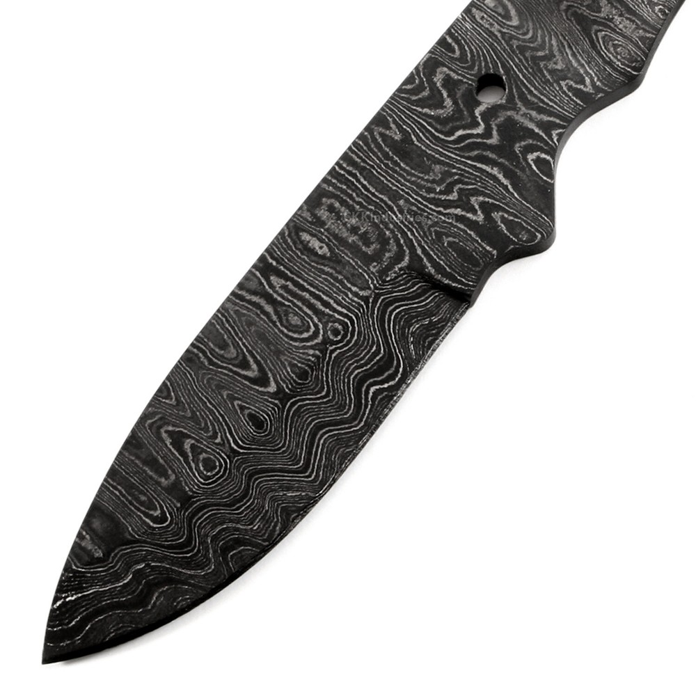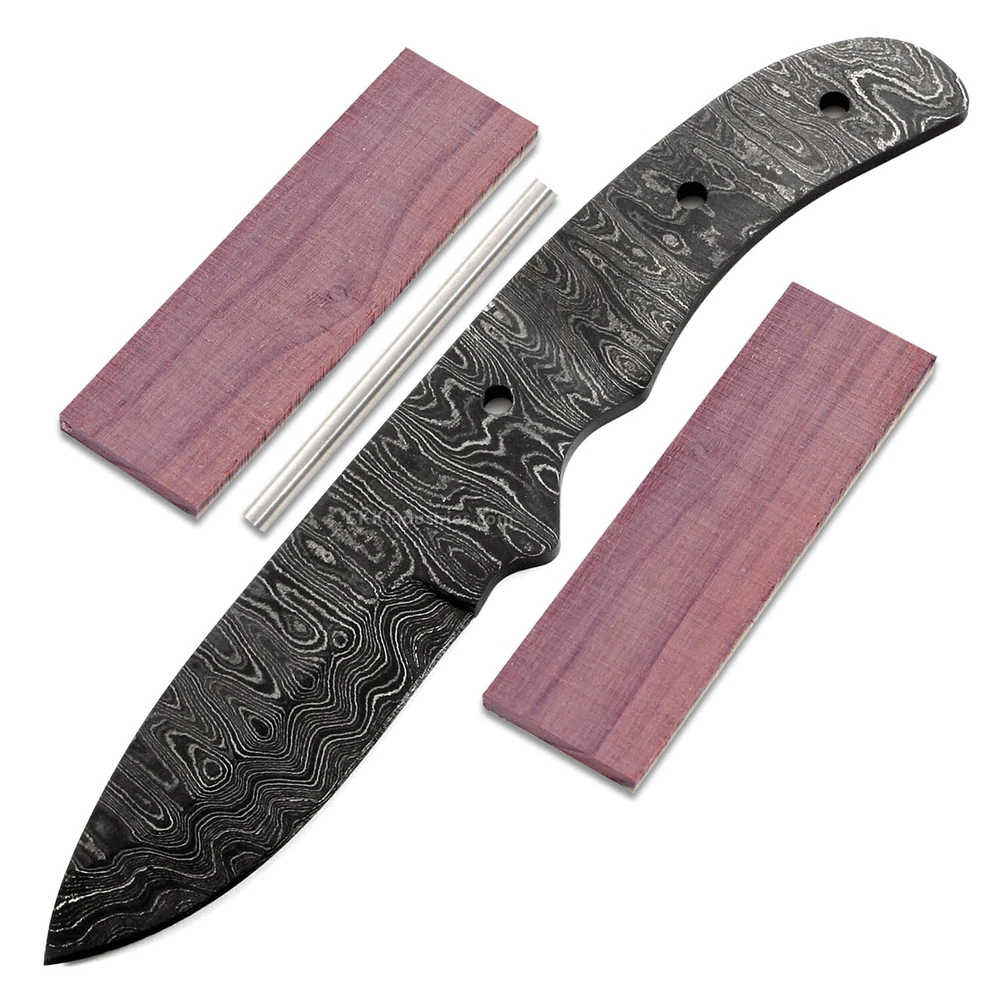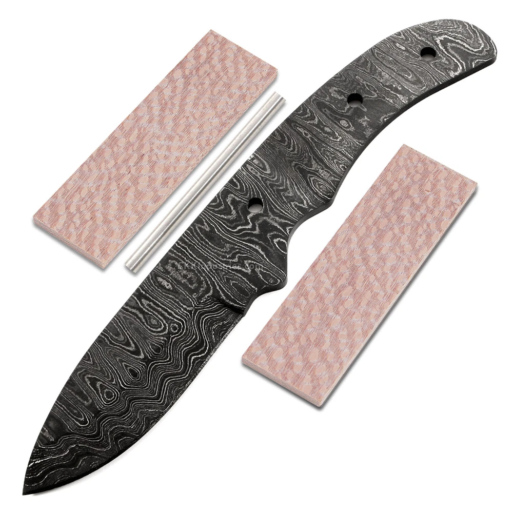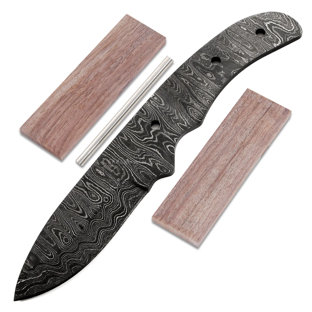 Damascus Knife Making Kit - Huntsman - (8 Handle Options) - DIY Blade Kit This damascus hunting knife making kit design is called the "Huntsman". It is a USA Made carbon steel damascus fixed blade knife blank that is hollow-ground and ready to build. This damascus blade blank model will make a fantastic personal hunting knife. The Huntsman has a blade length of 3 inches and an overall length of 8 inches. Ground on both sides, the blade is 1-1/4" wide. This damascus hunting blade blank design features (3) .187" through-holes for handle construction (stainless steel pinstock included). The tang holes can be modified with ease to work with larger pinstock, or with threaded fasteners if desired. Specifications Blade Length = 3 Inches Overall Length = 8 Inches Tang Holes (3) .187 Inches Handle Pinstock Included: Yes Heat Treated = Yes Hardness: 56-58 RC Handle Material Included: Yes (If Selected) USA Made Damascus Configuration 3 Layers 52100 4 Layers 5160 3 Layers 203E 3 Layers 15n20 Folded = 5 times Total Layers = 416 For more knife making kits, knife making supplies, and sheath making supplies, see "https://www.ebay.com/usr/ckkindustries"