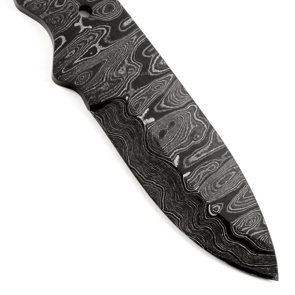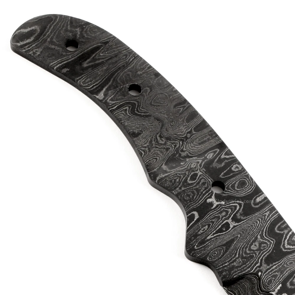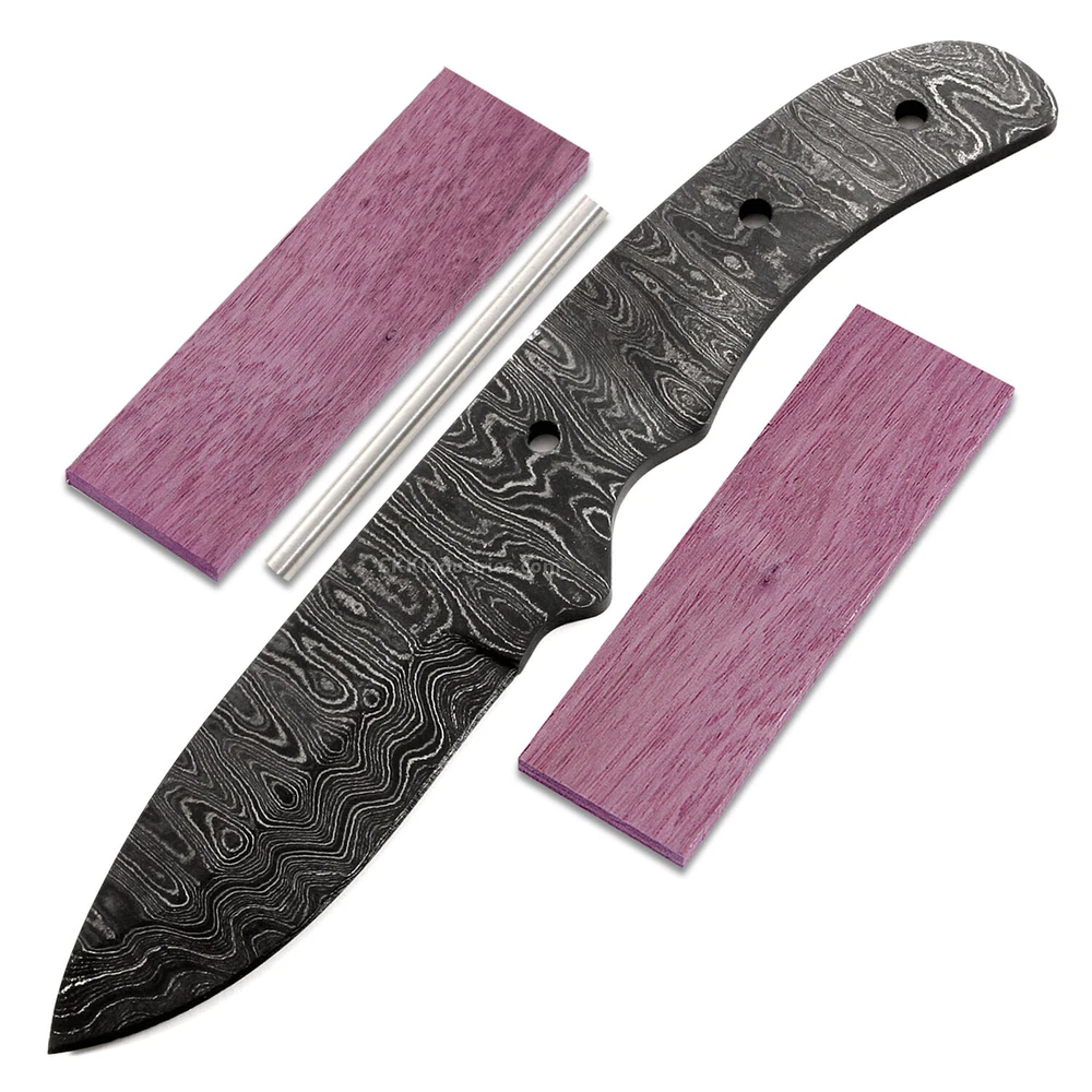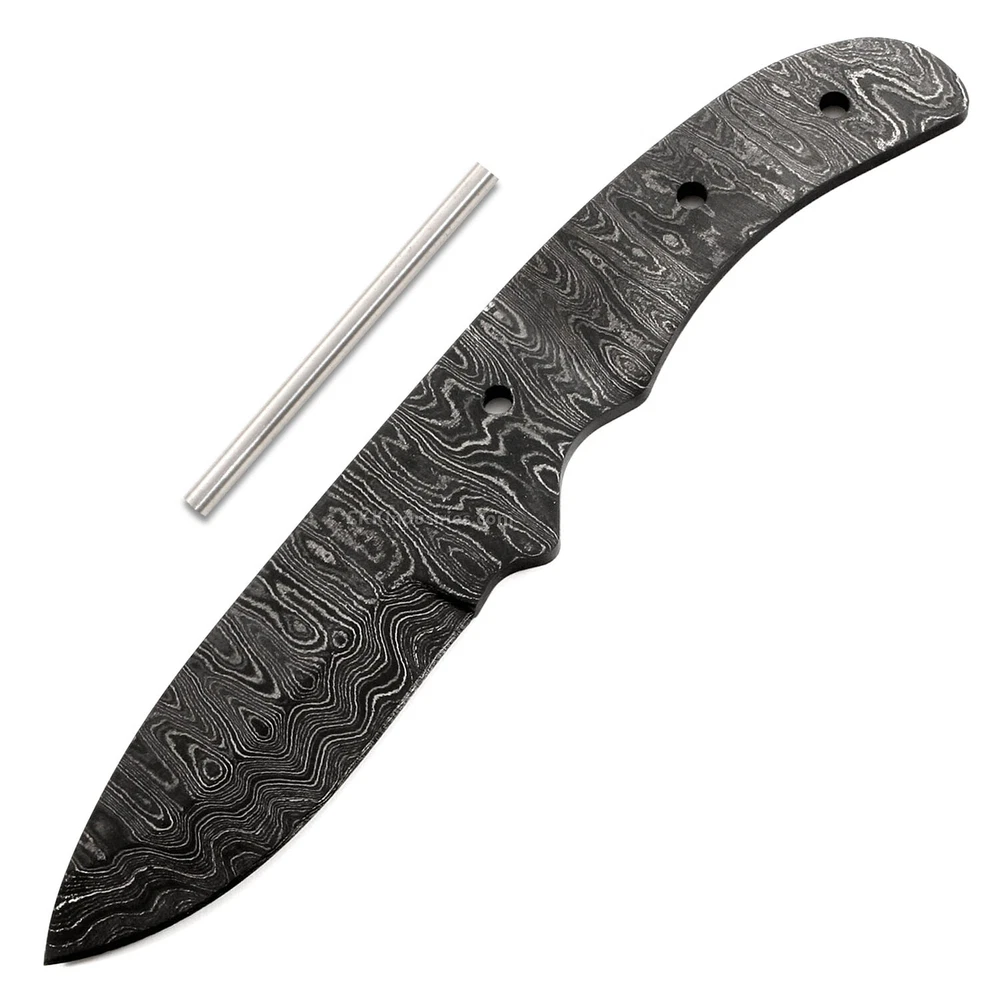 Damascus Knife Making Kit - Huntsman - (8 Handle Options) - DIY Blade Kit This damascus hunting knife making kit design is called the "Huntsman". It is a USA Made carbon steel damascus fixed blade knife blank that is hollow-ground and ready to build. This damascus blade blank model will make a fantastic personal hunting knife. The Huntsman has a blade length of 3 inches and an overall length of 8 inches. Ground on both sides, the blade is 1-1/4" wide. This damascus hunting blade blank design features (3) .187" through-holes for handle construction (stainless steel pinstock included). The tang holes can be modified with ease to work with larger pinstock, or with threaded fasteners if desired. Specifications Blade Length = 3 Inches Overall Length = 8 Inches Tang Holes (3) .187 Inches Handle Pinstock Included: Yes Heat Treated = Yes Hardness: 56-58 RC Handle Material Included: Yes (If Selected) USA Made Damascus Configuration 3 Layers 52100 4 Layers 5160 3 Layers 203E 3 Layers 15n20 Folded = 5 times Total Layers = 416 For more knife making kits, knife making supplies, and sheath making supplies, see "https://www.ebay.com/usr/ckkindustries"