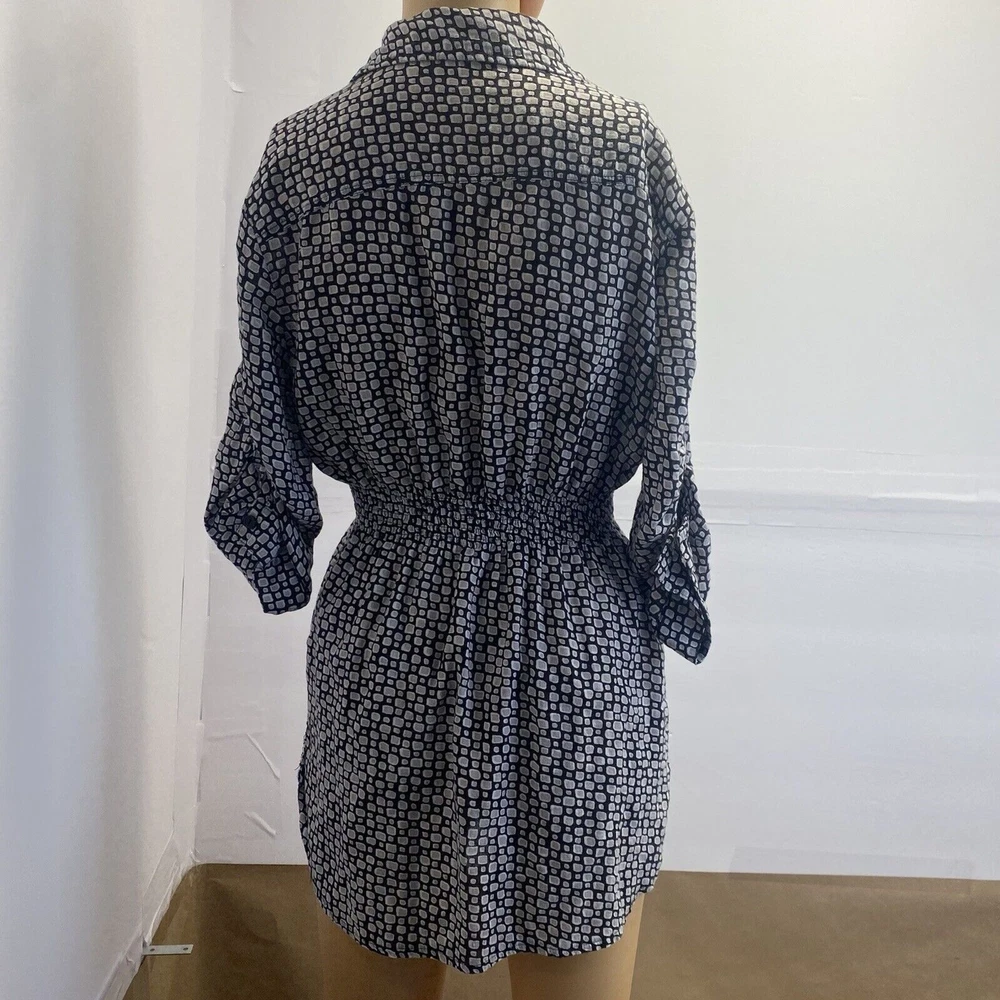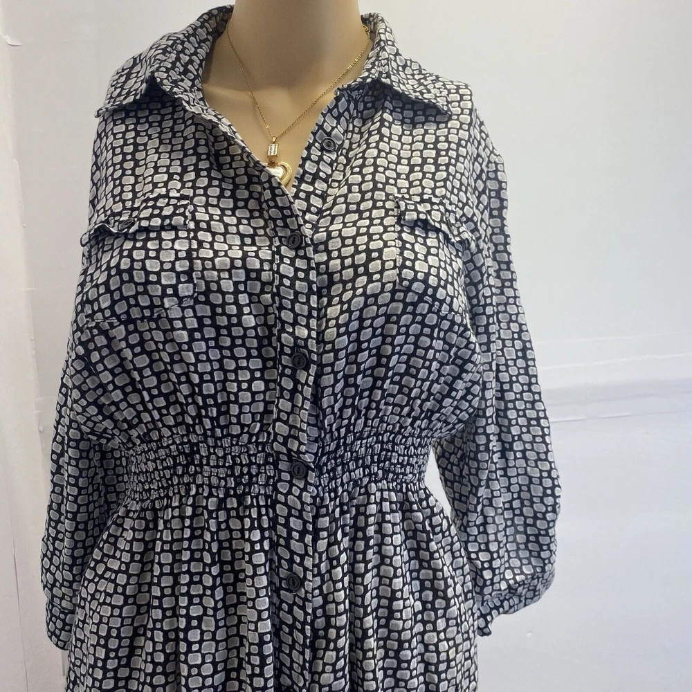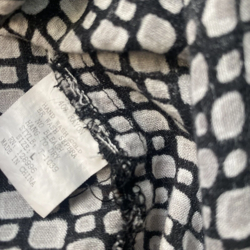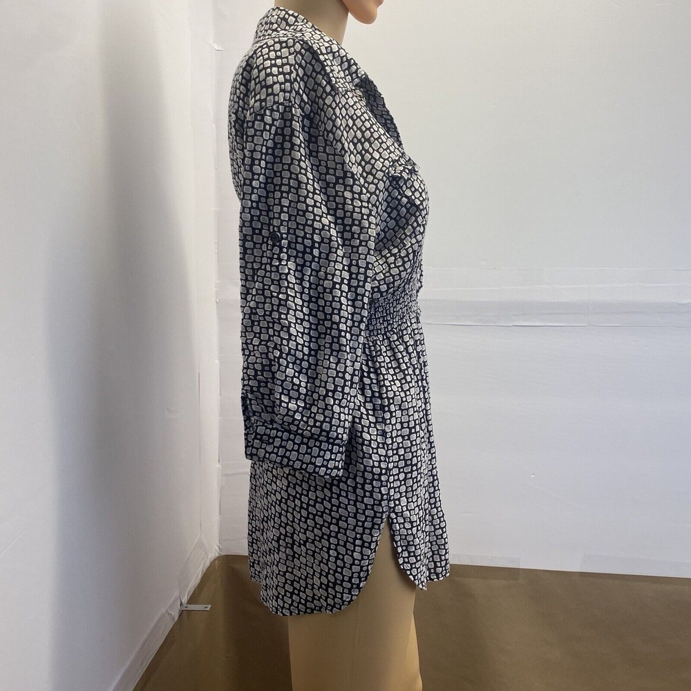 This Dani women's top is perfect for any occasion, whether it's a casual day out or a special event. The black geometric pattern and collared neckline give it a stylish look, while the 1/4 sleeves and cuffs add a touch of elegance. The elastic waist and button closure make it easy to wear and comfortable all day long. The top also features pockets, making it practical and functional for everyday use. It's made of a soft and comfortable fabric, a blend of rayon and cotton, and is machine washable for easy care. Whether you're traveling, going to a wedding, or just running errands, this top is a great addition to your wardrobe. in good condition, comes from a smoke and pet free place, check the photos for more information, you can contact us if you have questions. Please note that some photos may not show accurate shades.