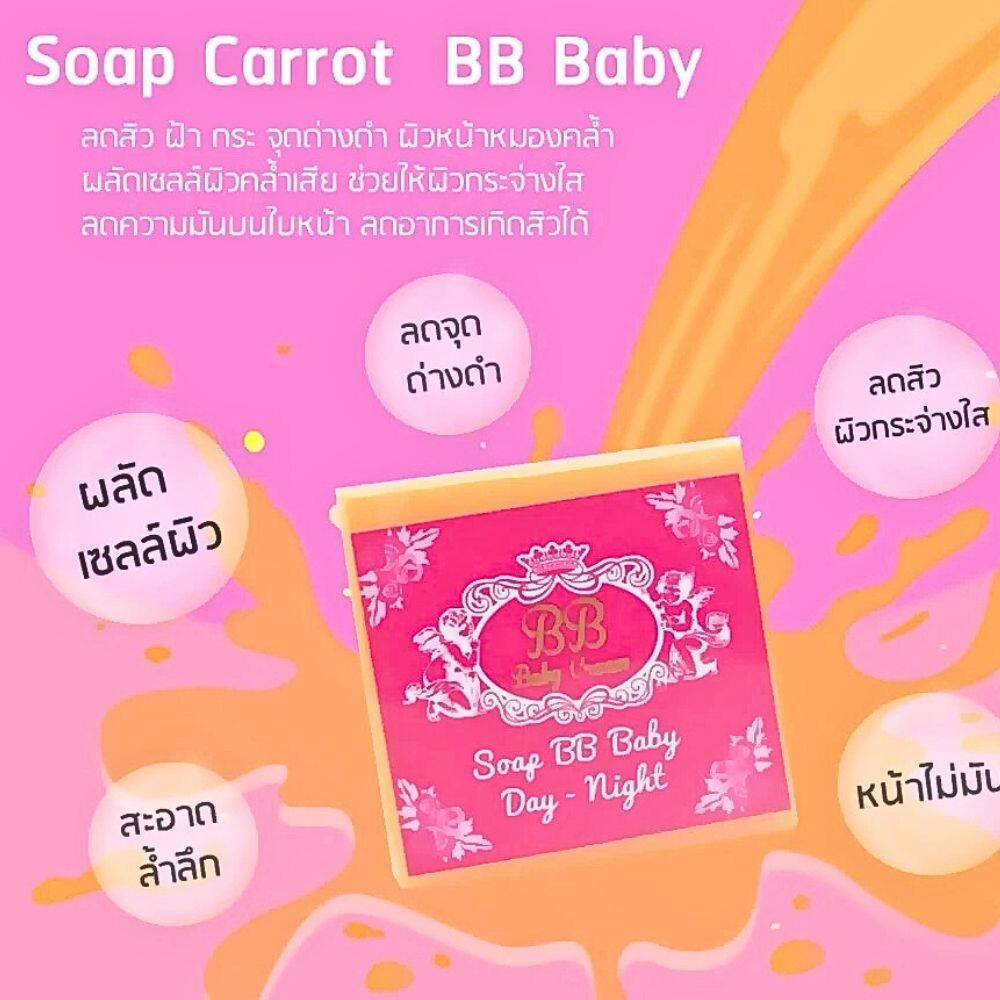 Carrot Soap bb Protect Nourish Facial Moisturizing Glowing, Reducing Wrinkles New Quantity : 1 Bar Soap BB Baby Cream Carrot Soap Wash your face thoroughly. Cleans the skin deeply How to use: Use to wash your face morning and evening Registration number: 10-1-6100019834