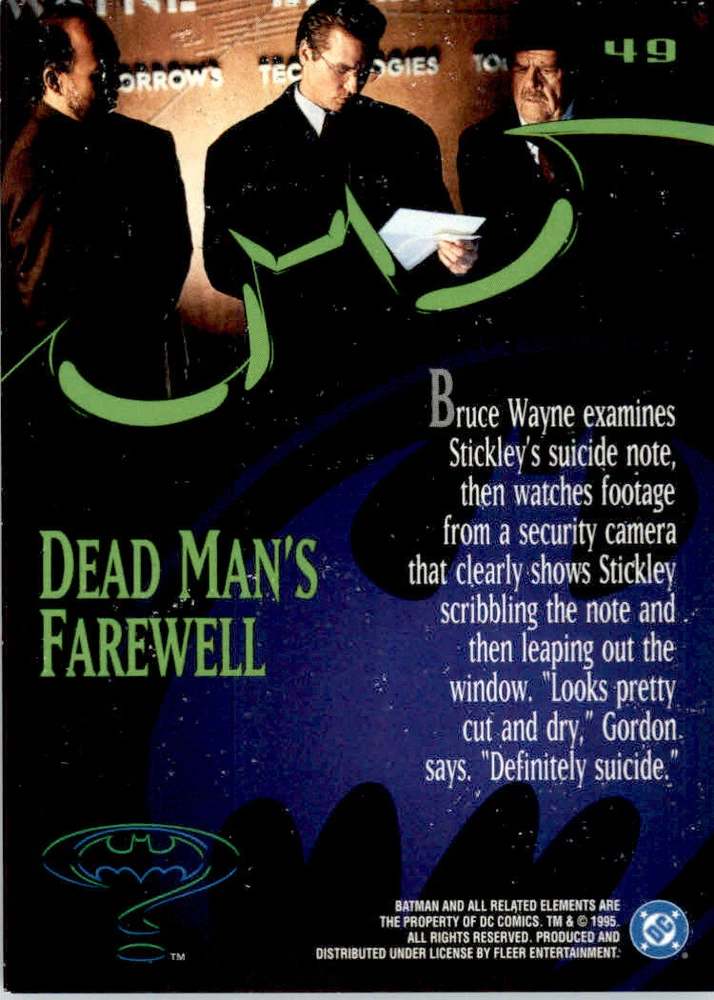 Type: Non-Sport Trading Card Autographed: No Season: 1995 Card Number: 49 Franchise: NON_SPORT Set: 1995 Ultra Batman Forever Graded: No Player/Athlete: Dead Man's Farewell Year Manufactured: 1995