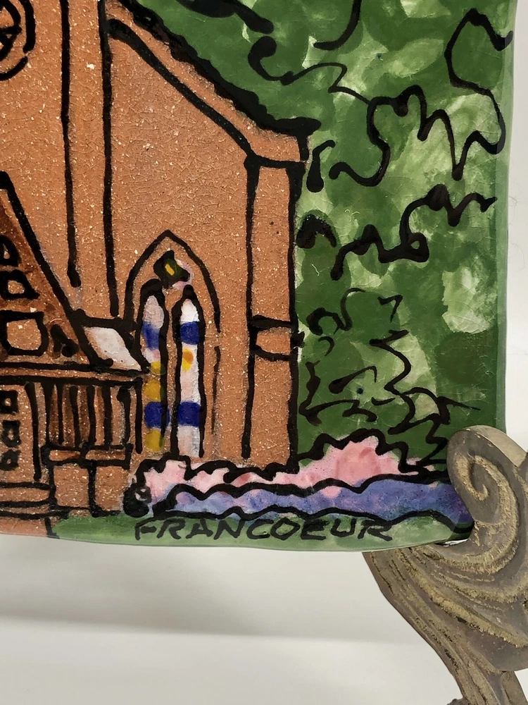 Janet Francoeur original hand painted hand crafted decorative wall tile depicting a church and gardens. The back has been covered in felt to prevent scratching, but can be easily removed. There is also a hanger on the tile for easy display. Measuring 9.5” tall, 5.75” wide, weighing 2lb 7.8 ounces. Please see all photos before purchasing. All questions are welcome and will be answered. In great condition with no chips, breaks, cracks, or repairs. Happy shopping!