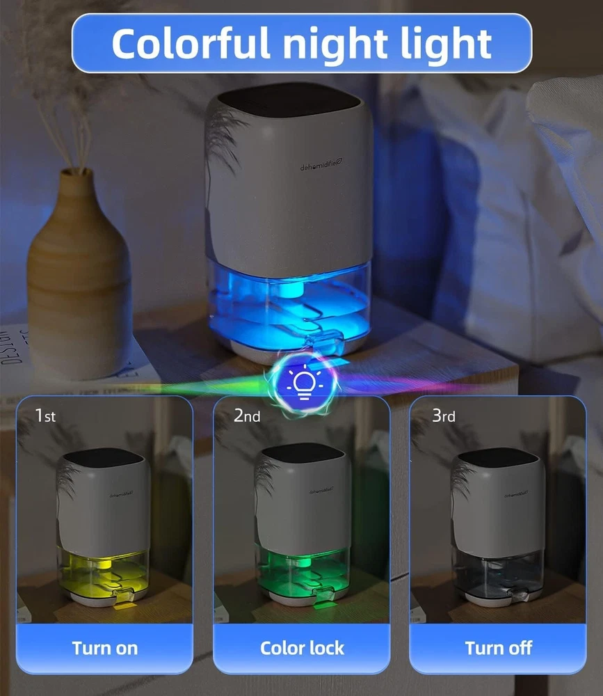 Dehumidifier, 35 OZ Small Dehumidifiers for Room for Home, Quiet with Auto Shut Off, Dehumidifiers for Bedroom 280 sq. ft, Bathroom, RV, Closet High Efficient Dehumidifiers for Home: Still annoyed about the muggy weather? Just Take it easy! have a try at 35OZ Peltier dehumidifier, in a closed small room with humid environment of 86°F and 80% RH, it can collect a max of 16oz(450ml) of water in 24 hours, and with very low energy consumption (no more than 1-kilowatt hour a day). Small Dehumidifiers with Colorful Light: There is a separate light button, which can emit 7-color romantic atmosphere lights for you, and the ultra-quiet operation (28dB) creates a comfortable and peaceful environment for your bedroom and office. 35OZ Dehumidifiers for Bathroom: With 1000ml (35OZ) large transparent tank, you can see the water collection volume of the dehumidifier in real-time, and there is a groove design at the bottom of the water tank, you can easily take it out, pour water and clean it! Auto Shut Off Protection: When the water tank is 700~800ml full, dehumidifiers will auto shut off work, and the light will flash red to inform you. It is also very safe and convenient to use when you are not at home. Portable Dehumidifier for Bedroom: With a compact size of inch and a built-in handle on the back, it is very convenient to be placed everywhere. Helping to get the excess moisture out of the air for you in bedroom, bathroom, RV, closet. Important using tips: Please keep the top air inlet and the back outlet of this dehumidifier free from blocking.