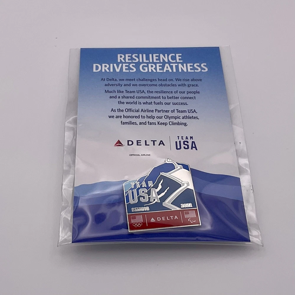 Show your support for Team USA and Delta Air Lines with this exclusive pin commemorating the 2022 Beijing Olympics. Perfect for collectors and aviation enthusiasts alike, this pin features the iconic Delta Air Lines logo alongside the USA flag and Olympic rings. Add it to your collection or wear it proudly to show your patriotism and love for flying.