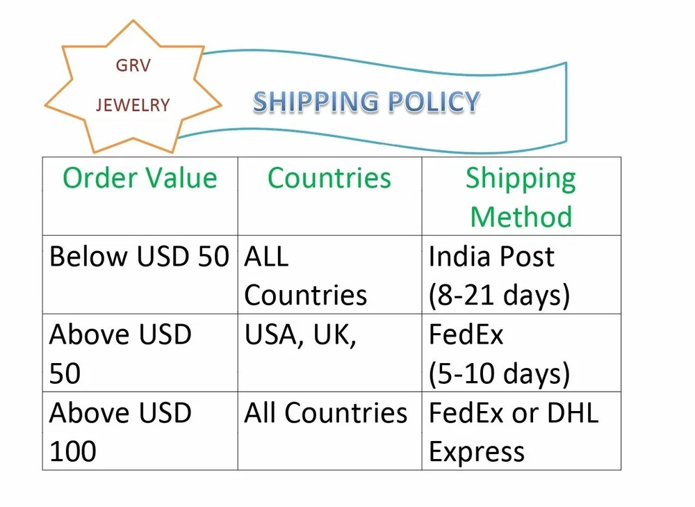 GRV JEWELRY Thanks for Looking at our Store, Here you will find wide Variety of Gemstone Jewellery. We use Natural Stones for our Jewellery. For any Information or Placing a Bulk order you may Contact us Payment Policy You can pay through any method Like Debit Card, Credit Card, PayPal, GPAY Etc Shipping Policy We ship items through India Post, DHL and FedEx to Worldwide The Delivery time is 8 to 21 Working Days from the date of Shipment as per your Location. Orders valued above USD 50 will be shipped through FEDEX for free for selected Countries Like USA, UK, Japan, Spain, Germany, France etc Return Policy We Accept Returns within 30days and item should be returned in original condition Feedback Policy We work with the aim of Customer Satisfaction so If you found any defect in product just contact us before leaving a Negative Feedback For more Beautiful Items Please View our Store HAVE A GOOD DAY EVERY DAY :)