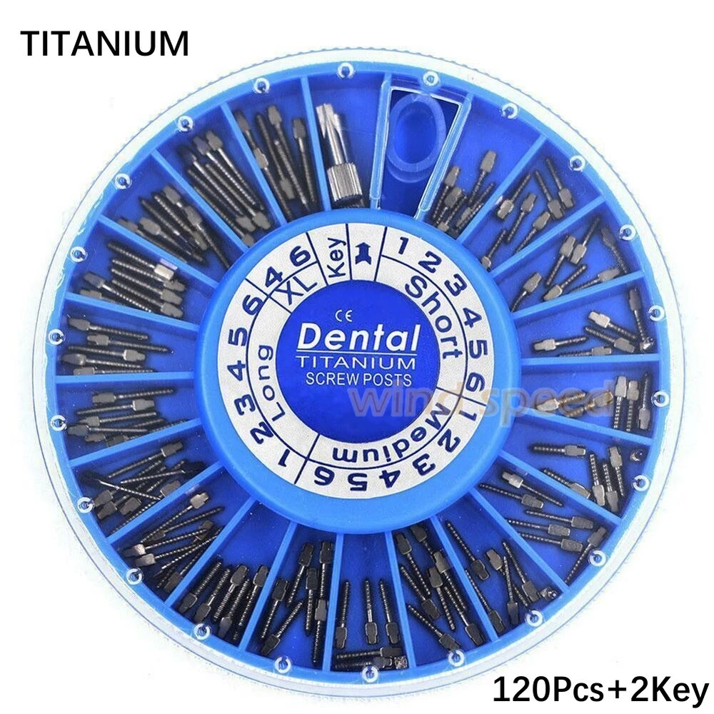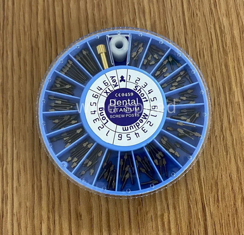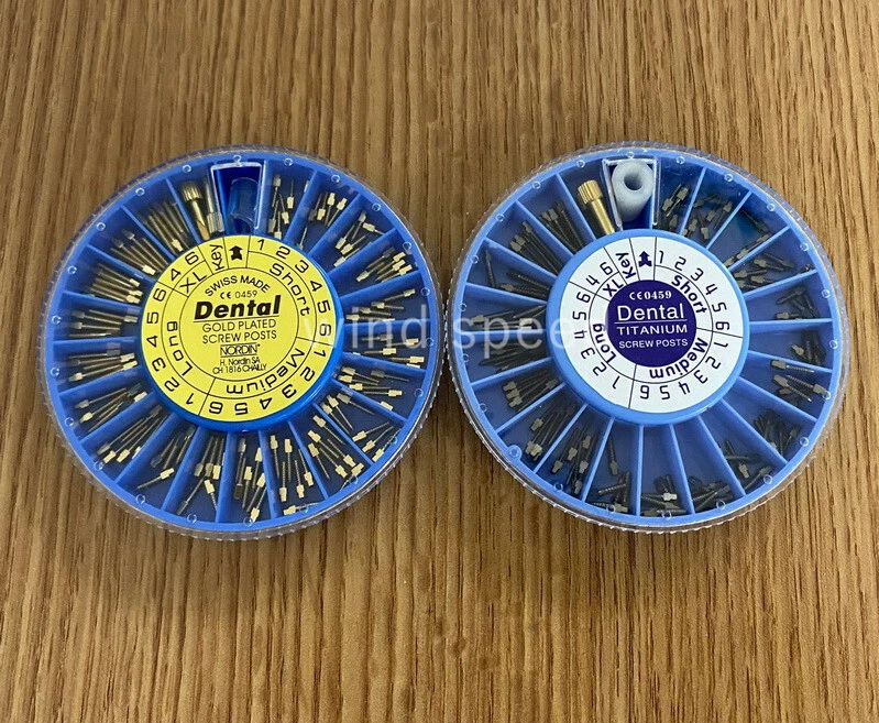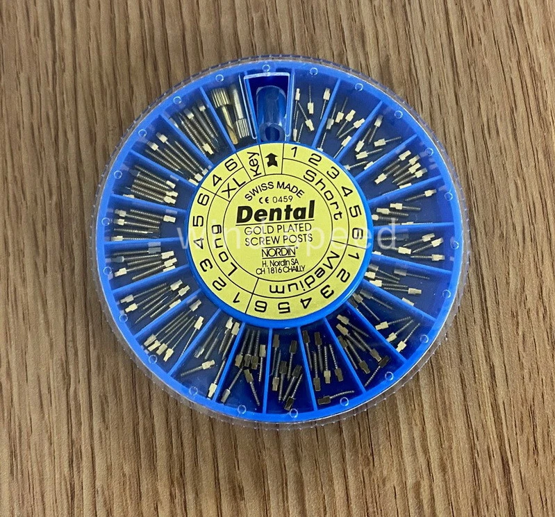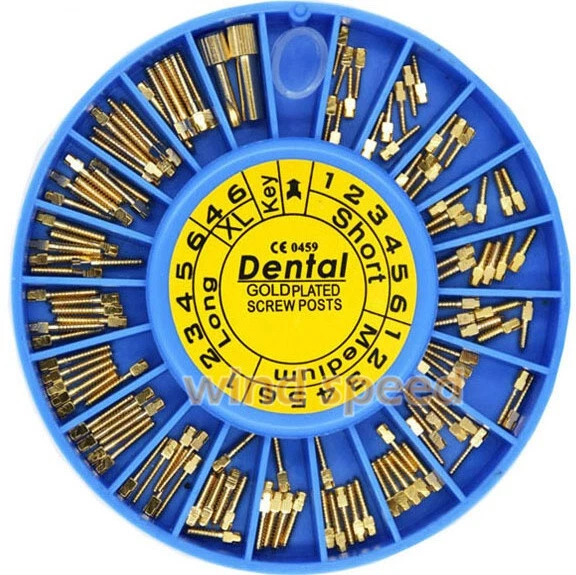 Packing: Short: 36Pcs Medium: 36Pcs Long: 36Pcs XL: 12Pcs Key:2Pcs Material: Titanium / Gold Plated/ Stainless Steel Used For Post-Core-Crown Restoration Usage: Use a reamer that will match the selected screw post. The root canal should be enlarged with the reamer and deepened to desired depth. Eccentric movement of reamer should be avoided. Using key, the post should be screwed into the root to check the length of the canal. When this is done remove the screw post. After cleaning and drying the root canal and the post, the post is dipped into cement and screwed home. A screw placed in the mesial and distal canals gives a good anchorage. Screw posts give this possibility, because of the good variation in sizes.