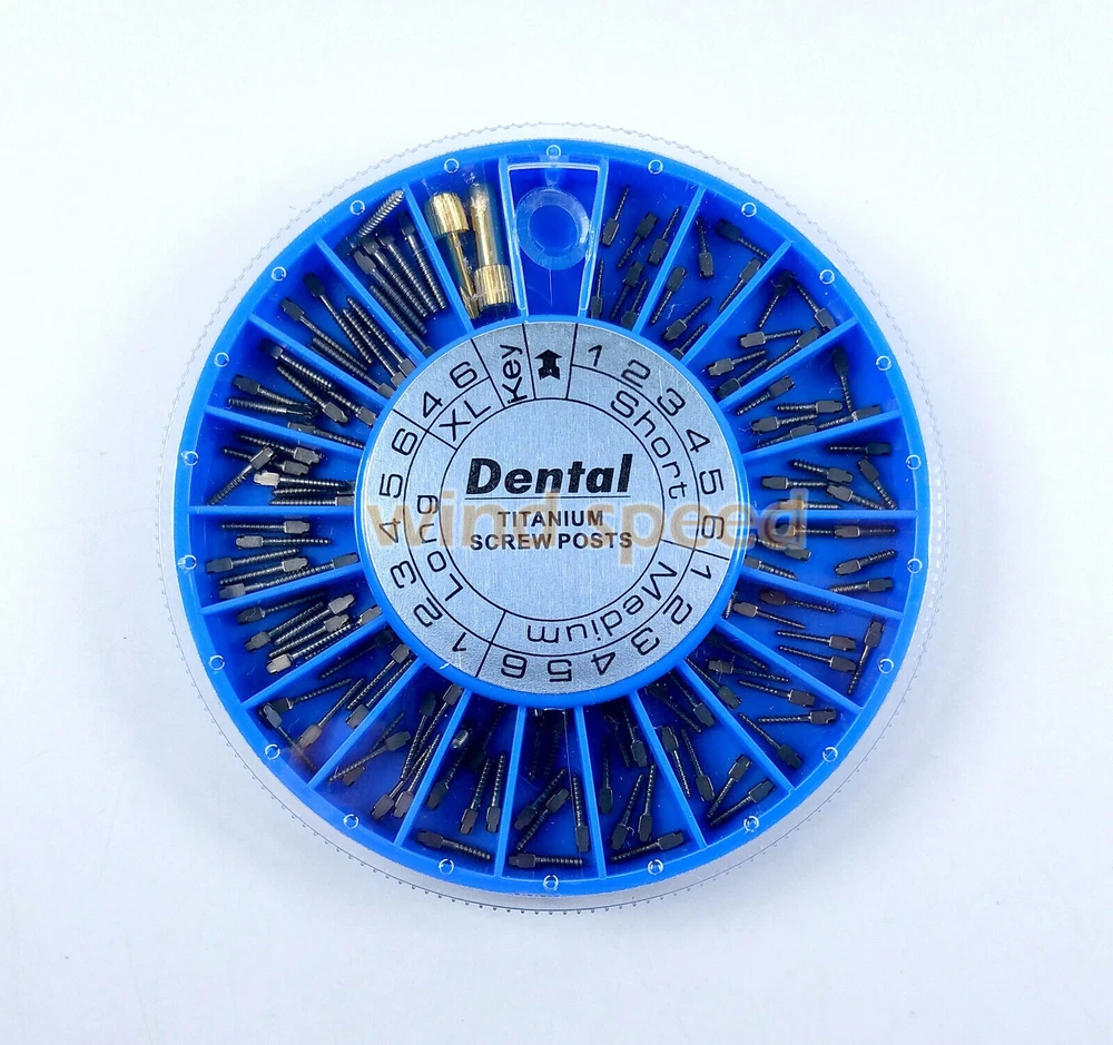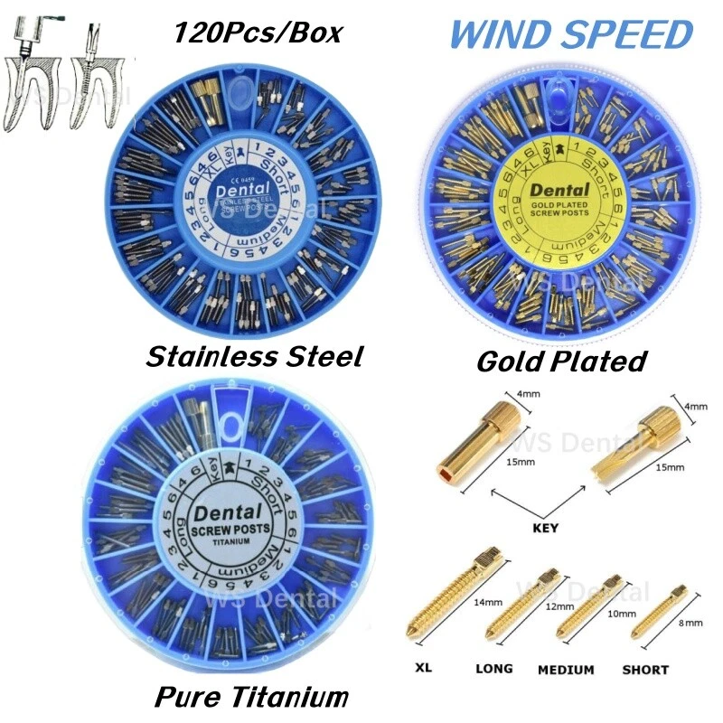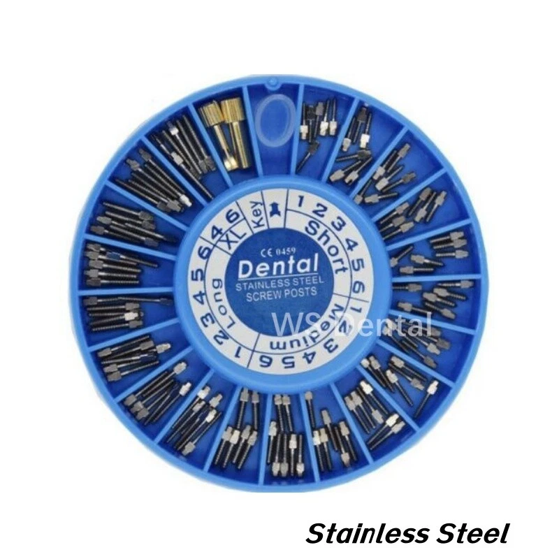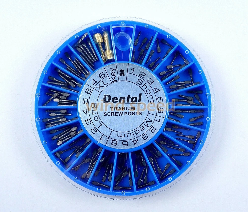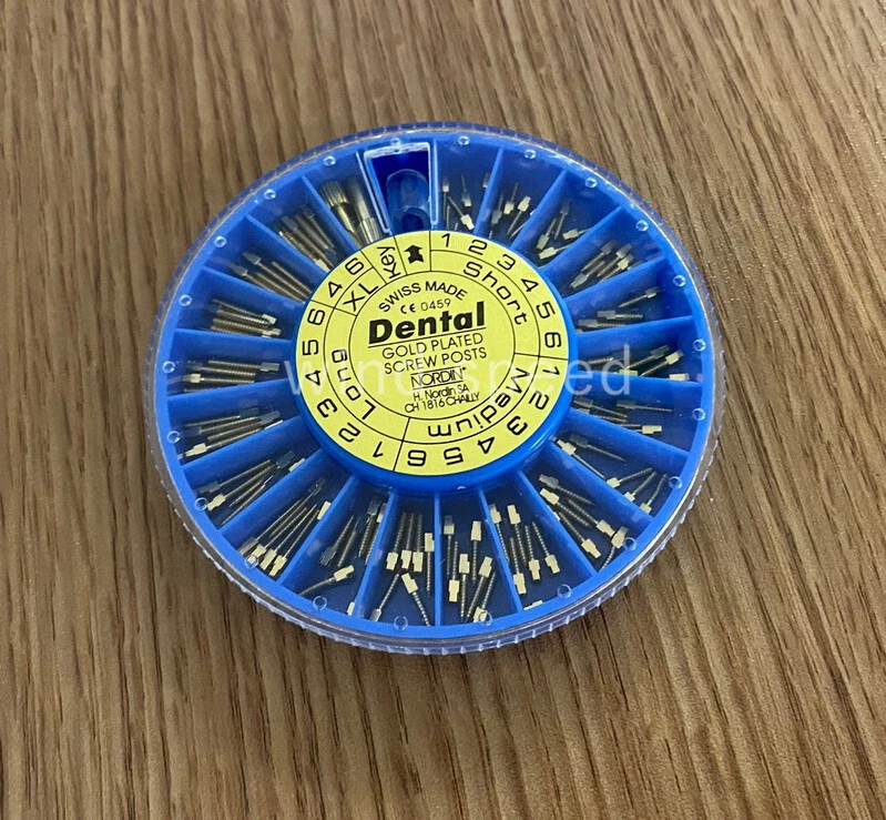 Packing: Short: 36Pcs Medium: 36Pcs Long: 36Pcs XL: 12Pcs Key:2Pcs Material: Titanium / Gold Plated/ Stainless Steel Used For Post-Core-Crown Restoration Usage: Use a reamer that will match the selected screw post. The root canal should be enlarged with the reamer and deepened to desired depth. Eccentric movement of reamer should be avoided. Using key, the post should be screwed into the root to check the length of the canal. When this is done remove the screw post. After cleaning and drying the root canal and the post, the post is dipped into cement and screwed home. A screw placed in the mesial and distal canals gives a good anchorage. Screw posts give this possibility, because of the good variation in sizes.