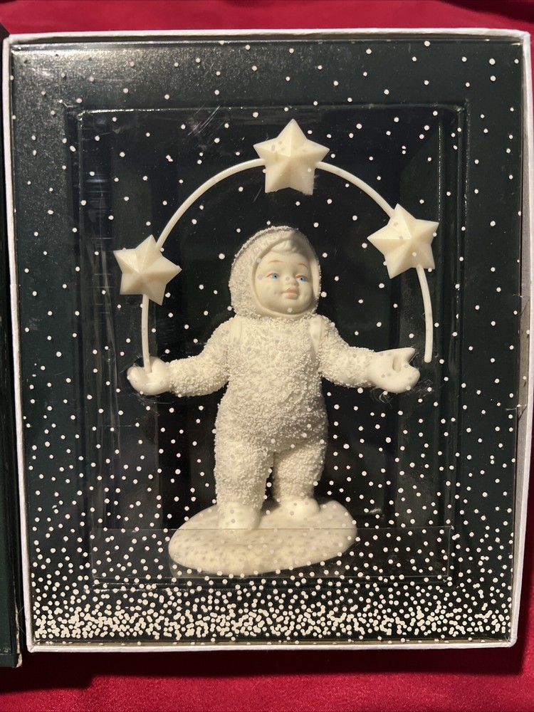 This Dept 56 Snowbabies figurine is a lovely addition to any holiday decor. The porcelain piece features a small, white figural snowbaby holding a gift box, with the words "Look What I Can Do" engraved on the front. It was manufactured in Taiwan in 1992 and is part of the Snowbabies collection. This figurine is suitable for adults and can be displayed on furniture or in a box. It does not require any additional parts and is ready to be enjoyed right out of the box. The plain pattern and original design make it a unique and timeless piece that can be cherished for years to come.