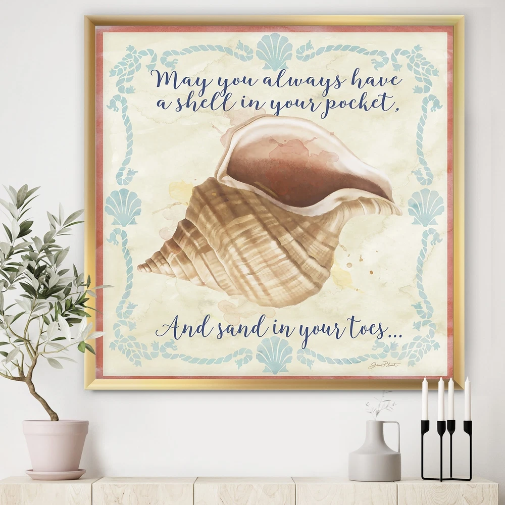 Amp up the coastal vibes in your home with this 'Sea Shells-B' art print from Designart. Featuring a large conch shell graphic bordered with delicate pieces of rope and seashells, this piece delivers a nautical look to tie together the other sea-themed elements in your space. A beach-themed quote completes the relaxed, welcoming feeling. Choose from a variety of frame colors to match your room's color palette, and rely on the included hardware for fast and convenient installation on any wall.This framed art print is available in many different color frames. All of our framed art prints are carefully packaged with corner protectors, fragile labeling, and sturdy boxes to ensure a safe delivery. Every framed art arrives ready to hang on the wall, with the hanging kit included.Features:Style : Free Shipping Over $49.99* Details Designart "Sea Shells-B" Nautical & Coastal Framed Art Print Product Description: Amp up the coastal vibes in your home with this 'Sea Shells-B' art print from Designart. Featuring a large conch shell graphic bordered with delicate pieces of rope and seashells, this piece delivers a nautical look to tie together the other sea-themed elements in your space. A beach-themed quote completes the relaxed, welcoming feeling. Choose from a variety of frame colors to match your room's color palette, and rely on the included hardware for fast and convenient installation on any wall. This framed art print is available in many different color frames. All of our framed art prints are carefully packaged with corner protectors, fragile labeling, and sturdy boxes to ensure a safe delivery. Every framed art arrives ready to hang on the wall, with the hanging kit included. Features: Style Nautical & Coastal Subject Animals Color Brown Premium quality cotton canvas mounted. Available in several frame colors. Arrives with instructions and hanging kit