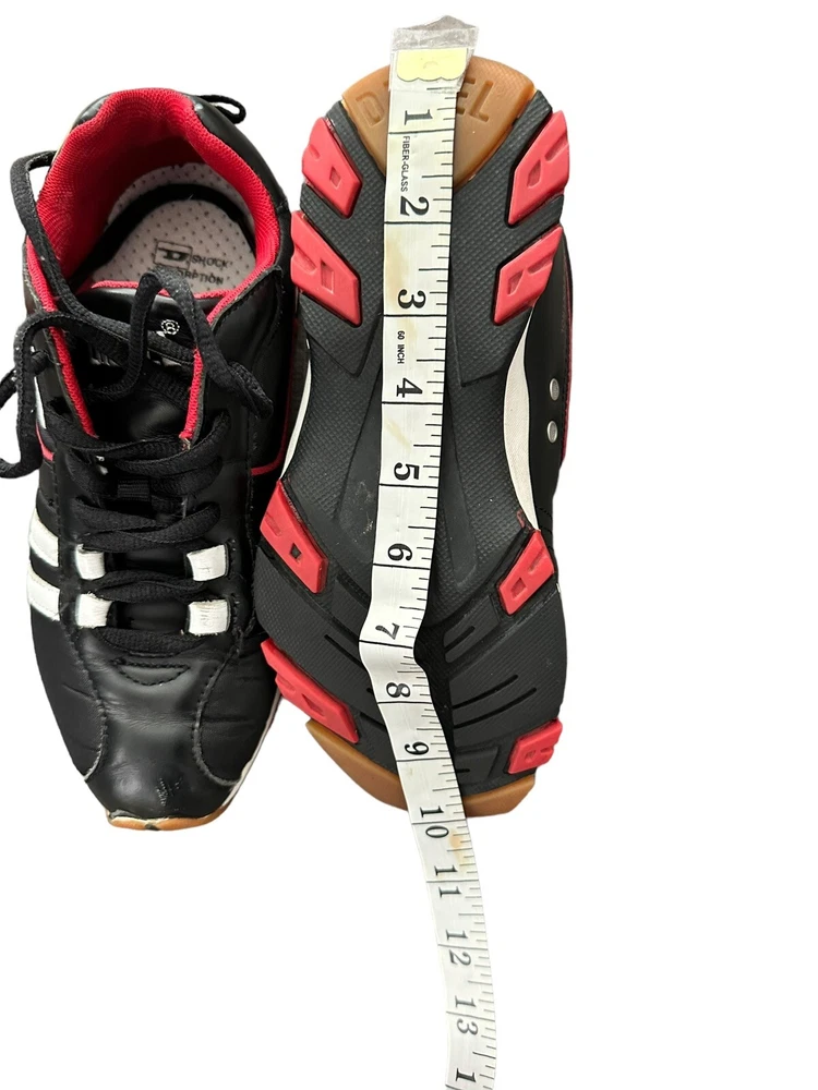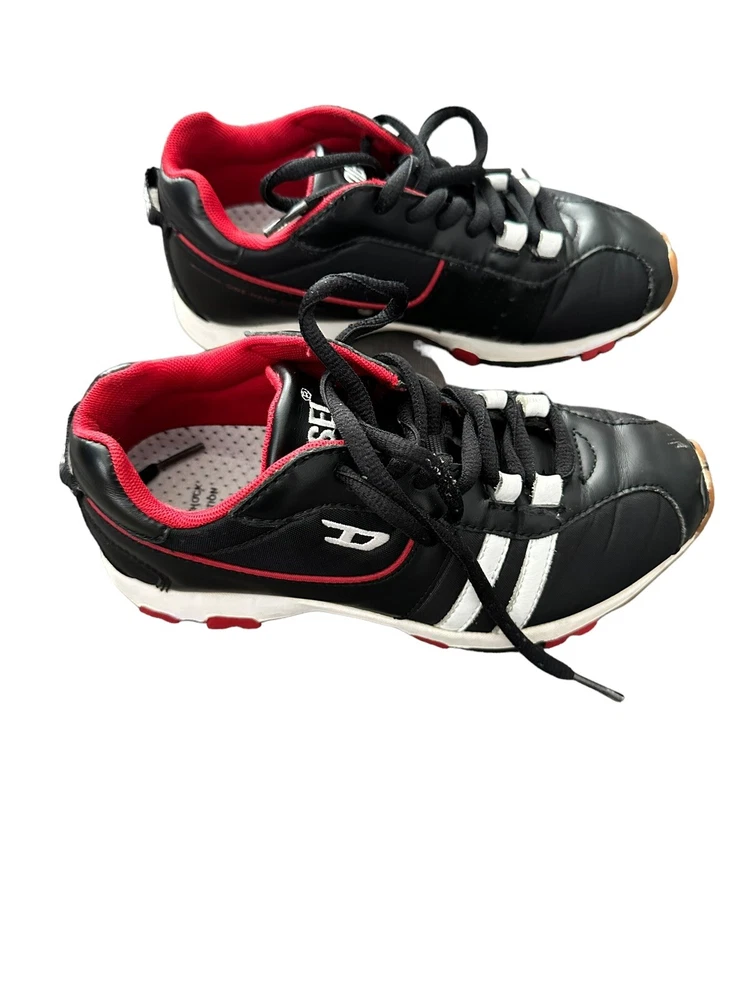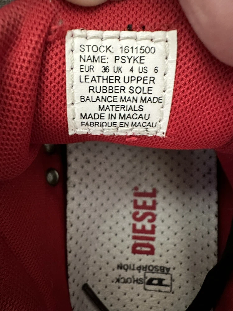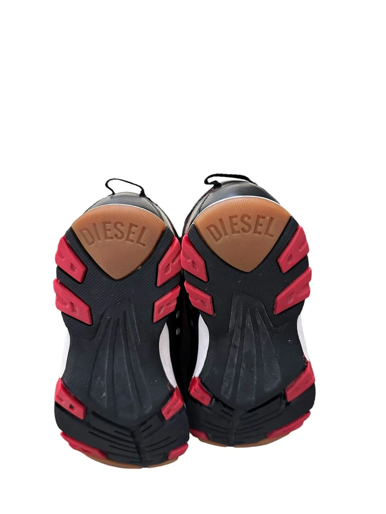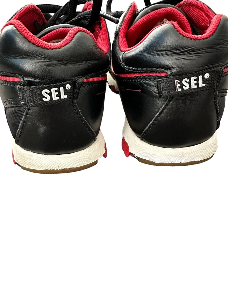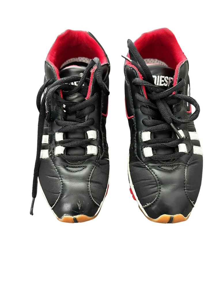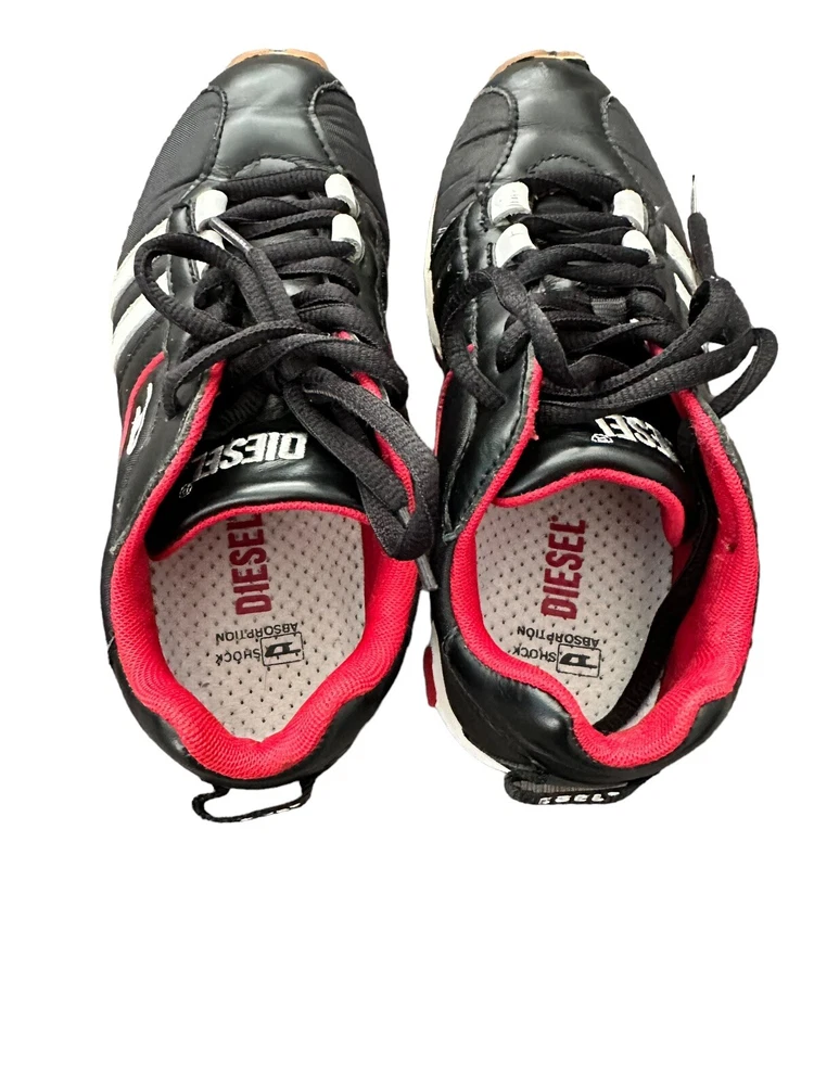 Diesel Designer Sneakers, ITALY Original Diesel, Cult Street Fashion, Fashion Shoes, Leather Sneakers, Model PSYKE, Stock 1611500 Art Décor, Avant-Garde Pre-Owned, used Condition, still with plenty of life, adding to characters and look, with box Black Leather Sneakers with 2 White Stripes and Diesel logo, Original Footwear, Rare Collectibles Fashionable Vintage clothing with characters, seasoned with style Yuppie Lifestyle, Pop Culture, Hip Hop, Rock Star, Cult Street Fashion ***white mark on right front top ***