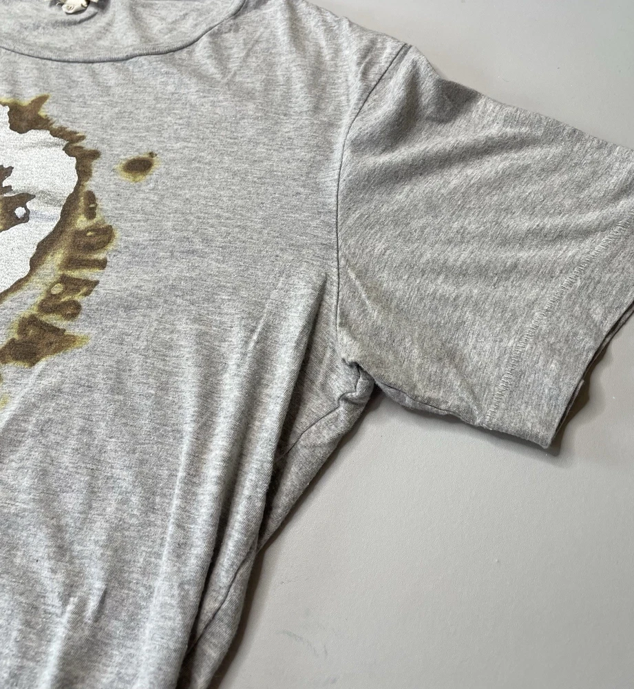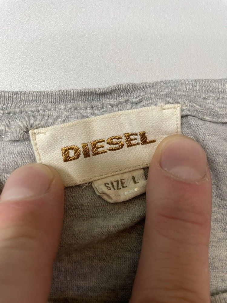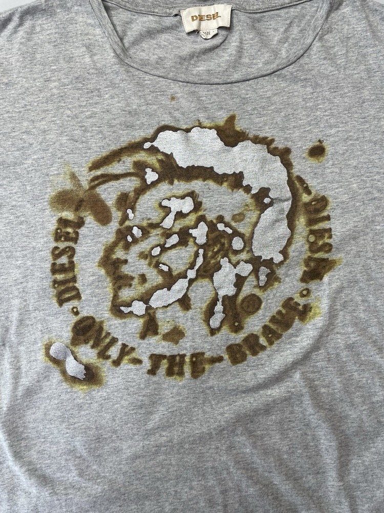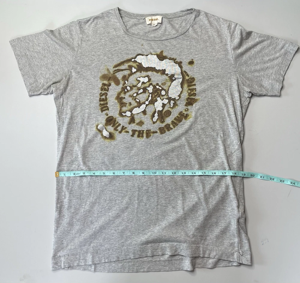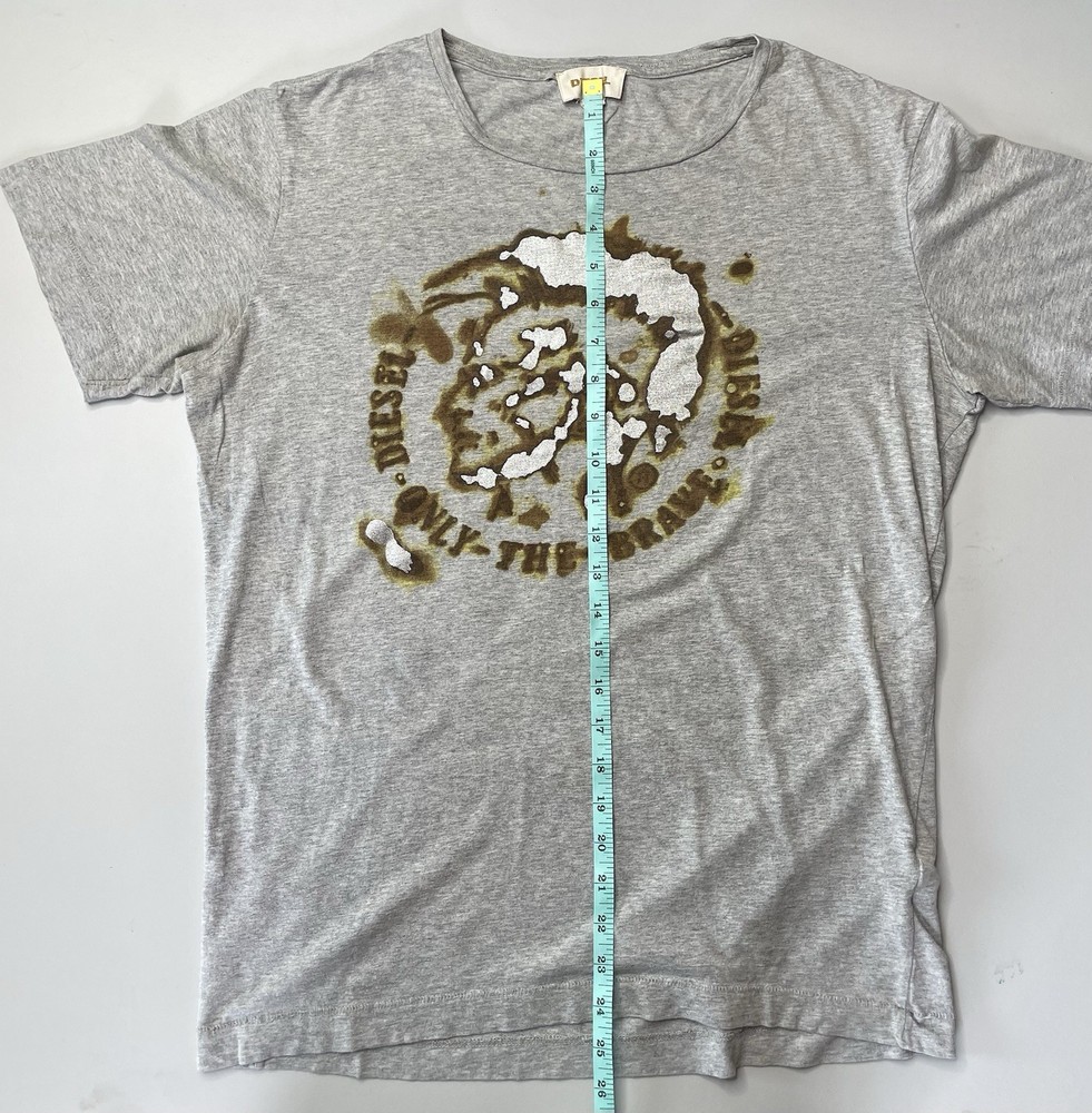 The Diesel Graphic T-Shirt for men in size L features a gray color with a distressed print, short sleeves, and a crew neck neckline. Made from cotton, this regular fit tee is machine washable and suitable for all seasons, particularly summer and spring. The Y2k and casual theme adds a stylish and trendy touch to the classic design, making it a versatile piece for everyday wear.