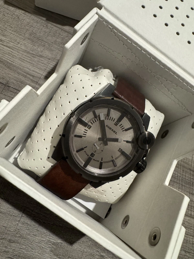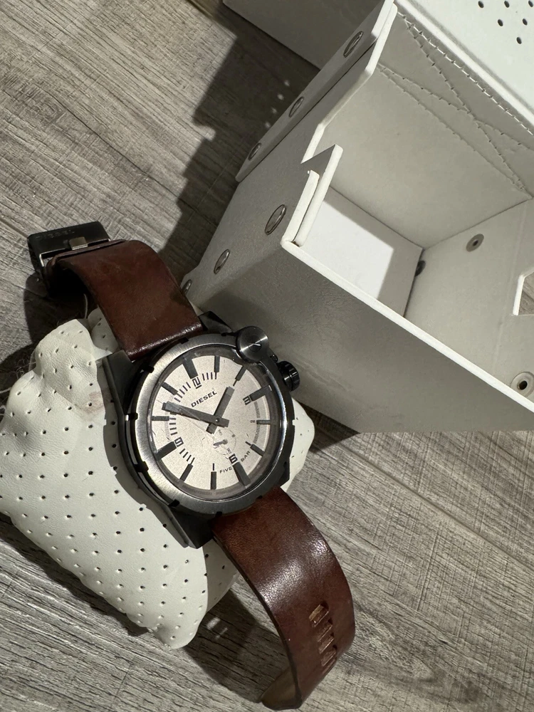 Normal wear. Leather band. Needs a new battery. Still have original box.