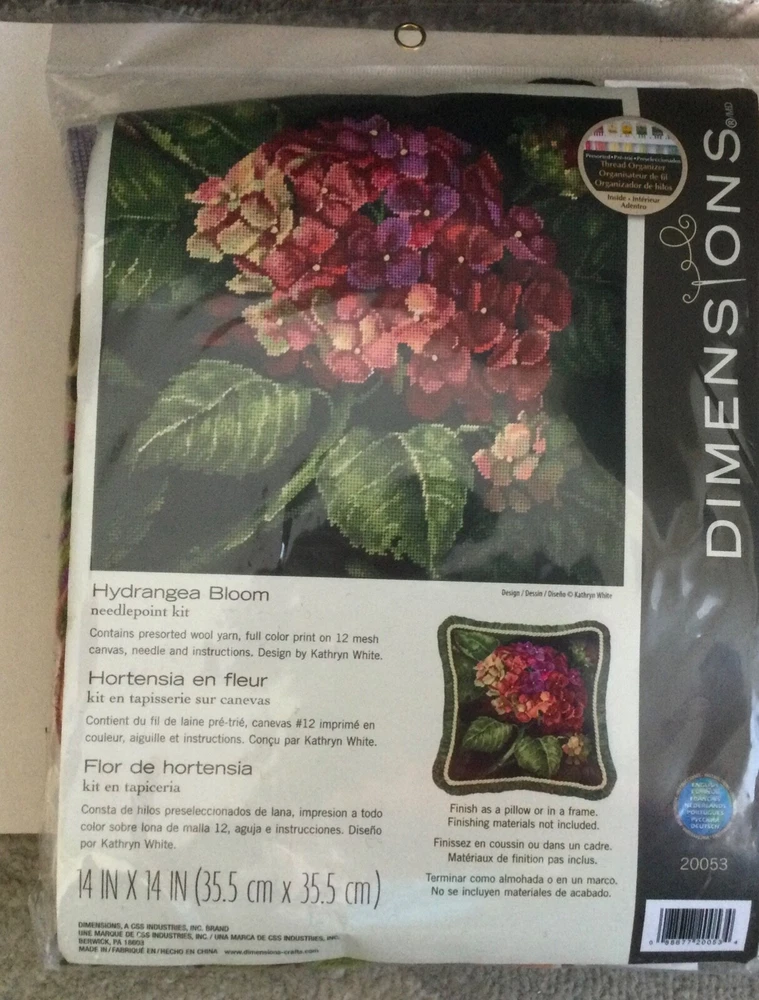What a beauty! This is a needlepoint kit by Dimensions……can be used as a pillow cover or just frame it! This beautiful hydrangea bloom will keep you thinking of Spring during this cold, snowy winter! Kit contains presort4ed wool yarn, full color print on 12 mesh canvas, needle and instructions. Finishing materials not included. Not sure of age….estate sale find. SEE PICS!