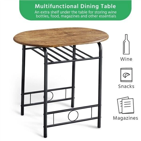 【Designed for Small Spaces】Measuring 31.5’’ L x 21’’ W, the oval tabletop is large enough for 1-2 people to dine, read or have a close chat cozily. The chairs perfectly fit the curving edges of the table, allowing you to entirely tuck them away when not in use to free up extra space for you. The space-saving design makes this set the perfect accent for compact spaces. 【Supportive & Firm】This kitchen table set includes 2 chairs with a mid-height backrest and round wooden seat. A curved slat backrest perfectly wraps your back and gives you strong body support. You can also add seat cushions to achieve a softer sitting experience. 【Extra Storage Rack】Fitted with a convenient rack under the tabletop, this breakfast table provides additional storage space for wine bottles, napkins and other essentials, or you can remove the shelf for extra leg room. The timeless color scheme and small dimensions make this set perfect for the kitchen, balcony, bedroom, apartment, dorm room, office, temporary activity & party, etc. 【Compact Size】Measuring 31.5’’ L x 21’’ W, the compact oval tabletop allows one or two people to dine, work, study, play cards or chat as wanted. The lightweight design makes this set easy to move around for your changing needs. It could perfectly fit into a small kitchen, dorm room, apartment or a corner of your house to create a cozy nook for dining or relaxation. 【Considerate Details】Rounded edges of the table reduce the risk of people hitting their bodies, making this 3-piece table set safe for all family members. Reinforced chair structure ensures a steady sitting experience. Packing List:
