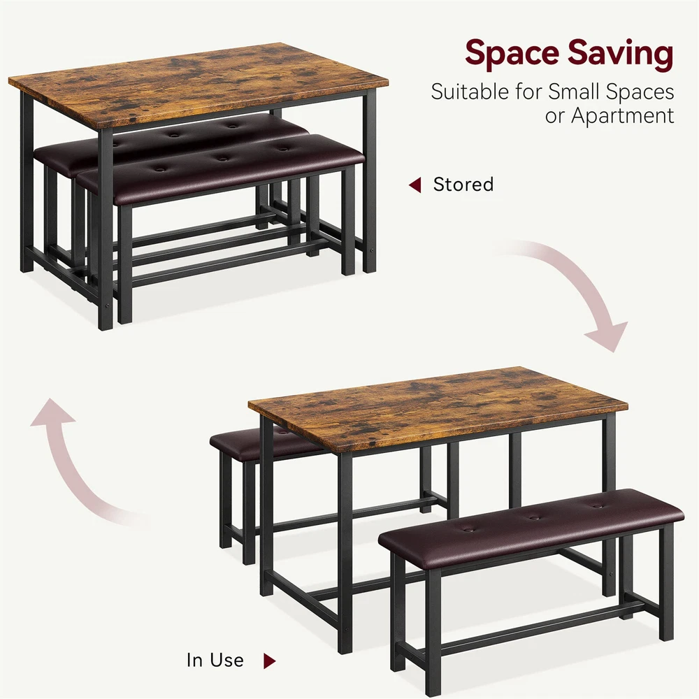 About this item COZY UPHOLSTERED BENCHES: This dining table set of 4 is made of premium MDF board and solid steel, which features a sturdy frame for a long lifespan. The use of metal pipes with a larger diameter makes the kitchen bench more stable and comfortable than other products. The Upgraded Dining Bench seats are padded with thick cushions, keeping you comfortable all dining time. More comfortable than a traditional wooden Bench. PREMIUM & STURDY CONSTRUCTION: This retro gray kitchen table set with a metal frame, which offers a longer service life and more excellent stability. With the premium thickening MDF Board top, the overall durability would be significantly increased. Protective steel plates have been added to the four corners of the desktop, making it more stable to use. The H-shaped frame of the base makes this kitchen bench and table more sturdy and durable. Bench load-bearing reaches 400 lbs. EASY TO MAINTAIN: The surface of the dining table set of 4 is a waterproof and anti-corrosive coating, you can easily wipe soup, sauce, and dust clean, and the surface will not be hurt, and is sturdy for long-term use. SPACE-SAVING DESIGN: 2 kitchen benches can be hidden under the kitchen table to save space and create a tidy atmosphere. It is an excellent solution for small spaces, such as condos, kitchens, studios, or apartments. EASY TO ASSEMBLE: All the assembly hardware and tools come with this dining table set. With illustrated instructions, this table and bench table dining set can be assembled within 40 min without effort. Dimensions: Table Size 44.49” L*27.59” W*29.59” H, Bench Size 38.59” L*10.69” W*18.59” H. Product Description Fancihabor Dining Table Set for 4, Kitchen Table with 2 Upholstered Benches, Rectangular Dining Room Table Set, 3 Piece Kitchen Table Set 1. A beautiful rustic kitchen table set for the living room, dining room, and kitchen, that will fit perfectly into a variety of décor styles.ral strength and durability. 2. A beautiful rustic kitchen table set for the living room, dining room, and kitchen, that will fit perfectly into a variety of décor styles. 3. Sturdy and Durable Frame: Constructed of high-grade MDF board and thickened steel frame and pipe wall, this small kitchen table with 2 benches is long-lasting and you can count on it to be a favorite for years to come. The seat panels of the chair can load over 400 lbs. Additional Steel Pipe, More Durable 2 Cozy Upholstered Seat Large Sturdy Tabletop Specification Color Retro Grey Weight 54.5 LBS Material Metal/MDF Board/Artificial Leather Dimensions Table Size 44.48” L*27.58” W*29.58” H, Bench Size 38.58” L*10.68” W*18.58” H. Max. Load Capacity Table 150 LBS / Bench 400 LBS Package Includes 1 x Dining Table, 2 x Benches, 1 x Instruction, 1 x Accessory Bag Payment Delivery details Terms of sales About us Contact us Payment We accept payment either via PayPal or any of the following credit cards; Visa, MasterCard, Discover, and American Express. Wishing you a happy life! Delivery details We will provide you with the tracking number on the same day or the next day, and transport your package through UPS, DHL, FedEx and other courier methods. If you have any questions, please feel free to contact me and I will do my best to help you solve the problem. Wishing you a happy life! Terms of sales We offer a one month free return and exchange service, and you don't have to bear any losses. We will provide multiple solutions for you to choose from. If you have any questions, please feel free to contact me and I will do my best to help you solve them. We offer a two-year warranty period. If you have any quality issues with the product you purchased within two years, please feel free to contact me. I will provide you with a free replacement service. If you have any questions, please feel free to contact me. I will do my best to help you solve the problem. Wishing you a happy life! About us We are committed to becoming the best eBay seller, with high-quality suppliers, providing the most sincere service, including pre-sales and after-sales service, to give you a satisfactory shopping experience. If you have any questions, please feel free to contact me, and I will do my best to help you solve the problem. Wishing you a happy life! Contact us If you encounter any problems, please contact me by email at the first time, I will provide you with a solution as fast as possible so that I can give you a satisfactory shopping experience, wish you a happy life! Brand Fancihabor Number of Items in Set 3 Set Includes Dining Table, Chairs Room Dining Room, Kitchen, Living Room Seating Capacity 4 Style Retro Item Weight ‎66.6 pounds Manufacturer Warranty 5 Years Item dimensions L x W x H 44.49 x 27.59 x 29.59 inches Material ‎Engineered Wood Mounting Freestanding