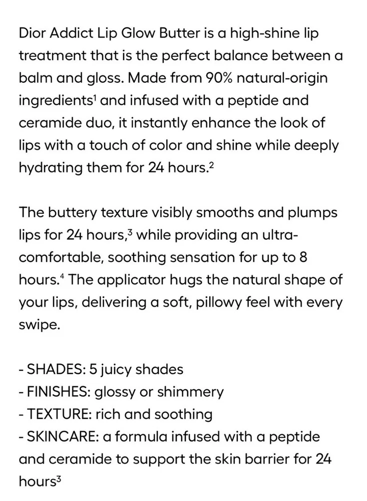 Authentic New 2025 Dior collection Includes original Dior pouch The peptide and ceramide duo supports the skin barrier and helps smooth and protect lips from external stressors. Cherry oil helps maintain hydration and gives a plumping effect. Made with 90% natural-origin ingredients.' HOW TO APPLY Wear Dior Addict Lip Glow Butter during the day as a hydrating lip balm-gloss that also adds subtle color to your lips. Apply a thick coat before bed to use as an overnight peptide lip treatment for deep hydration. Boost the feeling of hydration and get a "custom" color on your lips by applying over your Dior Addict Lip Glow balm Lightly tinted shades with a high shine and non-sticky finish - Gloss-balm hybrid formula that supports the skin barrier and hydrates for 24 hours' - Lips feel ultra-comfortable and soothed for 8 hours? 1 Instrumental test on 30 women. 2 Self-rating test on 30 women.