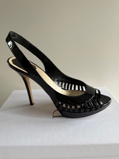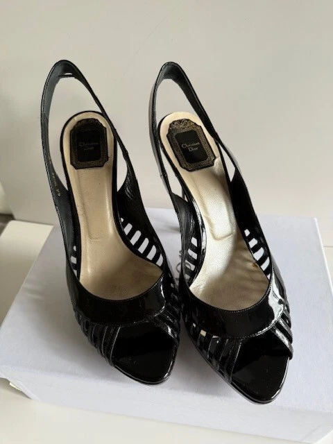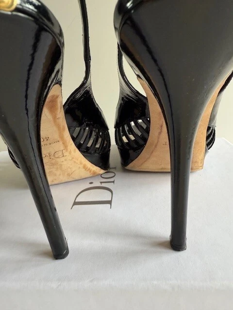Own a pair of $750 Designer Shoes for only $160!!! Dior Whisper Sling back Black Patent Leather Pumps Size 9.5 (40) w/ Box & 1 Bag! These are beautiful shoes, I always got compliments when I wore them. I wear anywhere from a 9 to a 10 depending on the designer. These shoes are very comfortable to me! See all pictures as the are part of the description. Contact me for any questions. They are in good used condition. Heels are 4.5" Front platform is .5" Smoke free home!