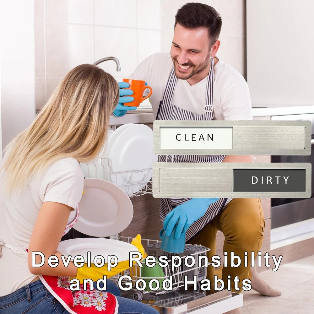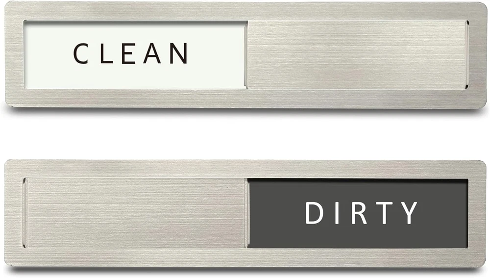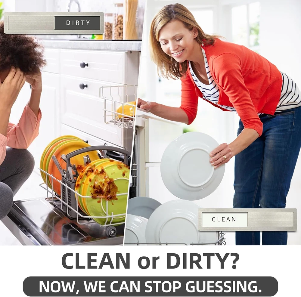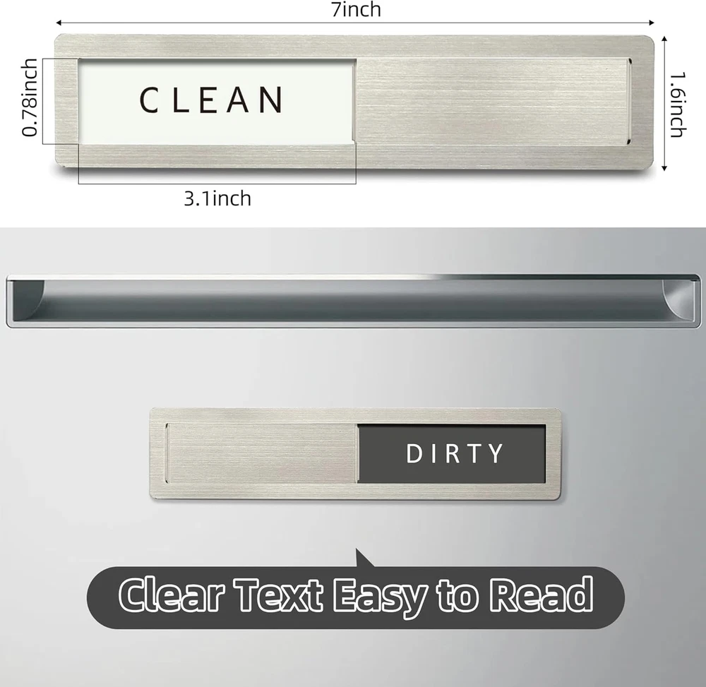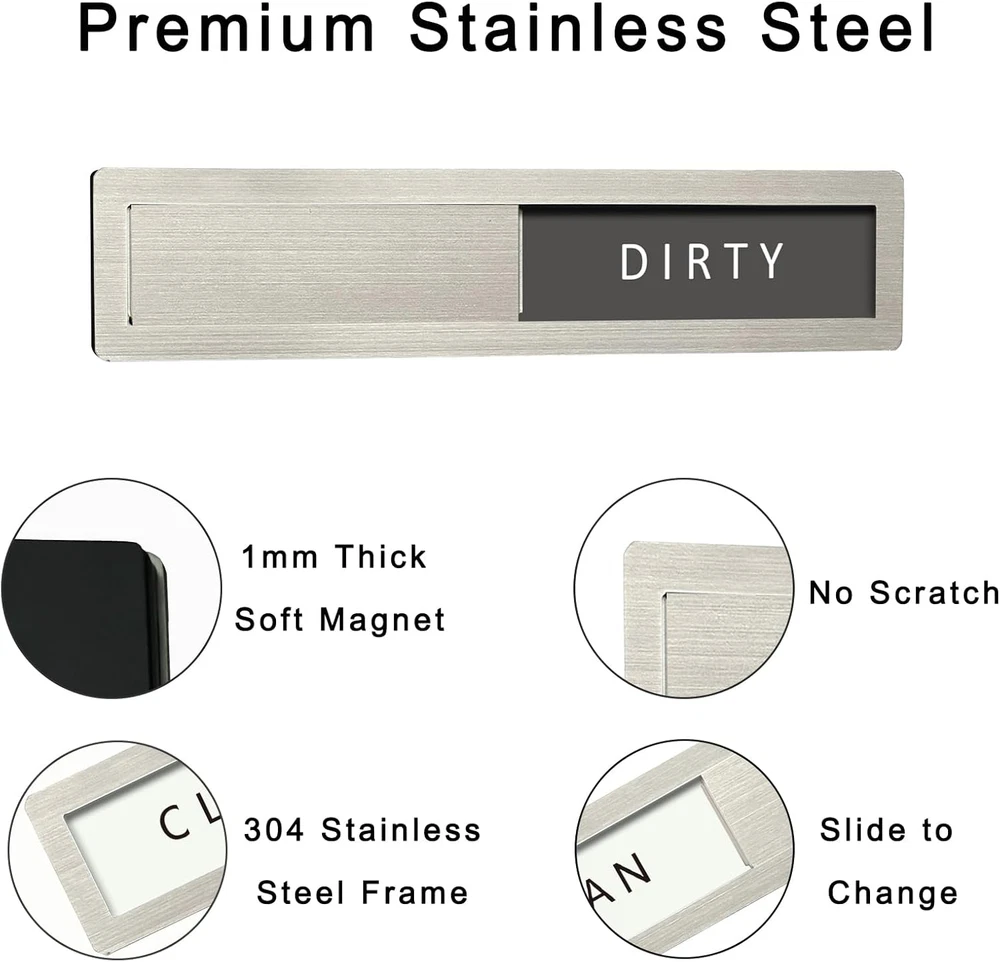 Dishwashing Made Easy: The dishwasher magnet is a great reminder tool. We can know whether the dishes are clean without opening the dishwasher, making it perfect for busy offices or homes. 'Is it dirty or clean?' Now, we can stop the guessing game High-Quality Stainless Steel: Dishwasher magnet clean dirty sign is made of 304-grade stainless steel, featuring high strength, corrosion resistance, ease of cleaning, resistance to deformation, and color retention. The stylish modern design perfectly complements your dishwasher, making it look like a part of the appliance Upgrated High-Quality: The Clean dirty magnet for dishwasher made with expert craftsmanship, the polished edges are smooth and free of burrs, both ends of the stainless steel slider have raised portions, making it easier to slide, strong magnet on the back for easy installation. The "CLEAN-DIRTY" sign has high-contrast colors for clear and easy readability Suitable For All Dishwashers: Size 7 "x 1.6". The dirty clean dishwasher magnet uses strong, scratch-free magnets that easily attach to the magnetic dishwasher door. If your dishwasher has a non-magnetic surface, please use two additional adhesive stickers Unique Gift Ideas: Dishwasher clean dirty sign is an essential item for every kitchen and makes a great gift for Christmas, Mother's Day, housewarming, and weddings. It is an excellent tool for cultivating good habits and promoting a harmonious family atmosphere. Our magnet packaging is modern and stylish, making it the perfect gift for family, friends, and colleagues Maintenance: Please remove this sign weekly and clean the back magnet with a clean cloth (included with the product) to prevent the accumulation of kitchen water stains and oil stains from affecting the product's lifespan Product Description Why every kitchen needs it? It's a simple visual aid to answer the age old question: Are the dishes in the dishwasher dirty or clean? Is this dishwasher magnet suitable for all dishwashers? Yes, the magnets adhere firmly to the metal dishwasher surface, extra self-adhesive stickers is included in the package for you to use on any non-magnetic dishwasher surface. Will it leave marks or damage my dishwasher? No, the non-scratch design ensures that the magnet will not leave marks or cause any damage to the surface of your dishwasher. Is it good quality? The premium 304 stainless steel frame and acrylic lettering are waterproof and durable, 1 mm thick soft magnet is magnetically strong, great quality and nice looking. How to maintain it? Remove this sign weekly and clean the magnet with a clean cloth (included with the product) to prevent the accumulation of kitchen water stains and oil stains.