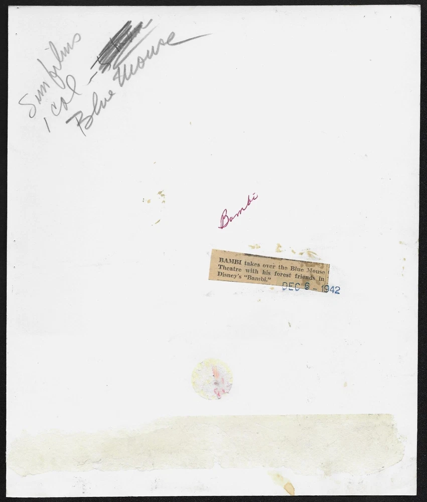 Disney Animation Bambi Original 1942 First Release Promo Photo 105750 Item Original Movie Studio Promo Photo Featured ~ Title Bambi Issued by Walt Disney Productions Year Printed/Issued 1942 for the first release of the film Photo Stock glossy Size 7 1/4 x 8 3/4 (inches) Condition • trimmed ~ a few light impressions • In addition to the above description please use the "zoom" feature to see the condition of the photo if you wish to see the photo in minute detail. • The photos offered by Starlight were intended for or actually used for publication and/or theater display, giving them added value, significance and validity. Notes ~ photo was used for publication and has a publication archive date stamp on back along with content/publication notes, a publication spec sheet remnant and a clipping for which the photo was used Guarantee This is the real thing--a rare, original promotional photo/still. "Original" means this is the actual item that was printed in the year cited above and distributed by a movie studio, television network or agency to theaters and/or the media for promotion. It is not a reprint. Most of our photos are so rare that you may rarely if ever see them on eBay again. Promo photos are limited editions as only a small number were printed to promote the artist or production. To be truly collectible a photo/still must be an original. When you buy from Starlight you can be assured that you are buying a genuine, professionally authenticated, original still photo. We have over 30 years of experience authenticating entertainment memorabilia and review each item to make sure it is an original. In addition to their value as collectibles and investments, original photos make unique gifts which can be tailored to a specific interest. They also make great wall décor for your home, office or media room. Photos are guaranteed authentic for the life of the photo. As collectors ourselves we understand the importance of receiving an item promptly, in the condition stated and securely packaged. We stand behind our products and service 100%, and offer an unconditional money-back return policy on our items. We combine shipping on items purchased within a 14-day period. Please check our other auction and store items. Thanks for your business and please come back often. ~ Starlight Collectibles ~ eBay user ID: starlight-collect • Own a Rare Piece of Hollywood History! • Original Vintage Movie, Music and TV Memorabilia • Authenticity Guaranteed for the Life of the Item • We Combine Shipping • Please Check Our Store Items and Weekly Auctions