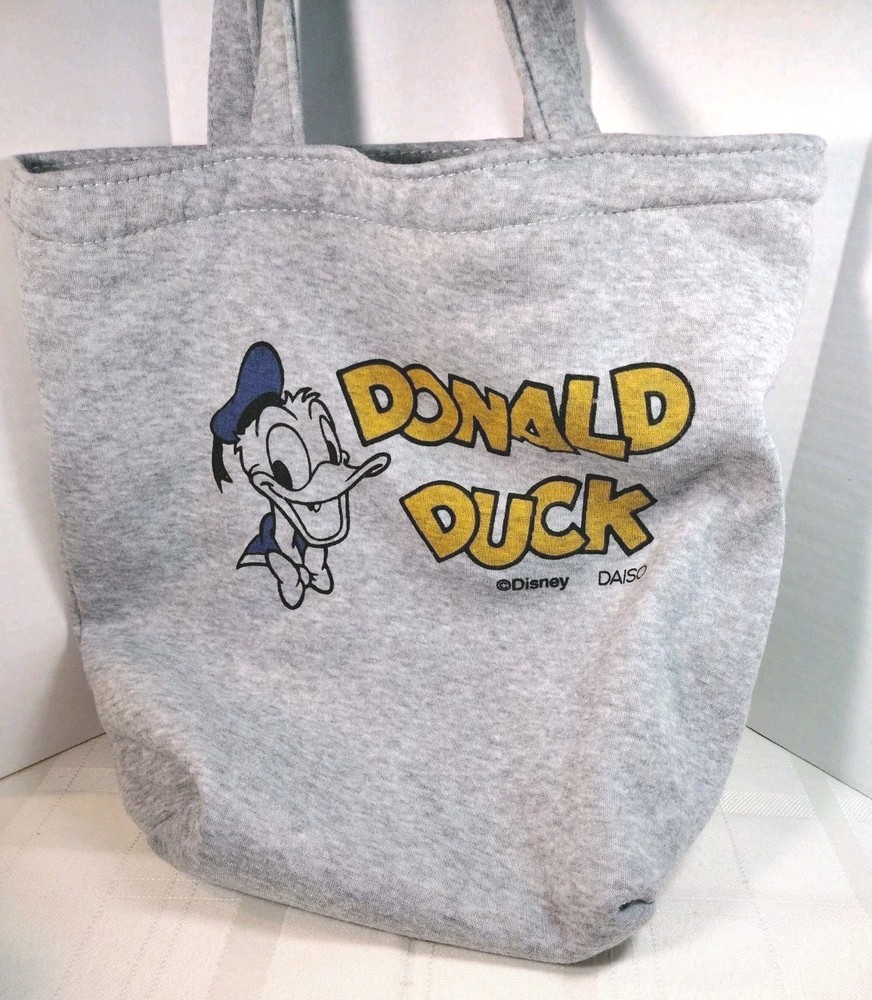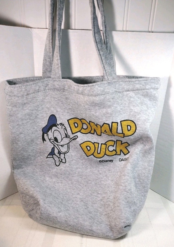 Nice Donald Duck Disney bag can be used in many different ways for lunches to take to work picnics could be used as a purse gray nice fabric like sweatshirt fabric and insulation in the inside like if you put lunch in it or a cold drink no stains great condition just washed measures 13 inches plus another 7 inches for the Straps . 13 inches wide